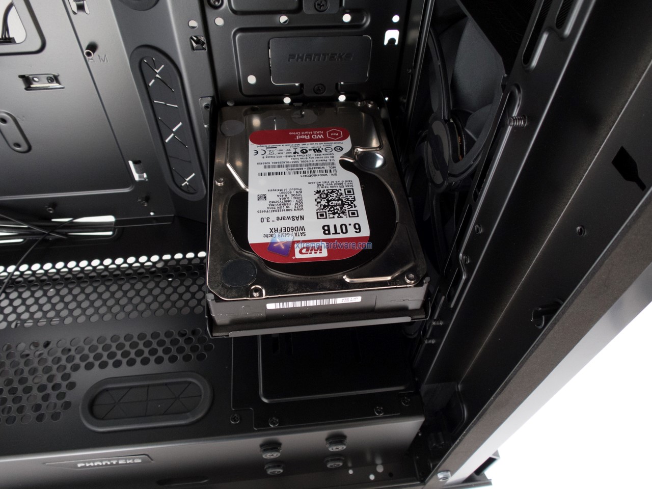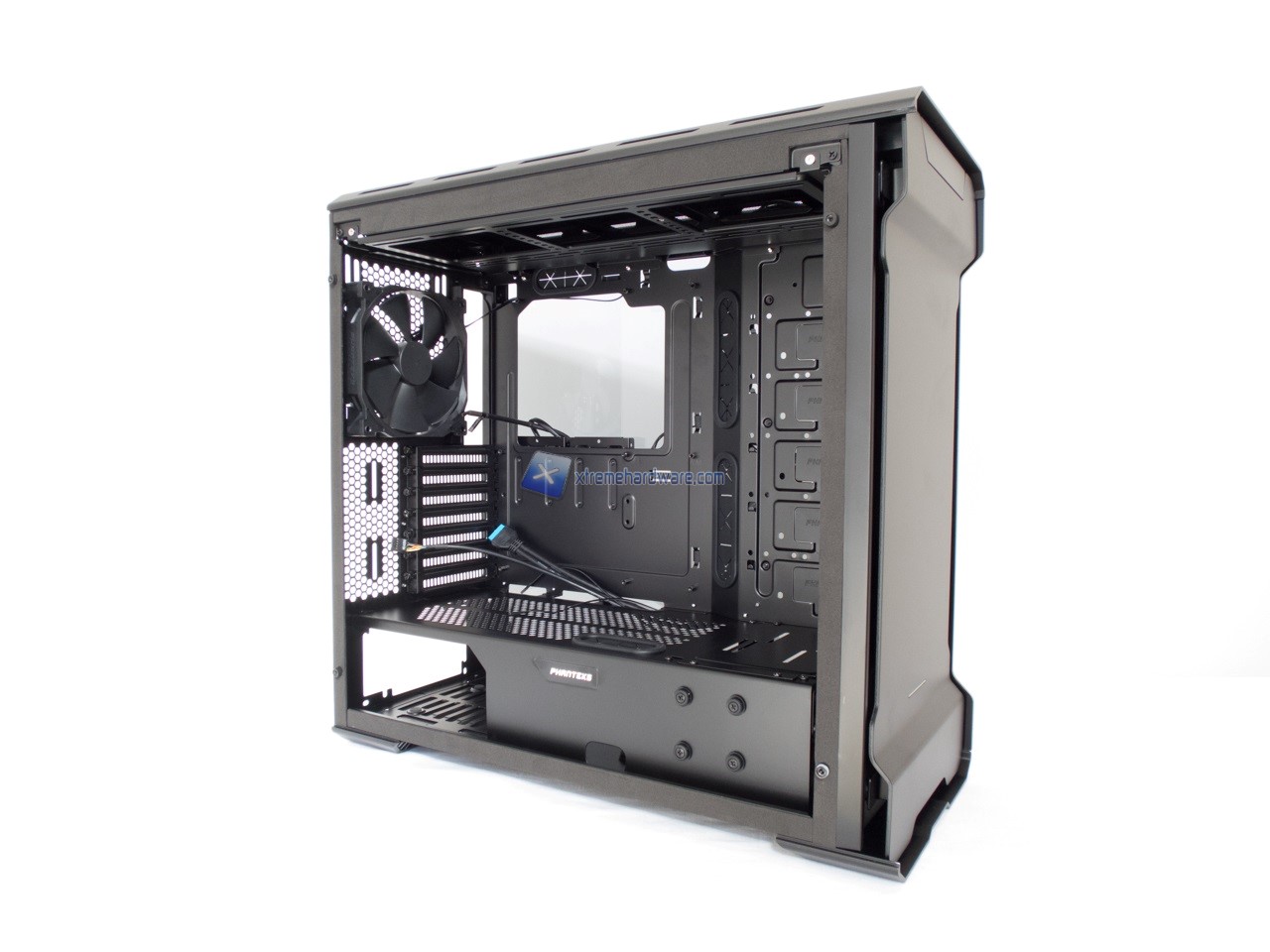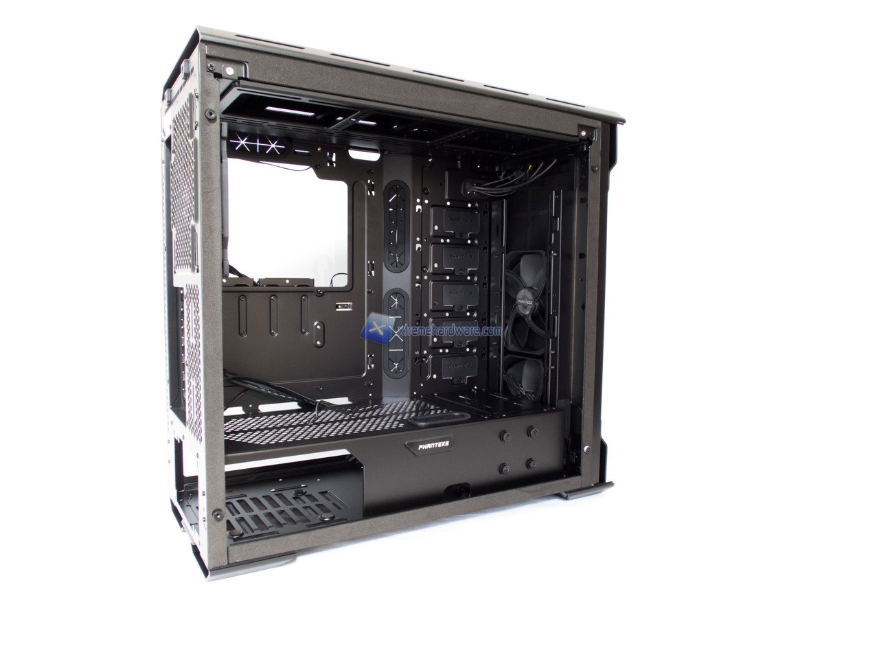 Rimossi con la dovuta attenzione i due pannelli in Vetro Temperato possiamo passare ad analizzare l’interno dell’Evolv ATX TG. Inutile dire che lo spazio è il medesimo del precedente modelli e dunque avremo spazio a sufficienza per installare tutti i nostri componenti e avere un adeguato ricircolo di aria anche grazie alle tre ventole preinstallate da 140 della serie SP Premium di Phanteks.