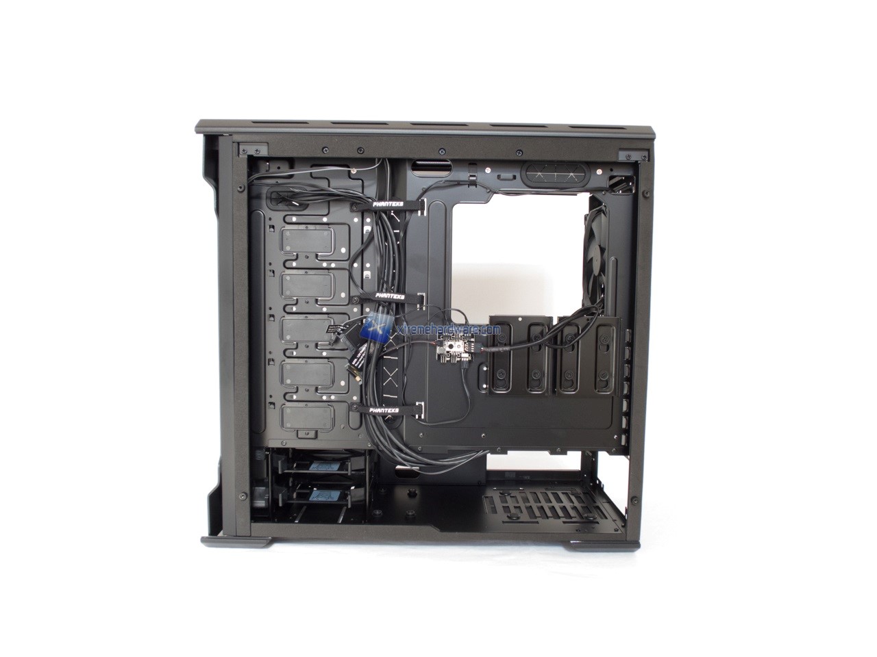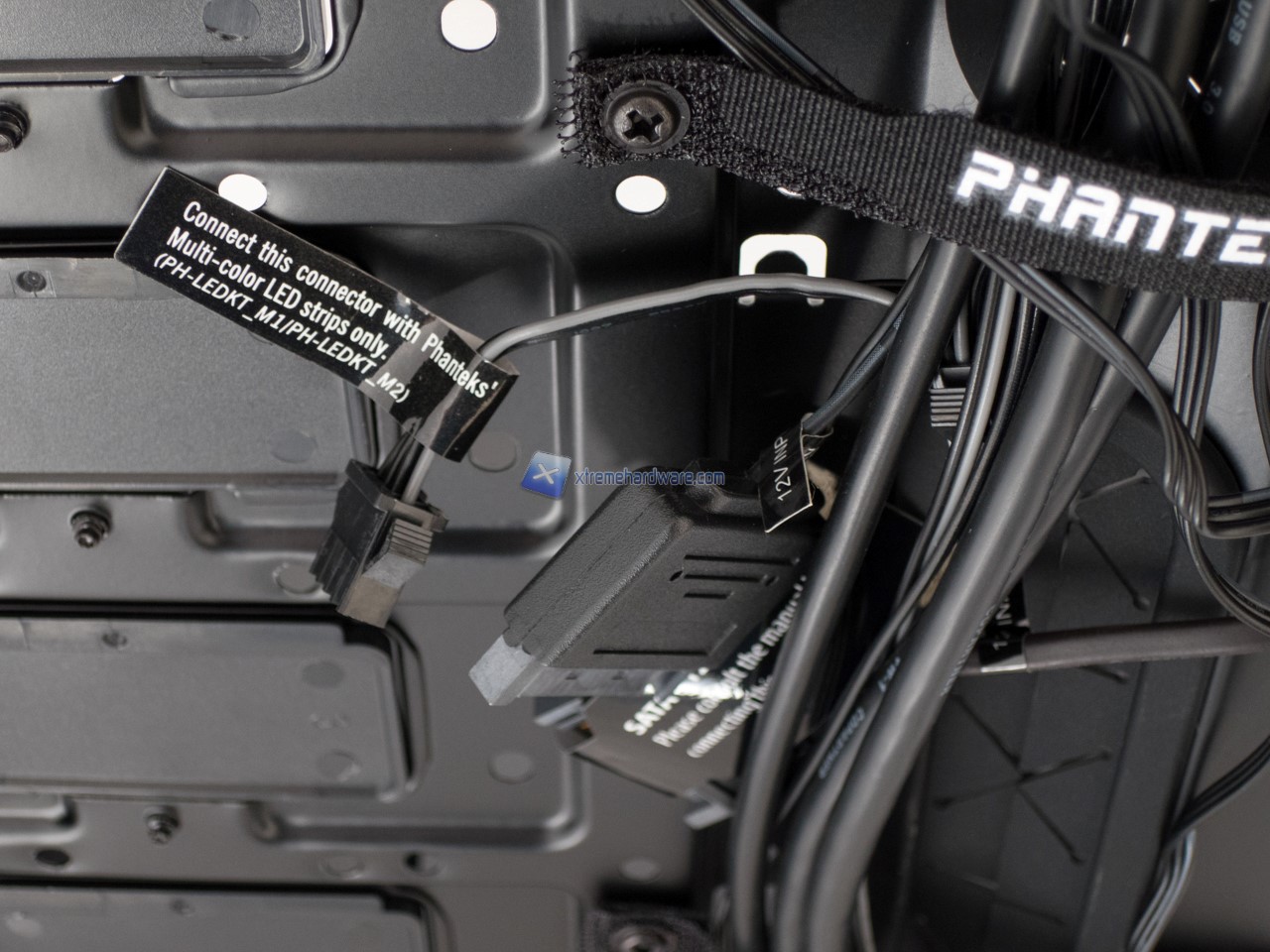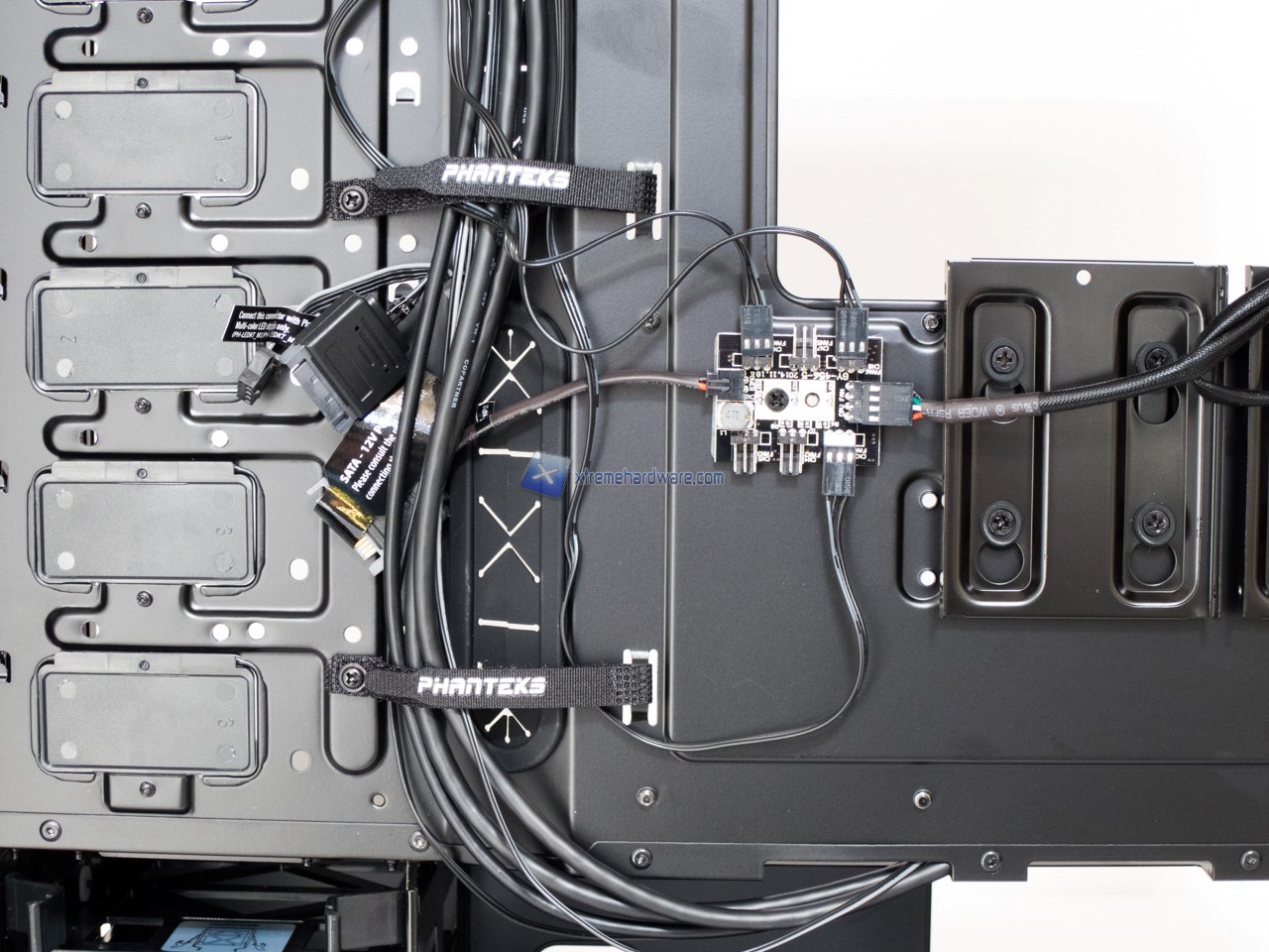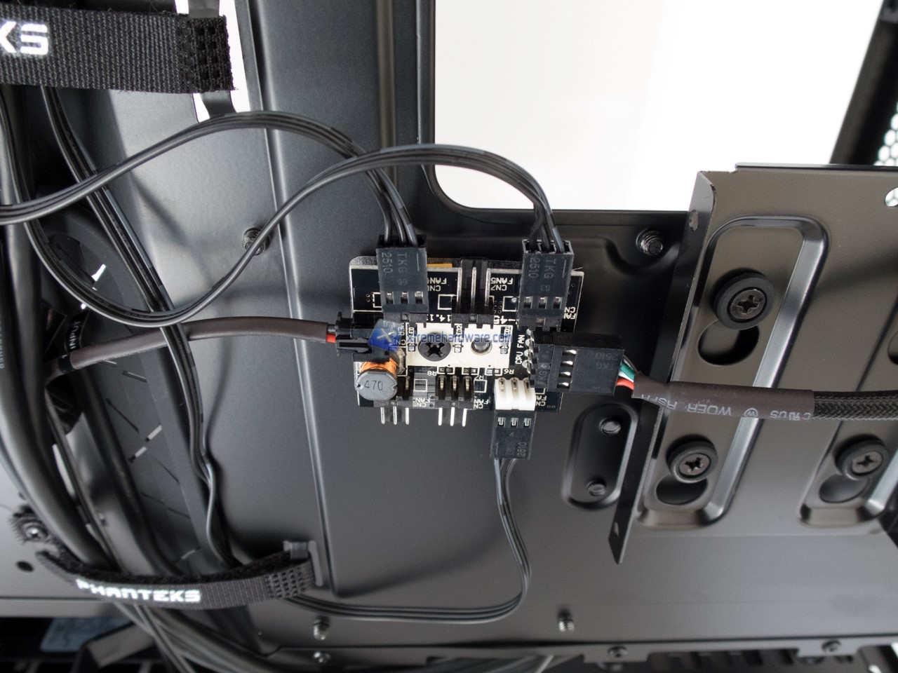 Portando lo sguardo verso il centro troviamo i diversi cavi delle porte del frontale con le classiche fascette in velcro Phanteks per il cablaggio oltre a i due supporti per SSD e al controller HUB PWM per ventole.