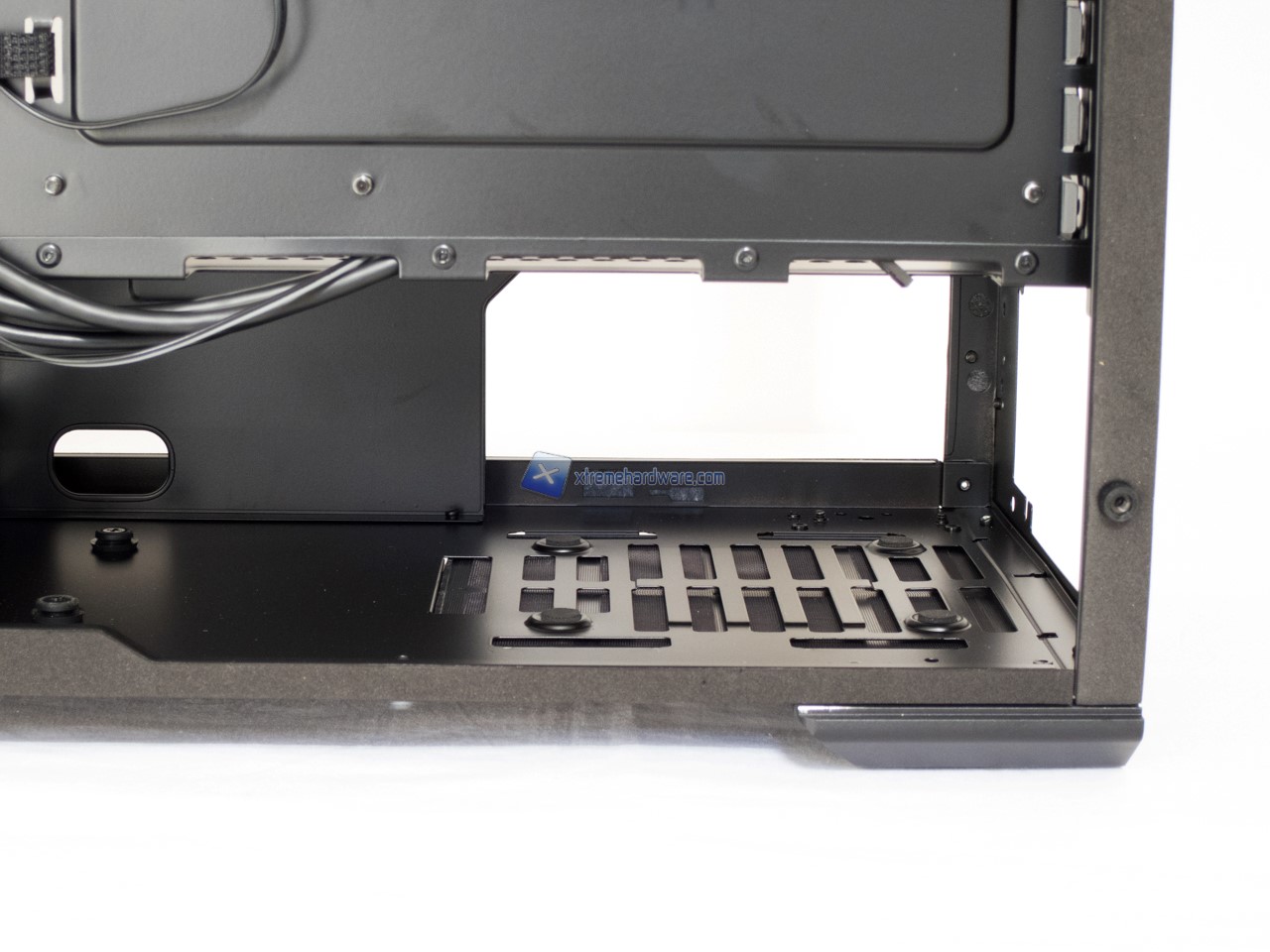 Ci spostiamo ora nel retro del case. Partiamo dalla zona inferiore dove troviamo il Cage per due Hard Disk da 3,5’’ (removibile) e nel lato destro lo spazio adibito all’alimentatore e relativi cavi.