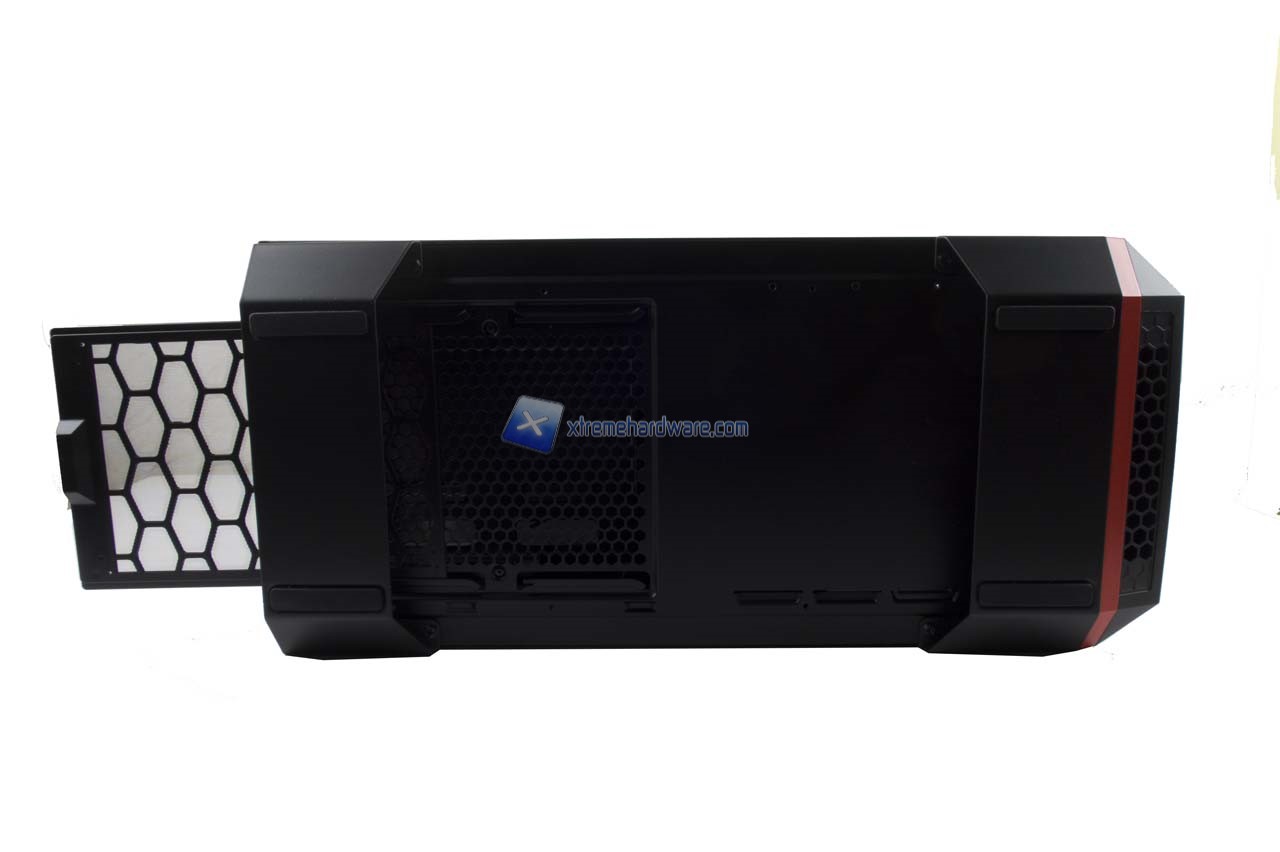 Passiamo ora al lato inferiore del Cooler MasterCase Maker 5 MSI Dragon Edition. Come si rispetti la linea MasterCase Maker e Pro adotta dei supporti in plastica di generose dimensioni a mò di piedini e supporti stabilizzanti per la struttura del case stesso. Sono presenti comunque strisce di gomma a fungere da piedini addizionali per garantire la massima stabilità sulla superficie di appoggio.