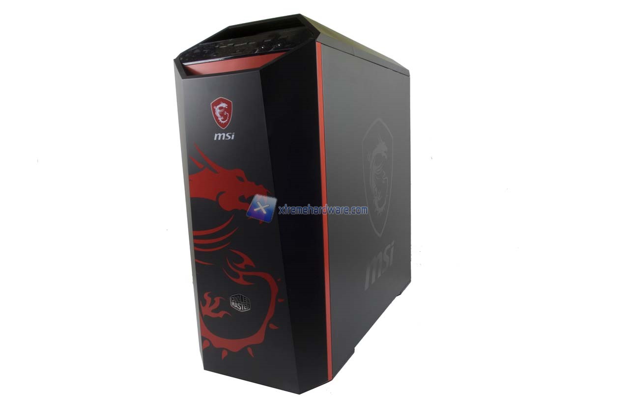 Partendo come di consueto dal pannello frontale possiamo osservare meglio l’immagine logo e relativo badge logo MSI che subito risaltano. Insieme a questi non manca il logo Cooler Master.