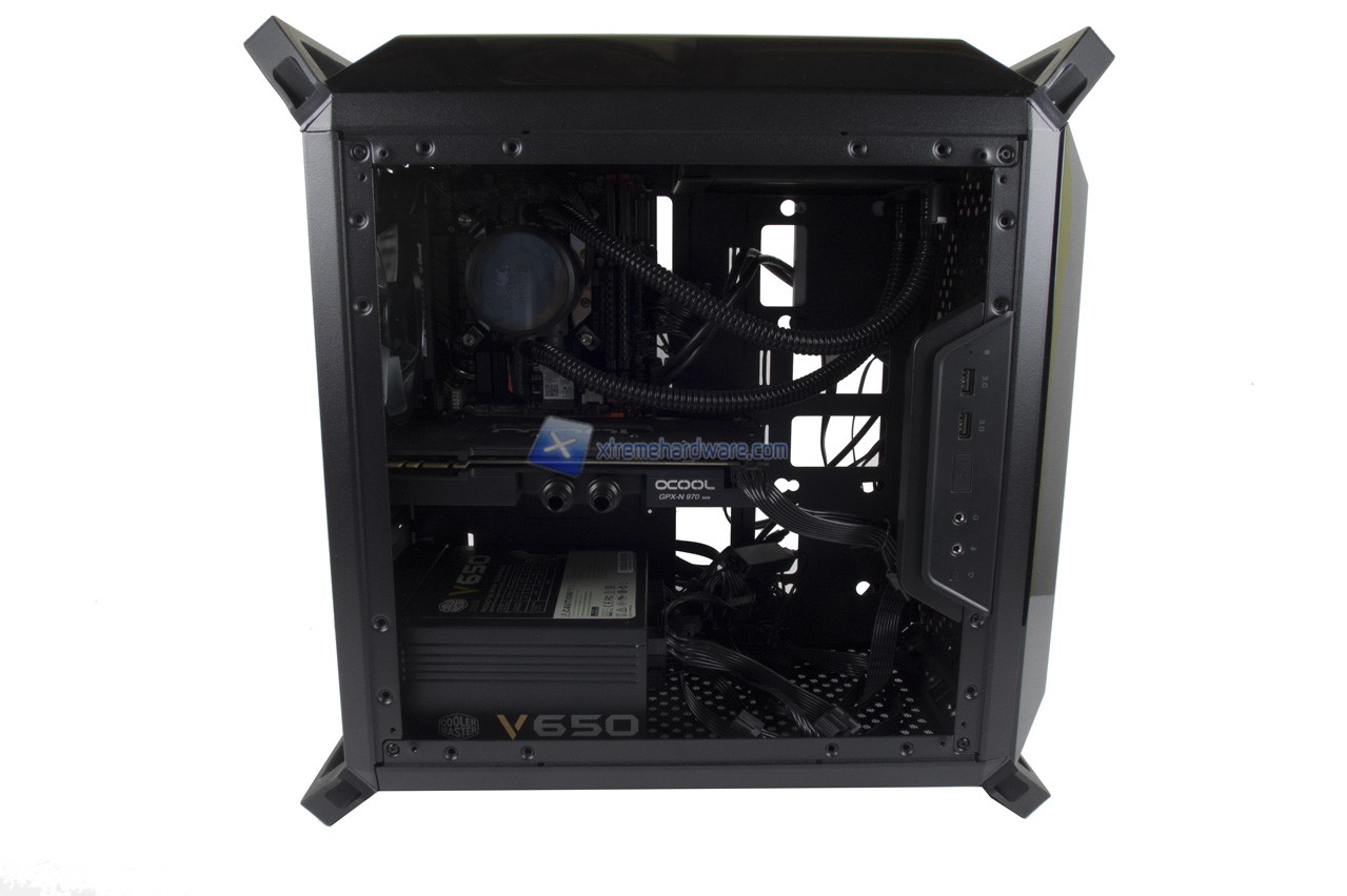 L’installazione nel Cooler Master MasterBox Q300P è stata abbastanza veloce e priva di problemi. Abbiamo scelto una configurazione con scheda madre in formato Mini-ITX per ottimizzare maggiormente gli spazi. I fori a contorno della scheda madre permettono un buon cablaggio anche se l’occultamento visivo è limitato. La disposizione degli SSD facilita l’ordine nel lato frontale ove andranno scheda madre, scheda video e eventuale dissipatore aria o liquido. Non avendo un Midplate, soluzione quasi ‘’impossibile’’ in un case di questo genere, i cavi saranno in bella vista anche se il pannello in plexyglass fumè ne occulterà buona parte a livello visivo anche se vi è illuminazione data dalle ventole frontali e/o altri LED interni.