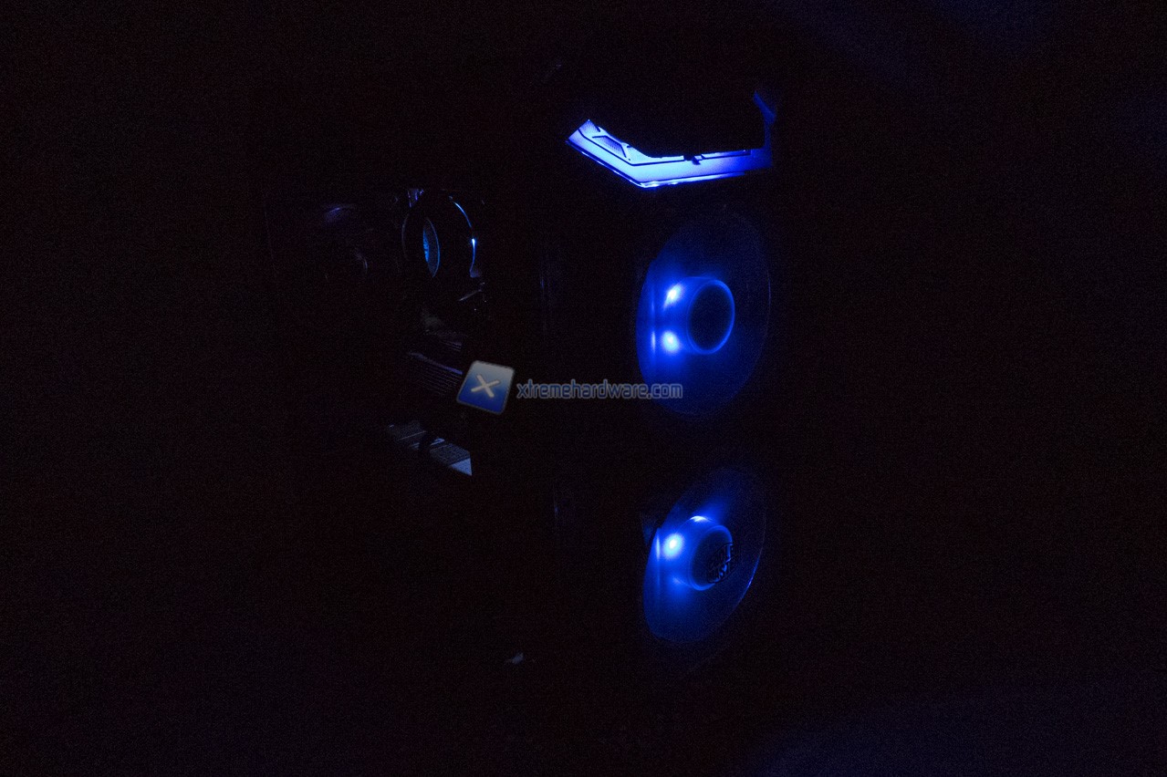 Vi lasciamo anche a qualche scatto della retroilluminazione RGB delle ventole. Ventole controllabili tramite controller incluso nel bundle con connettore SATA o eventualmente gestibili anche da software proprietario della scheda madre una volta collegato il cavo del pannello I/O. Cambio colori e effetto tramite tasto Reset a seguire.