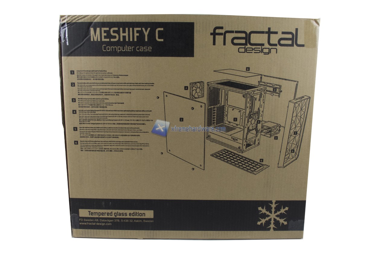 Il Fractal Design Meshify C TG Dark giunge nella consueta confezione di cartone riportante diverse immagini del prodotto, caratteristiche principali e altre informazioni relative il modello.