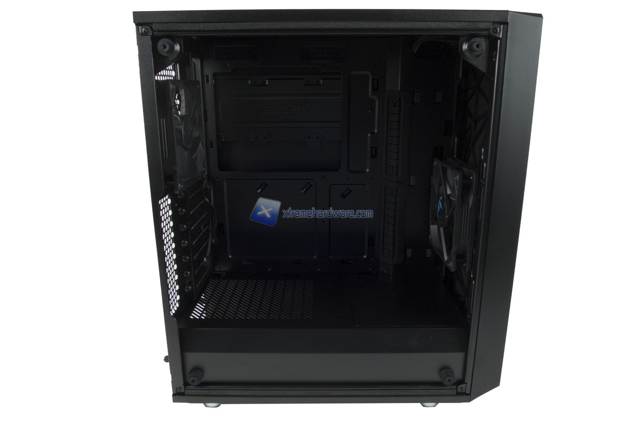 Diamo ora uno sguardo all’interno del Meshify C TG Dark. Rimosso il pannello in vetro temperato possiamo già notare l’adeguato spazio a nostra disposizione per installare i più recenti componenti Hardware. Balza anche e subito all’occhio il Midplate che va a coprire la zona PSU e cage HDD.