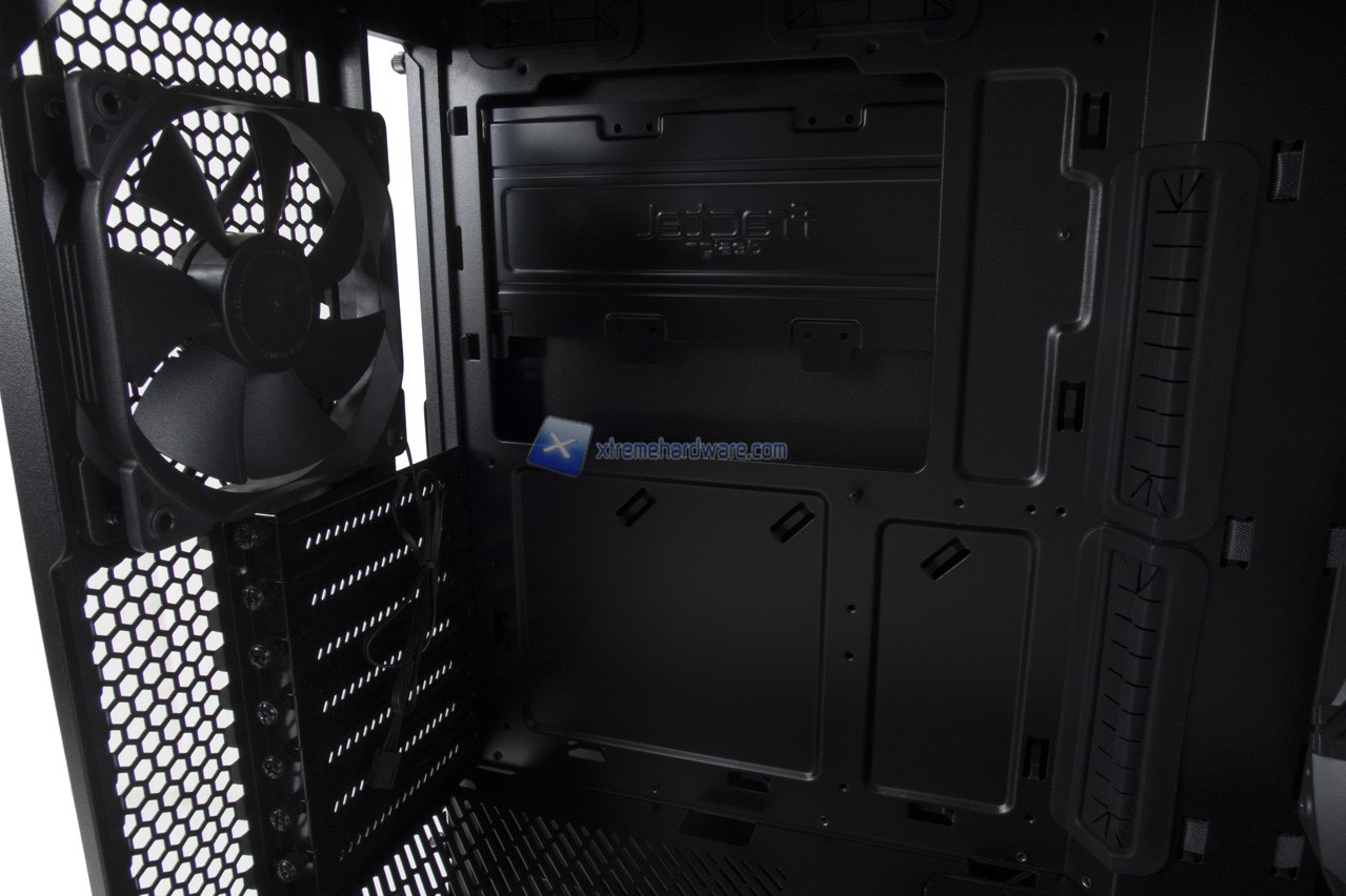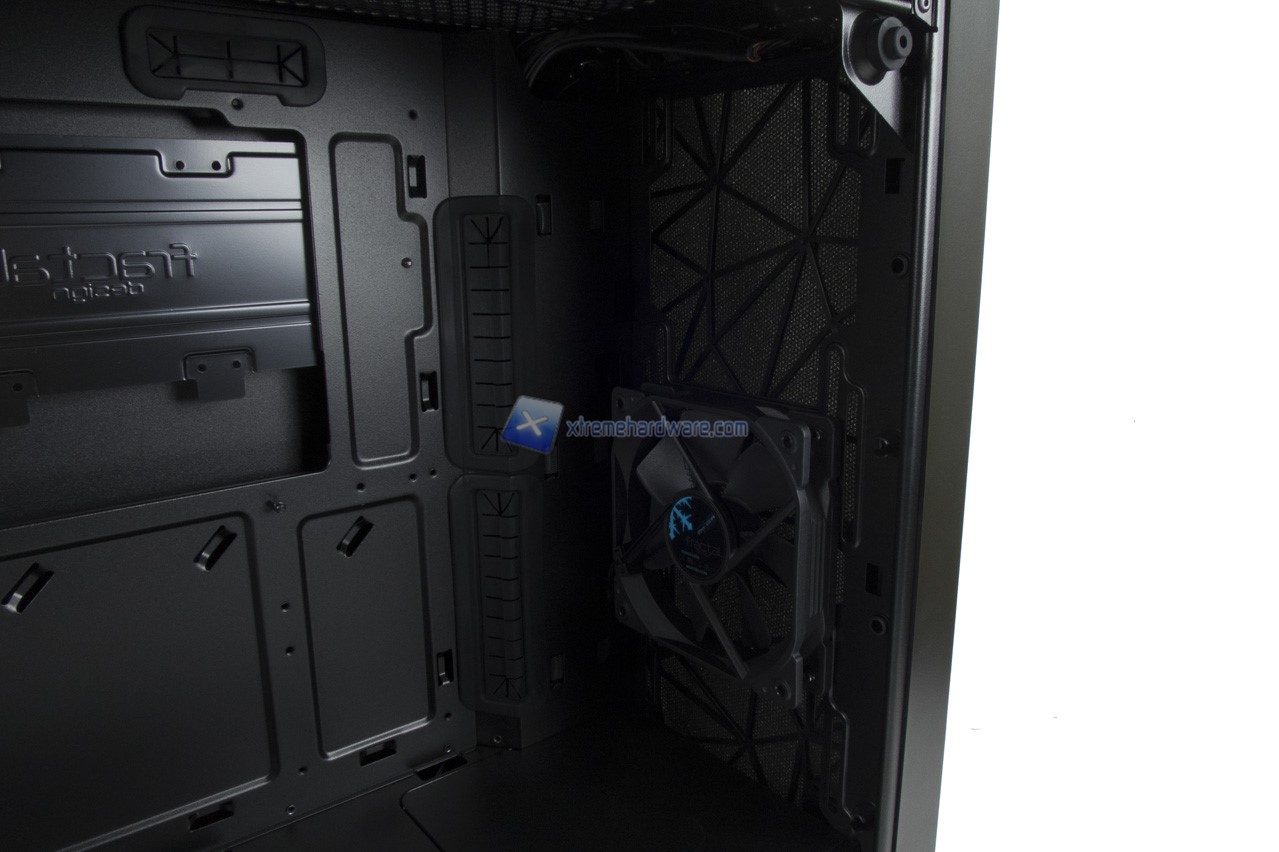 Frontalmente ritroviamo la prima delle due ventole preinstallate e la possibilità di vedere l’inserto antipolvere del pannello frontale. Nel lato inferiore troviamo anche un coperchio che rimosso preventivamente insieme al Cage degli Hard Disk da 3,5’’ permetterà di installare un AIO o radiatore da 360 mm anche in configurazione Push/Pull. Avremo a disposizione ben 12 cm compresa la o le ventole installate.