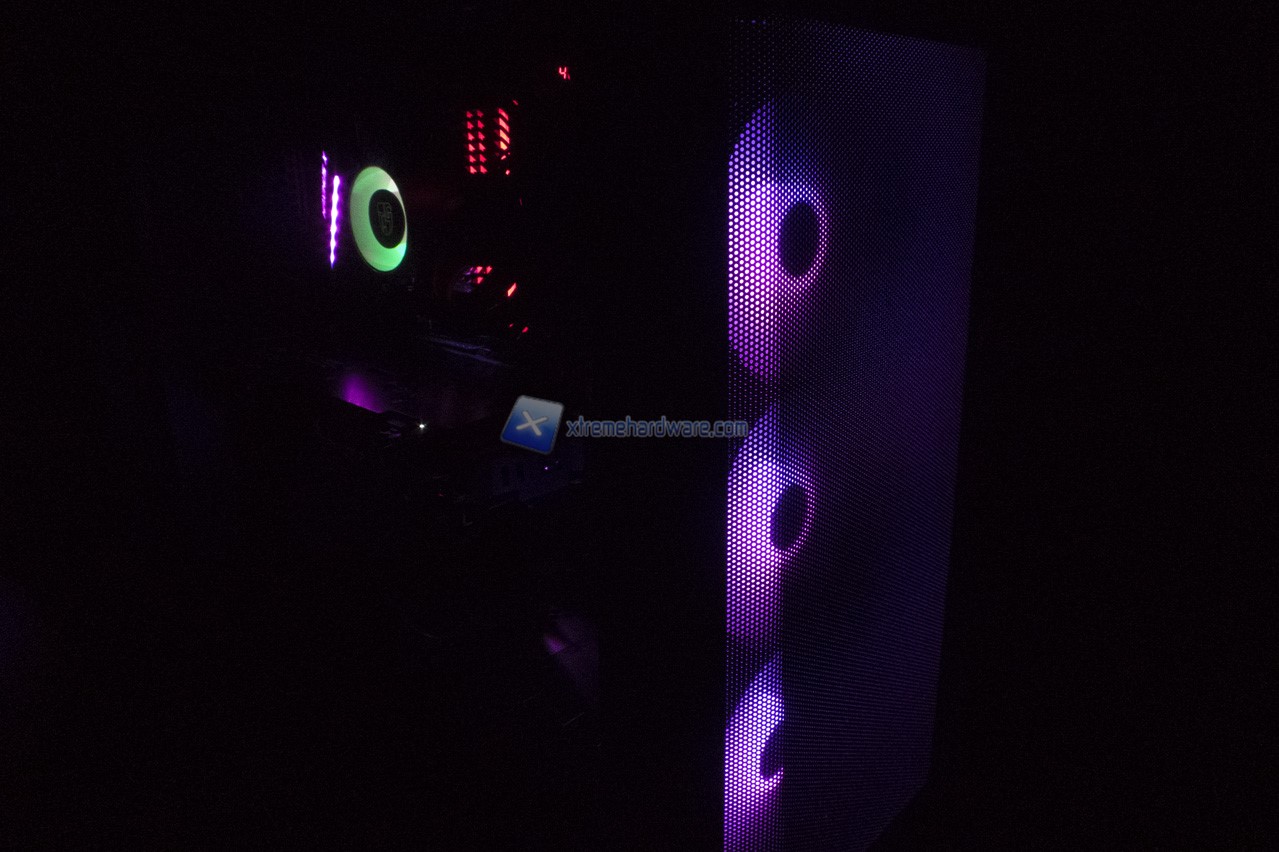 A seguire alcune immagini dell’illuminazione RGB garantita dalle tre ventole Phanteks D-RGB controllabili direttamente dal controller RGB integrato nelle porte I/O o scheda madre Header Digital RGB 5V.