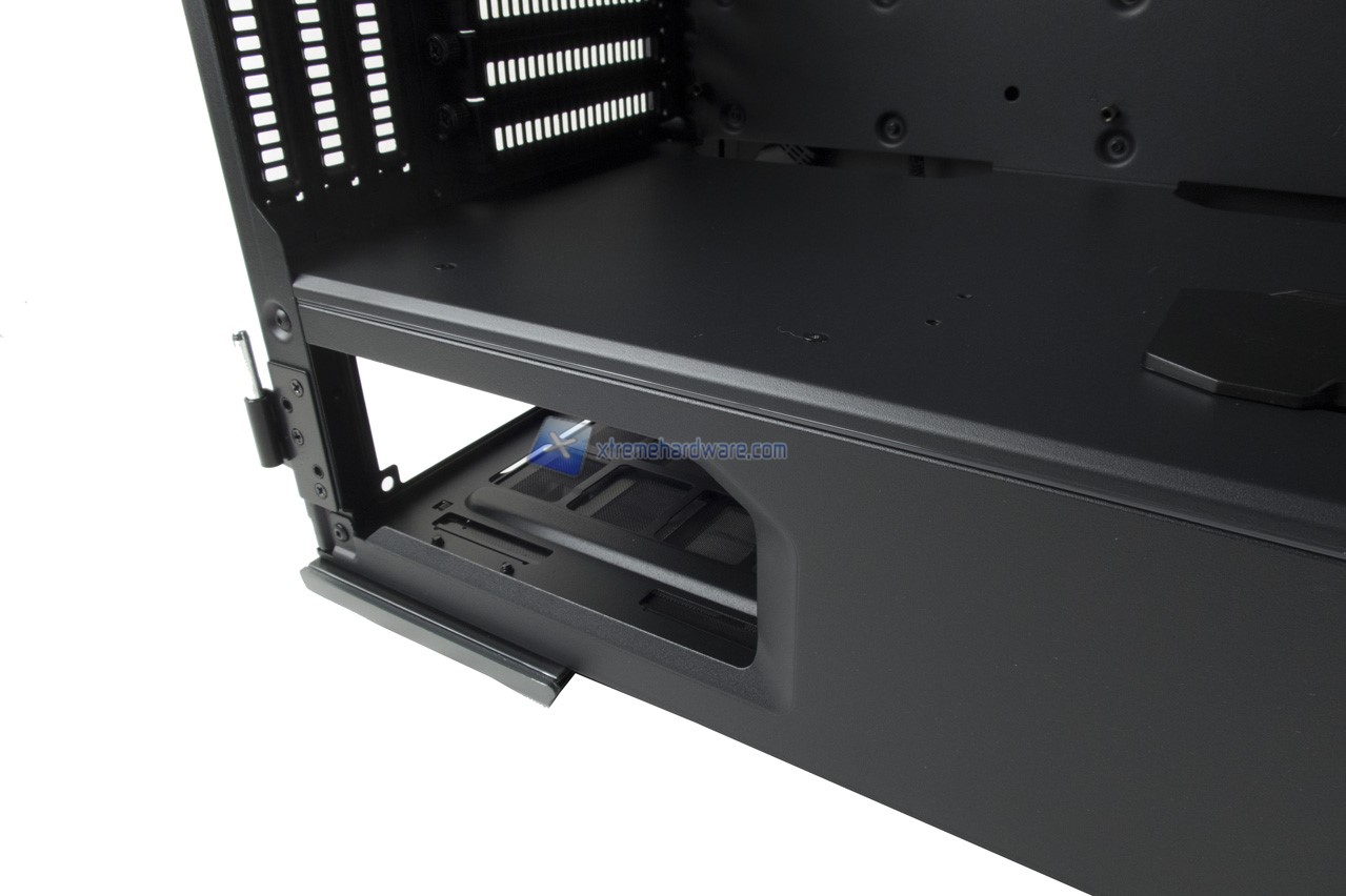 Tenuti in sede da due fermi in plastica suddetti plate potranno essere aperti così da accedere in maniera singola alla zona interessata. Da notare anche come siano presenti dei piolini in plastica che ci permetteranno di installare in modo Tool-less unità SSD. Potremo installare fino a 3 unità SSD per plate oltre ad altre tre posizioni sul Tray della scheda madre ma solo tramite slitte acquistabili separatamente.