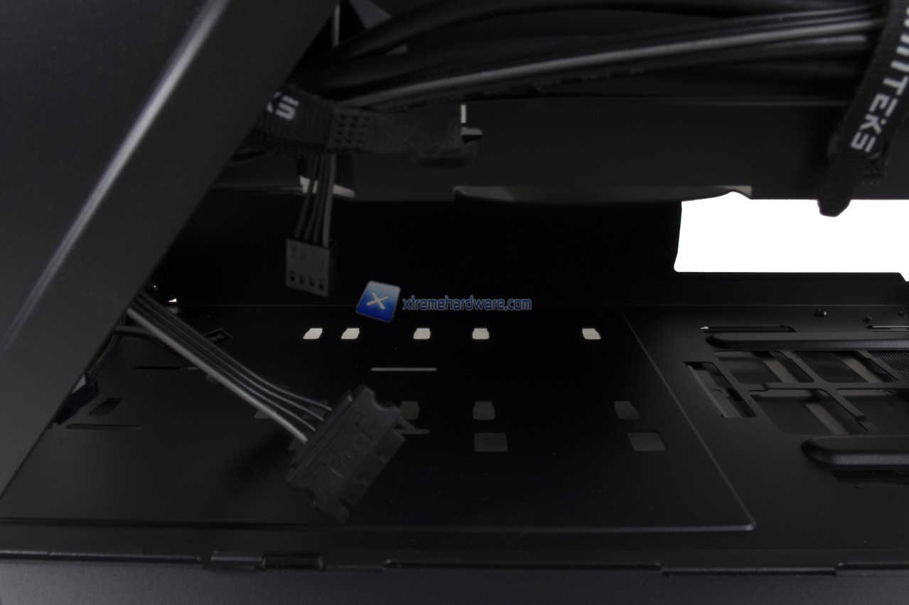 Un rapido sguardo alla zona interna inferiore che ci permetterà come dicevamo di installare i Cage per Hard Disk da 3,5’’. Possiamo scorgere anche l’attacco SATA e quello a 3 Pin per strisce D-RGB o frame Halos di Phanteks per completare il sistema con un tocco RGB.