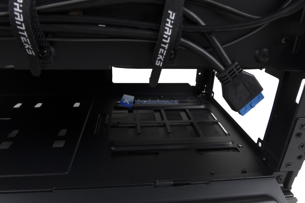 Il tray della scheda madre davvero robusto e solido è caratterizzato come solito da un generoso foro centrale che ci aiuterà a installare dissipatori ad aria o AIO anche in un secondo momento. Intorno il tray troviamo diversi fori per il passaggio e cablaggio dei cavi da e verso il PSU. Nel lato destro troviamo dei fori che saranno occultati da supporti scorrevoli in plastica con l’immancabile logo Phanteks. Dettagli e cura per i dettagli che non mancano come solito.