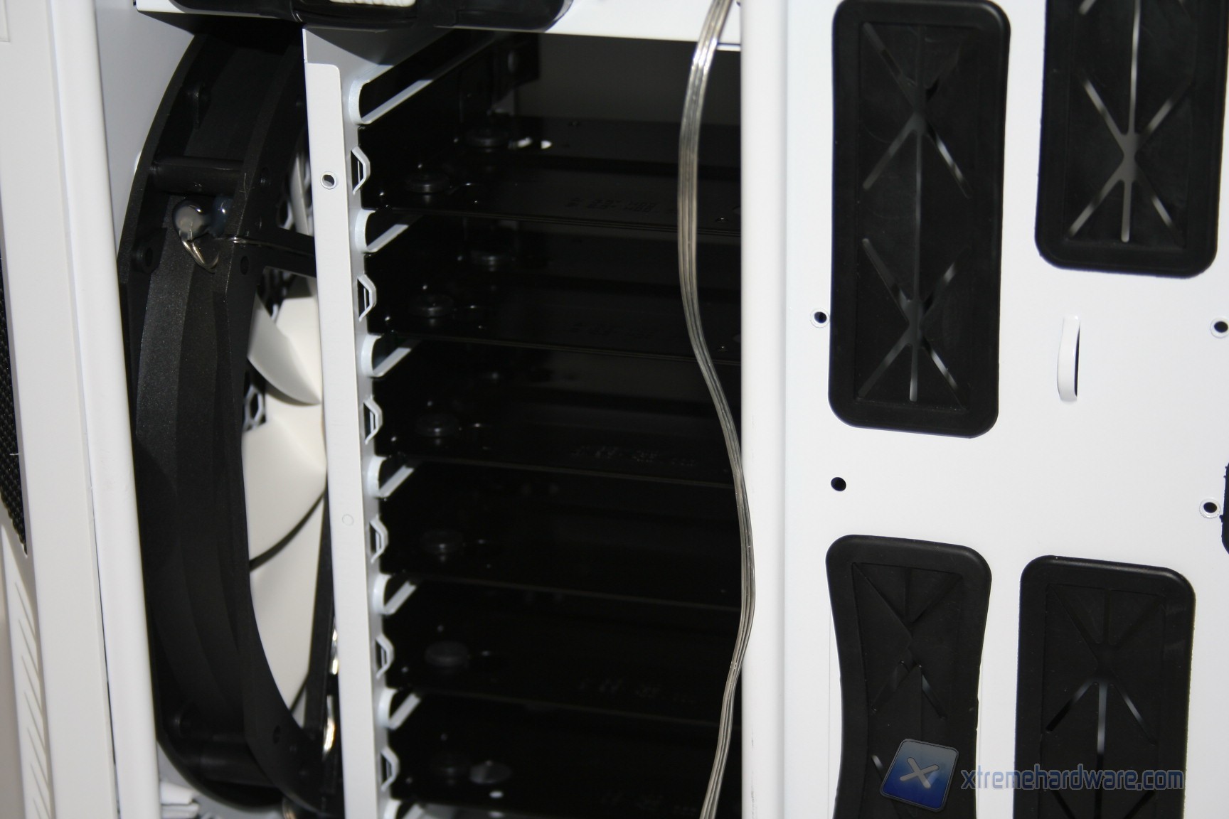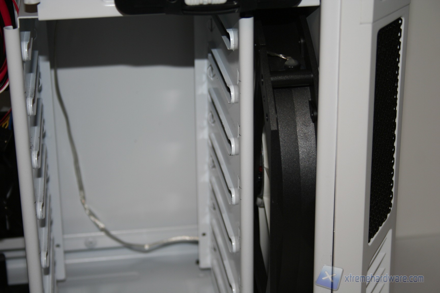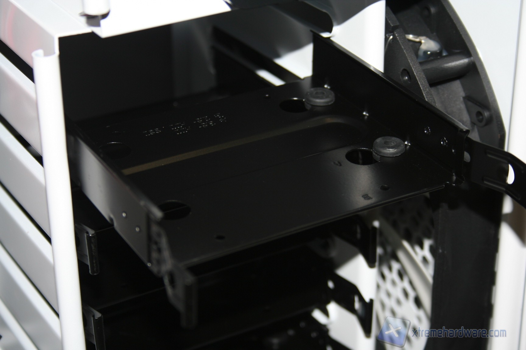 Per quanto riguarda i dischi rigidi troviamo un consueto sistema “fast-swap” (viene riportato hot swap, ma quest’ultimo è ben altra cosa) basato su supporti metallici e disaccoppianti in gomma, molto pratici e funzionali. I dischi sono raffreddati lateralmente da una grande ventola da 23cm quindi non ci saranno problemi di temperatura. Ai fini del modding non sarà possibile staccare agevolmente questa paratia in quanto è rivettata.