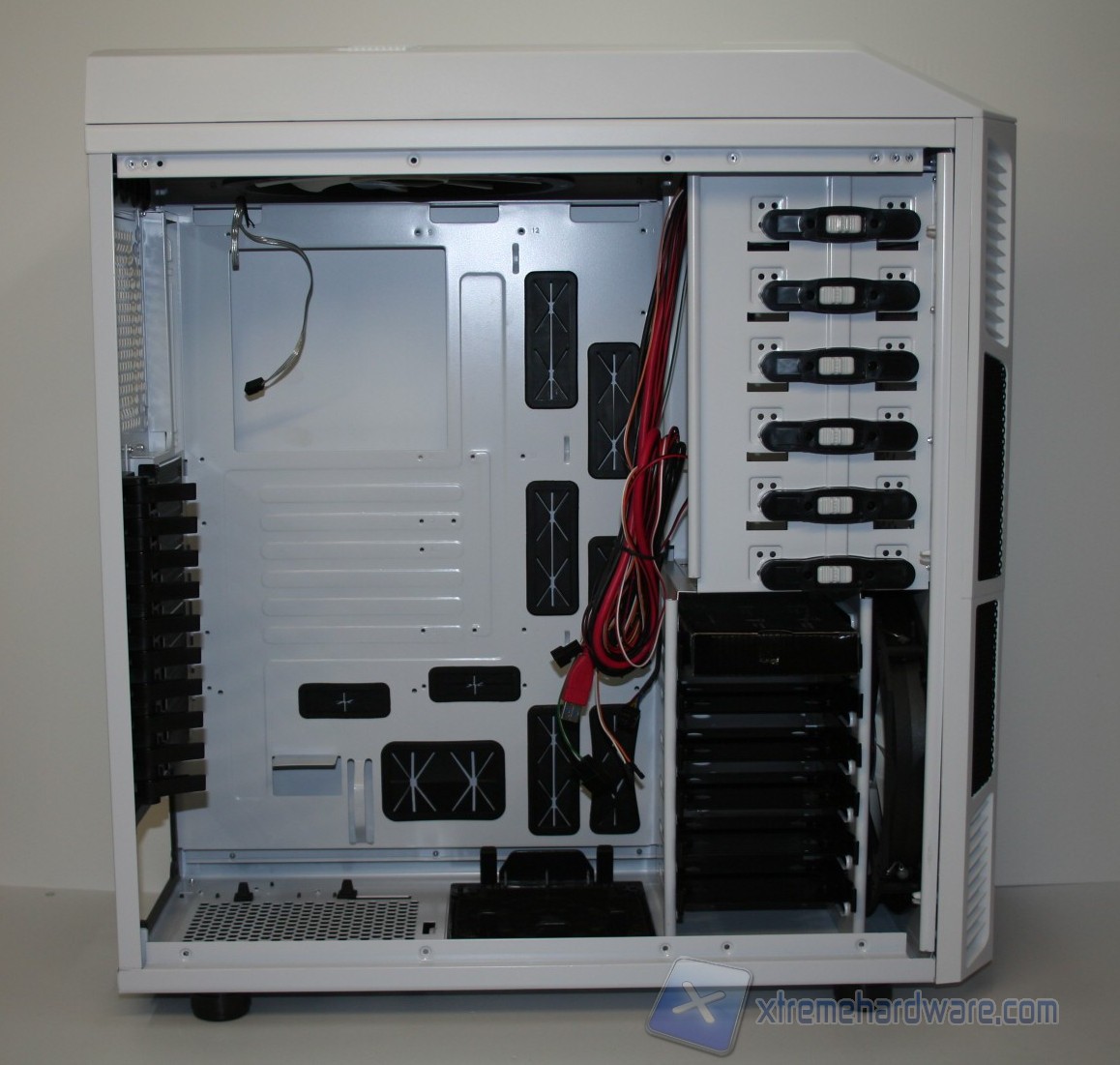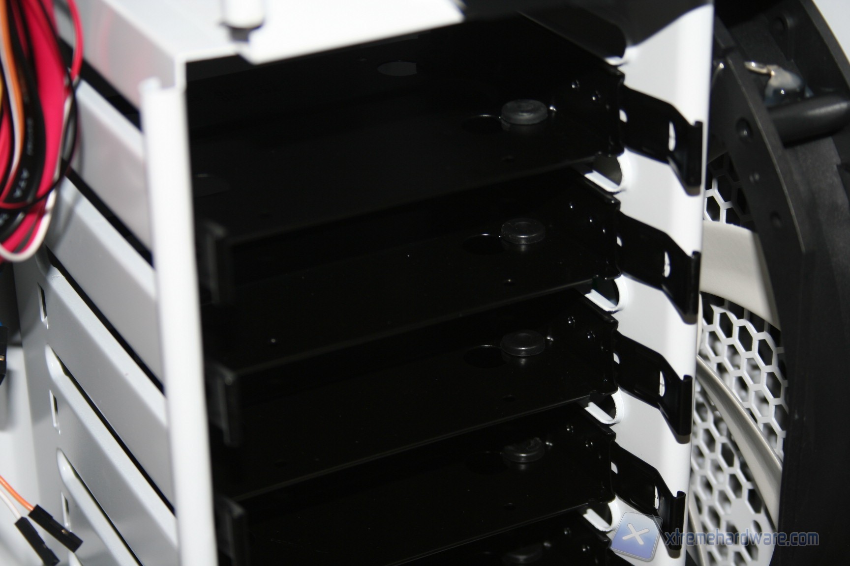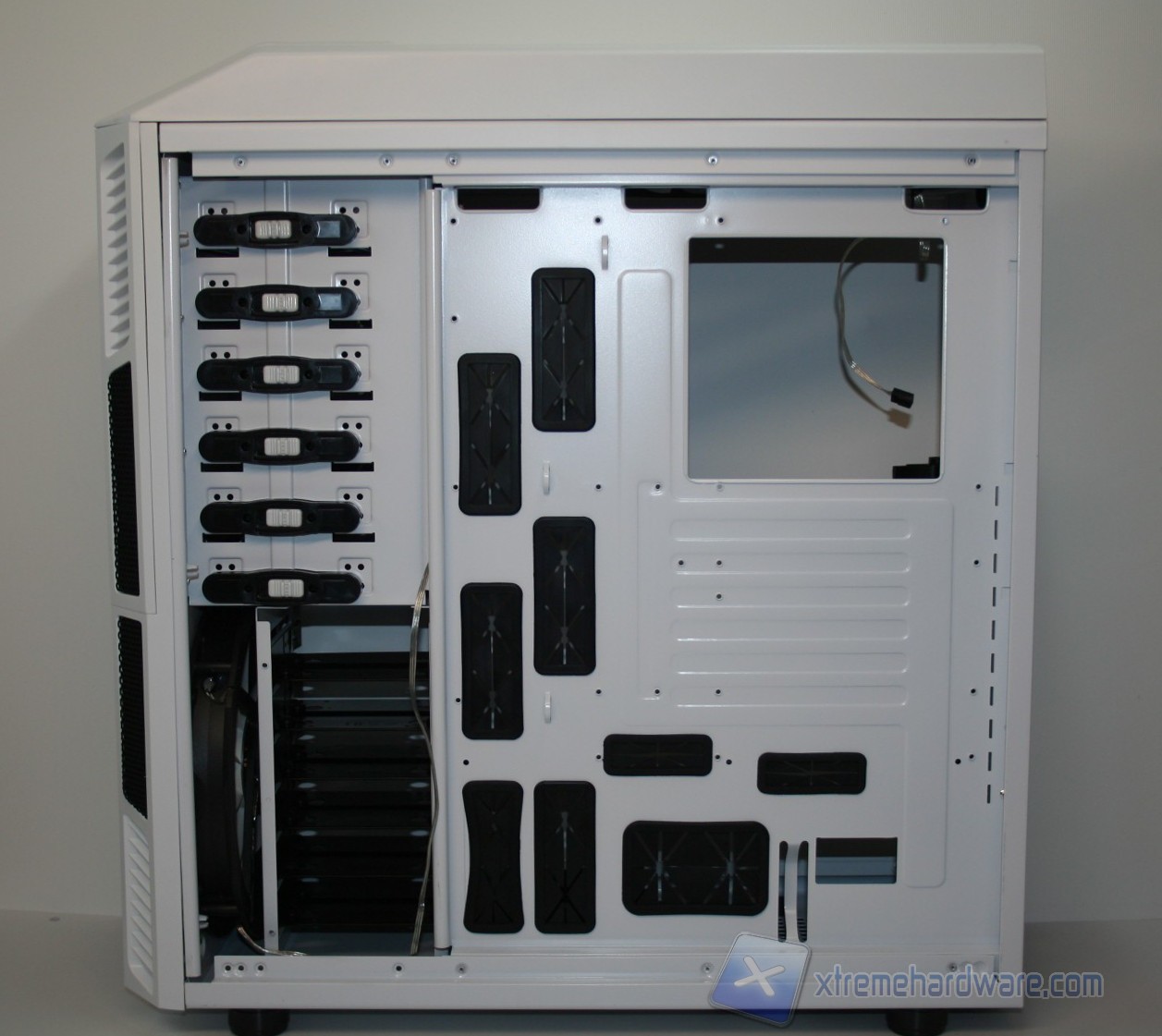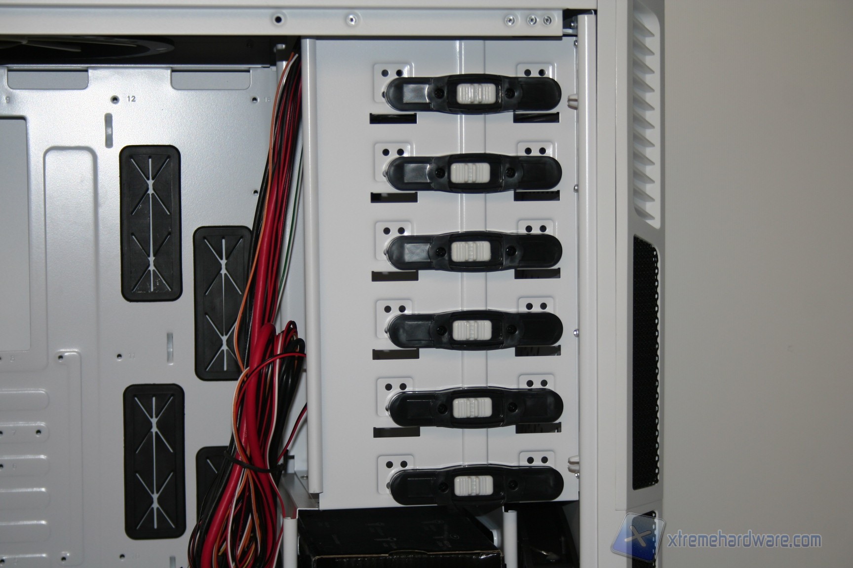 Per quanto riguarda i dischi rigidi troviamo un consueto sistema “fast-swap” (viene riportato hot swap, ma quest’ultimo è ben altra cosa) basato su supporti metallici e disaccoppianti in gomma, molto pratici e funzionali. I dischi sono raffreddati lateralmente da una grande ventola da 23cm quindi non ci saranno problemi di temperatura. Ai fini del modding non sarà possibile staccare agevolmente questa paratia in quanto è rivettata.
