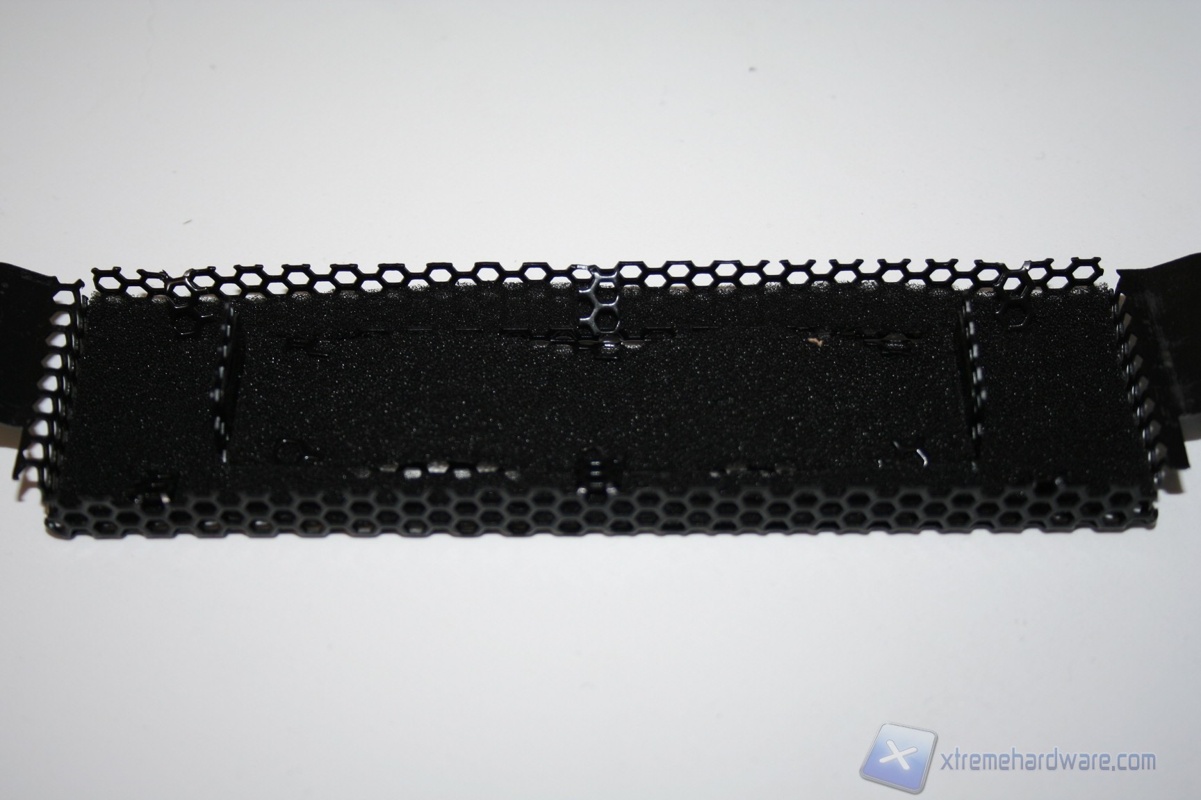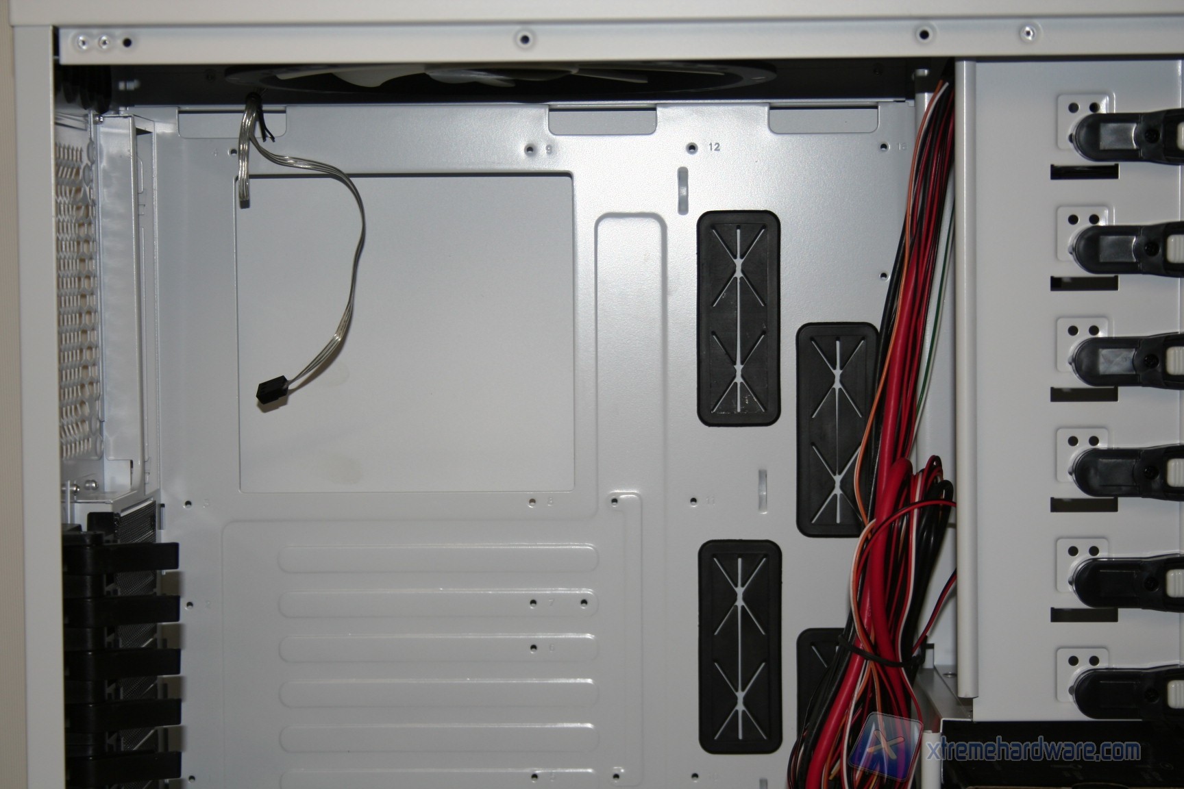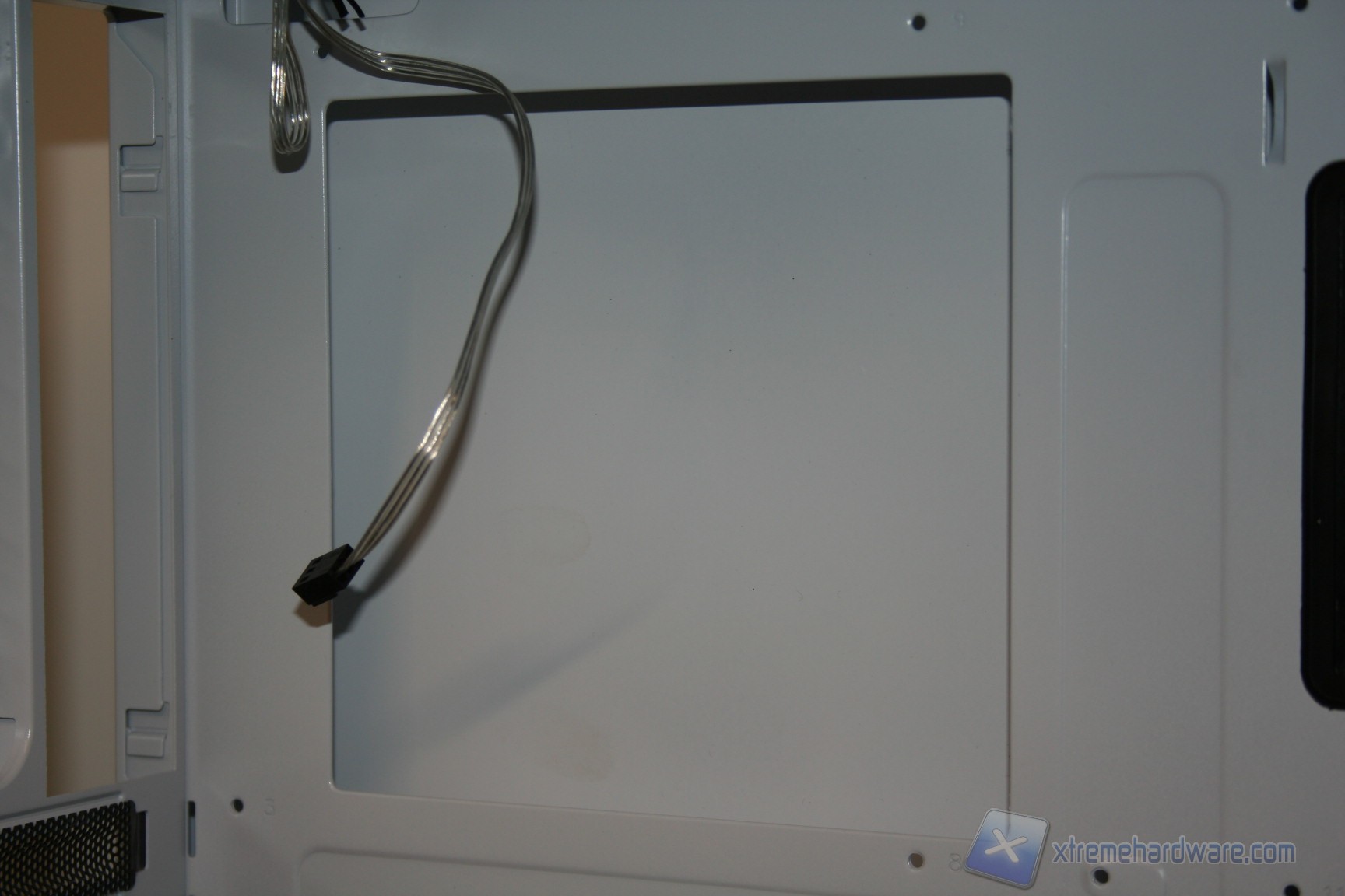 Il piatto della scheda madre, interamente in acciaio, non è removibile ma è qualitativamente molto buono; la robustezza è nella media perché purtroppo lo spessore non è simile alle paratie laterali. Sono presenti ben 7 guaine in gomma antitaglio, purtroppo poco stabili nella loro sede, causandone in alcuni casi la fuoriuscita all’atto del passaggio dei cavi. Sono presenti anche tre fessure superiori per il cablaggio, tra cui un foro nella parte superiore sinistra dove sarà possibile far passare il connettore di alimentazione ausiliario della scheda madre da 4/8pin, ma avremmo gradito, date le dimensioni del cabinet, che fossero leggermente più grandi. La fessura di installazione di backplate posteriori rientra nella norma. Lo spazio tra la scheda madre e la ventola superiore da 200mm è contenuto, quindi potrebbe esserci qualche problema, all’atto dell’inserimento del connettore di alimentazione della CPU, qualora siano presenti dissipatori molto grandi, o radiatori dall’elevato spessore. Posteriormente si hanno numerose aperture dove inserire fascette restringenti, il che permette un livello di pulizia e di ordine molto elevato. Oltre a ciò sarà possibile montare un radiatore da 240mm in posizione superiore, oppure un radiatore da 120mm con spessore doppio.
