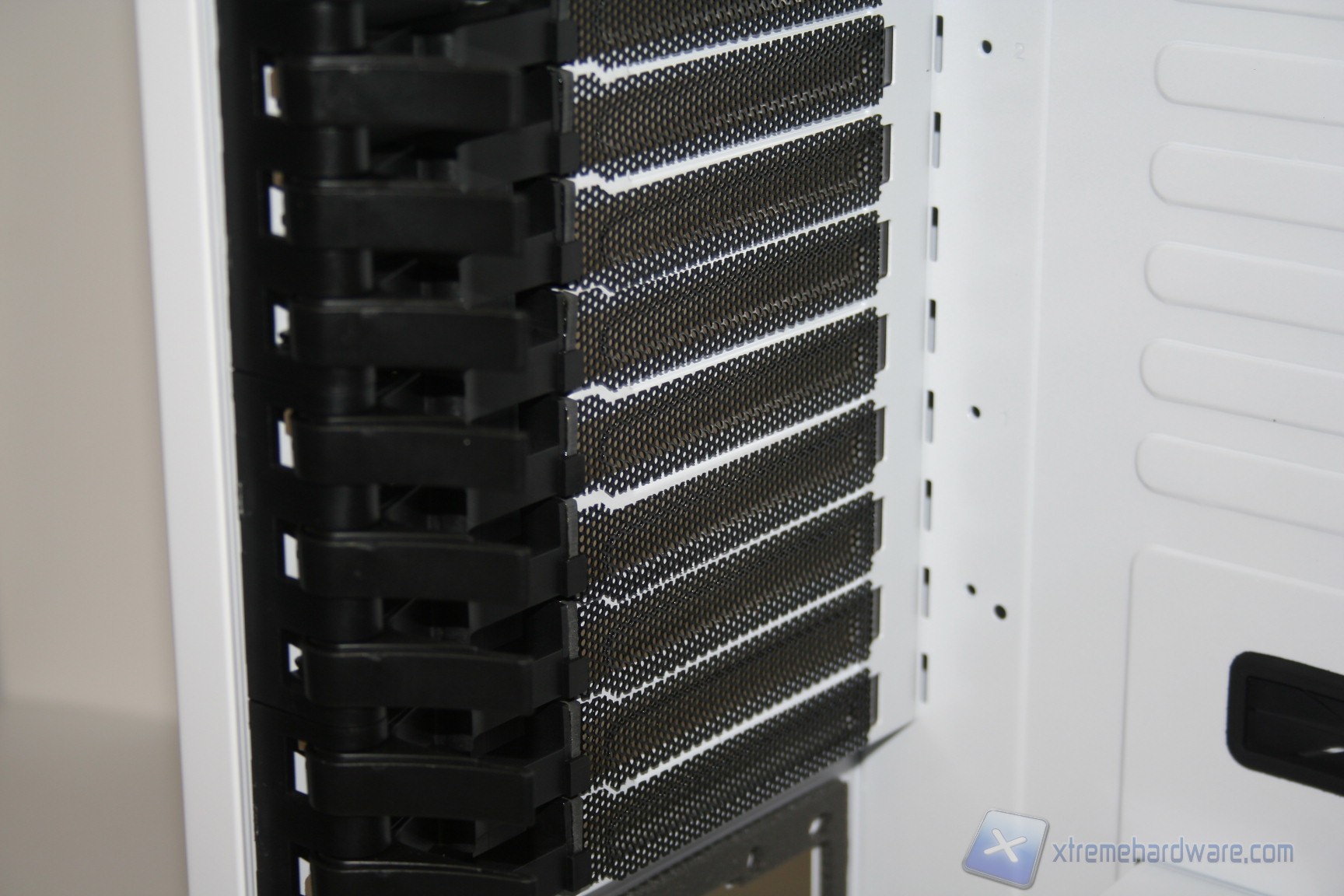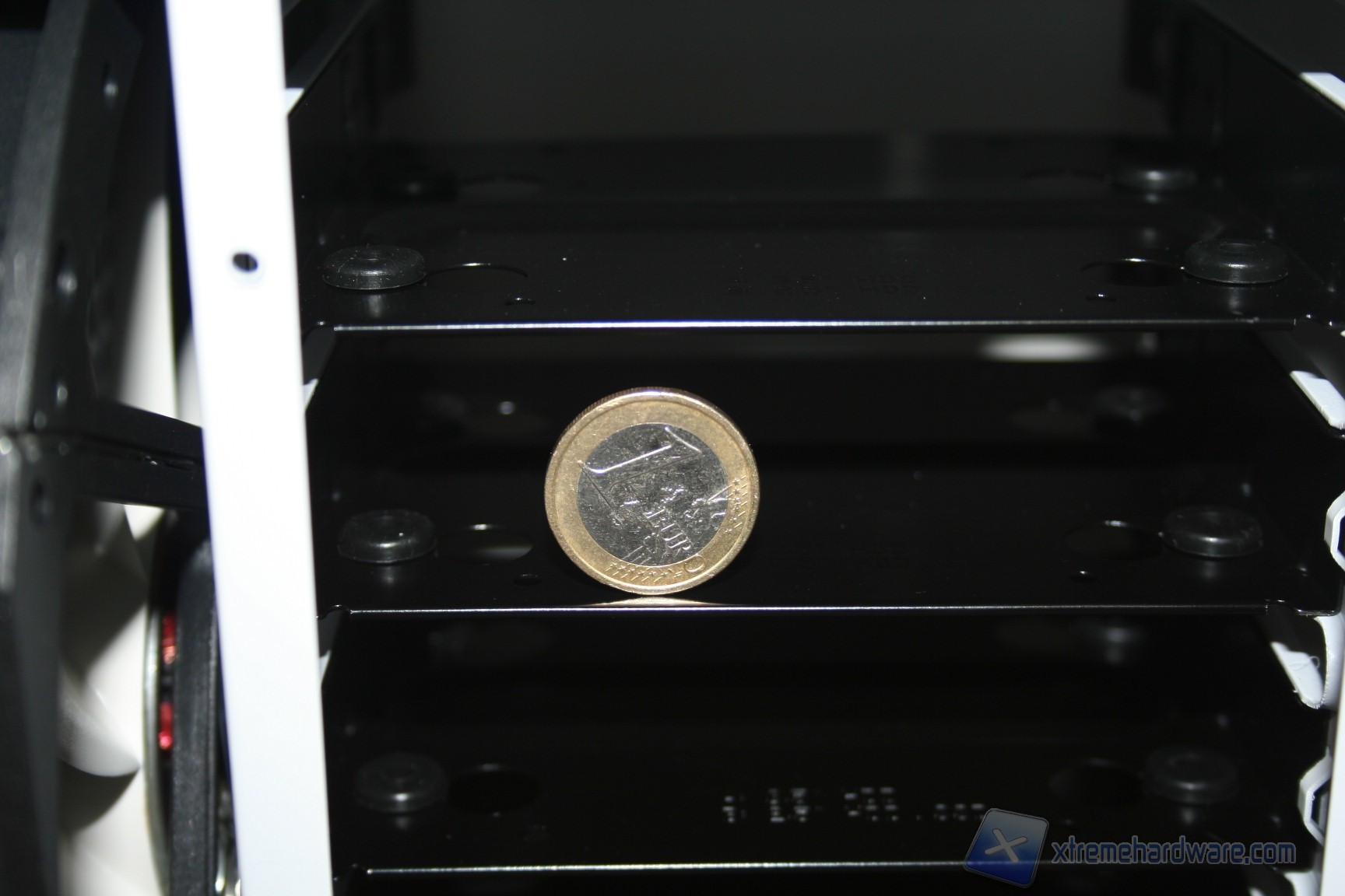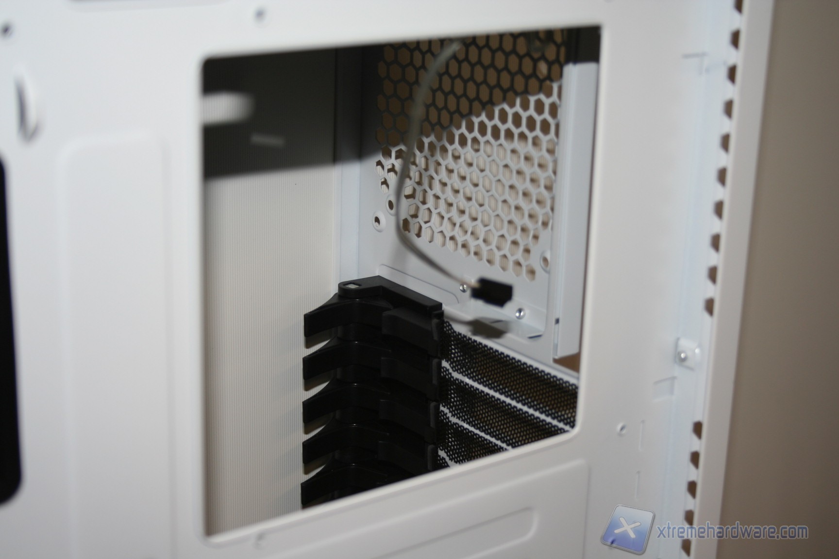 La colorazione interna è completamente bianca ma le guaine in gomma, il sistema di bloccaggio delle periferiche PCI, i cage degli hard disk, il filtro inferiore ed il sistema di bloccaggio delle periferiche da 5.25” presentano una colorazione nera. Le dimensioni sono quindi decisamente importanti quindi vi consigliamo l’acquisto di prolunghe di connessione per il connettore da 8 pin della CPU e quello da 24 Pin della scheda madre, assieme magari a qualche prolunga molex, che può tornare sempre utile.