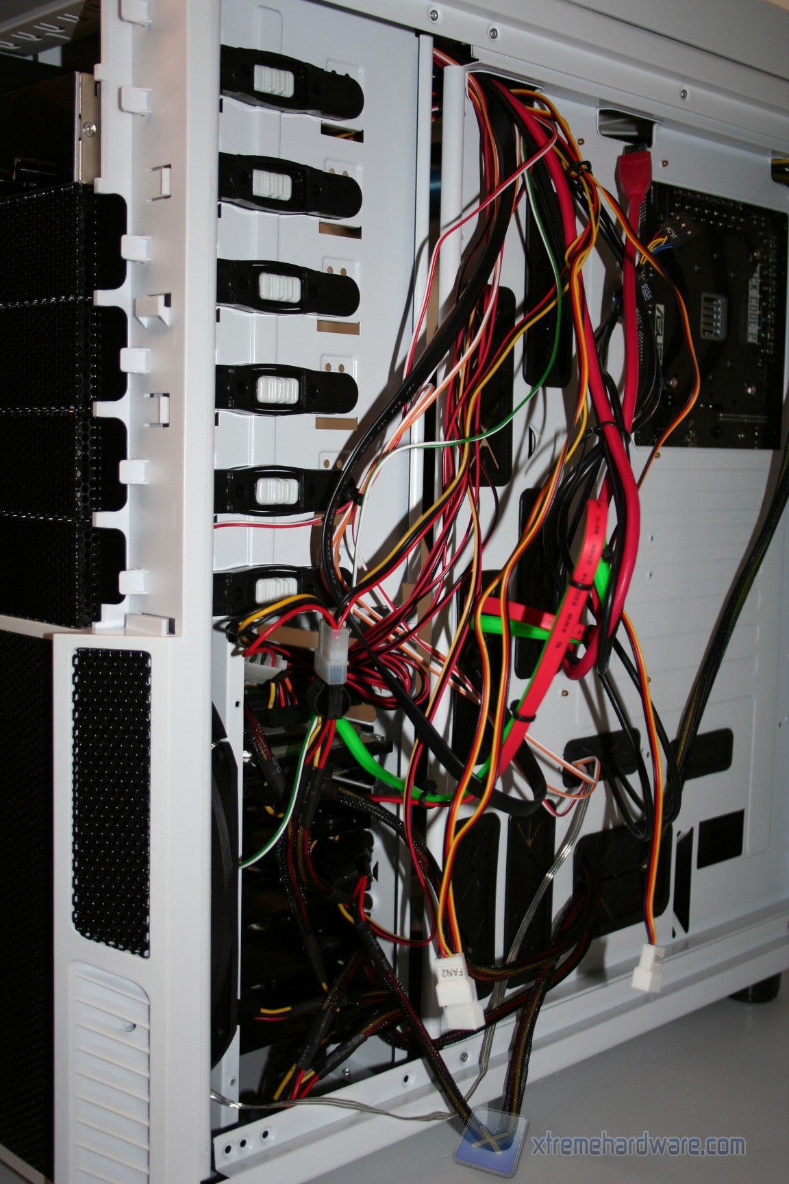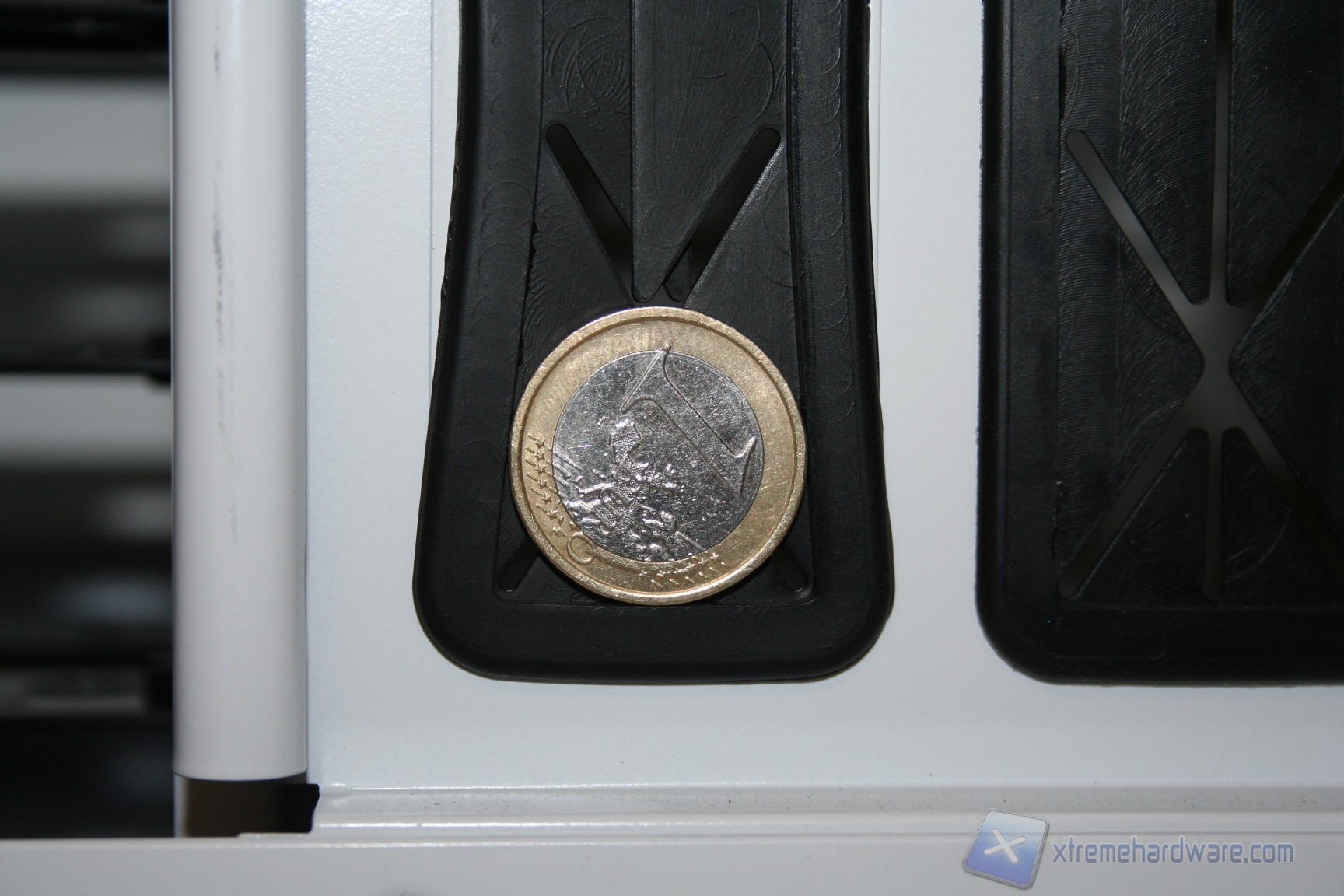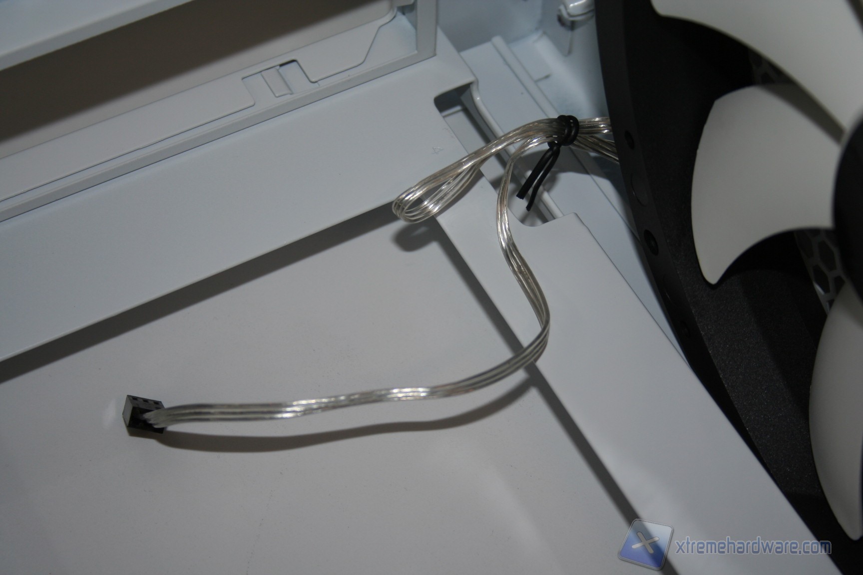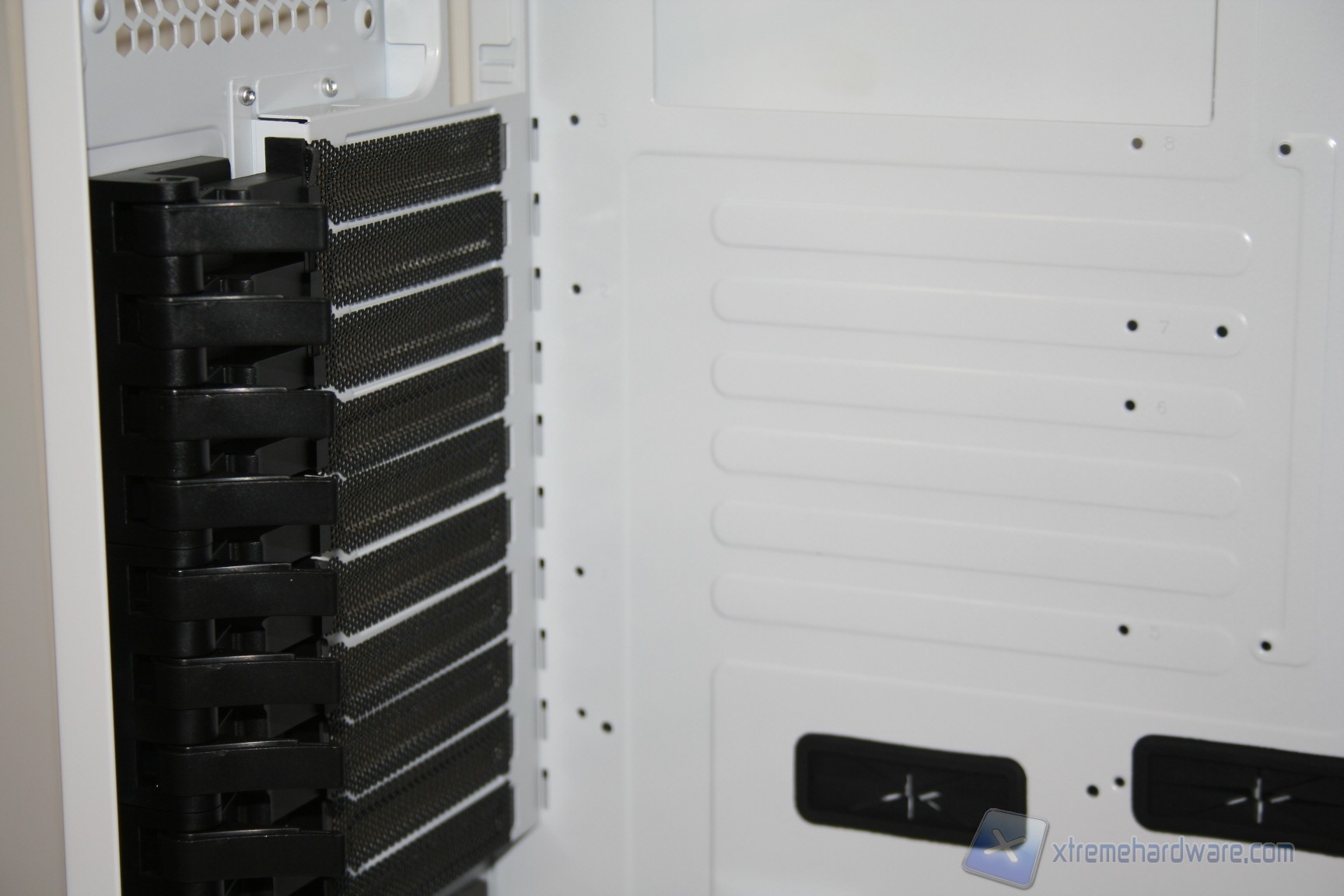 La colorazione interna è completamente bianca ma le guaine in gomma, il sistema di bloccaggio delle periferiche PCI, i cage degli hard disk, il filtro inferiore ed il sistema di bloccaggio delle periferiche da 5.25” presentano una colorazione nera. Le dimensioni sono quindi decisamente importanti quindi vi consigliamo l’acquisto di prolunghe di connessione per il connettore da 8 pin della CPU e quello da 24 Pin della scheda madre, assieme magari a qualche prolunga molex, che può tornare sempre utile.