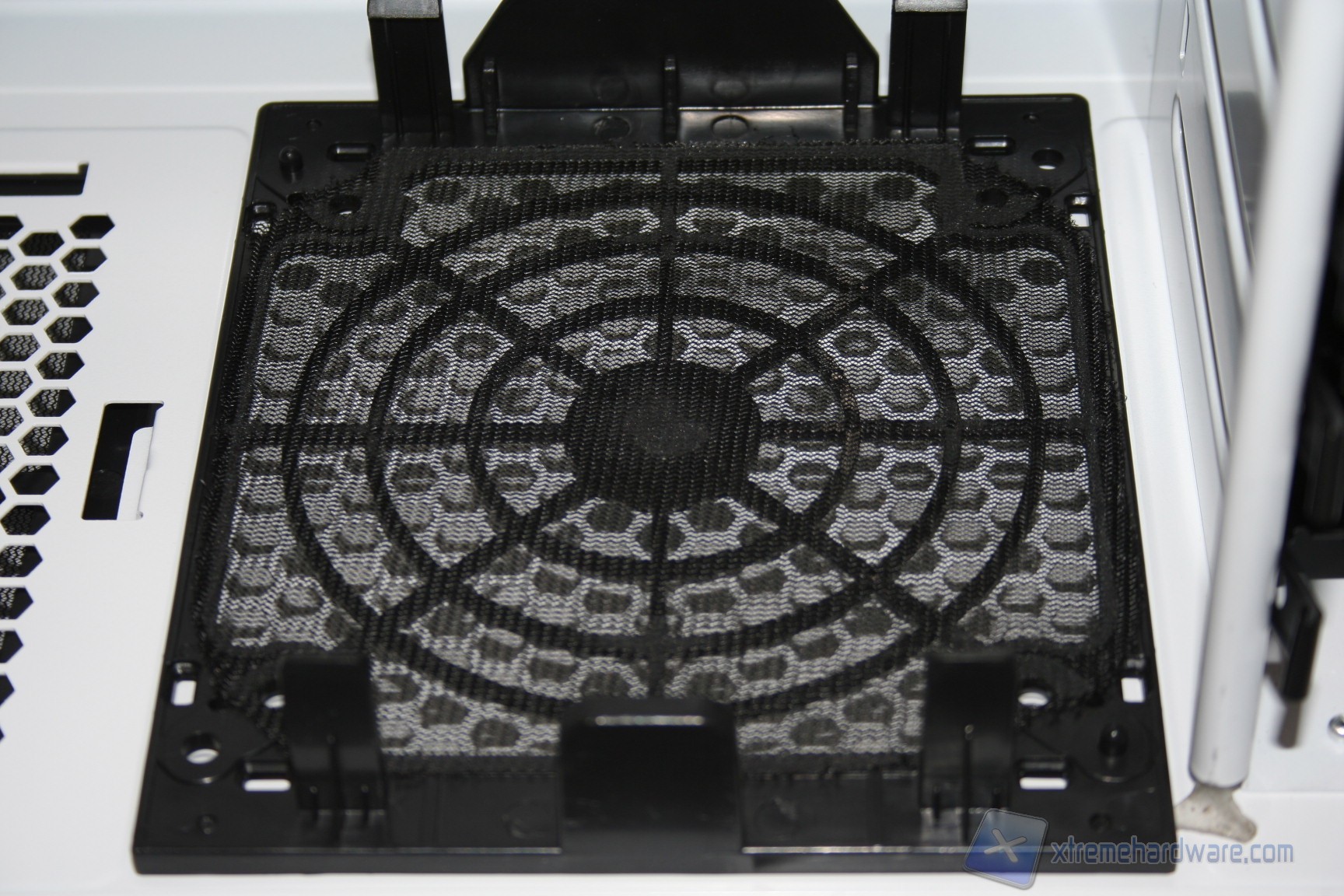 Nella parte bassa troviamo l’alloggio per l’alimentatore ed anche un sistema di bloccaggio per una ventola addizionale da 120mm. Quest’ultima però non sarà possibile montarla se l’alimentatore dovesse essere eccessivamente lungo (per le prossime versioni consigliamo l’adozione di un sistema di filtri magnetici, come quelli appena immessi in commercio da altre ditte concorrenti, ma sempre acquistabili a parte).