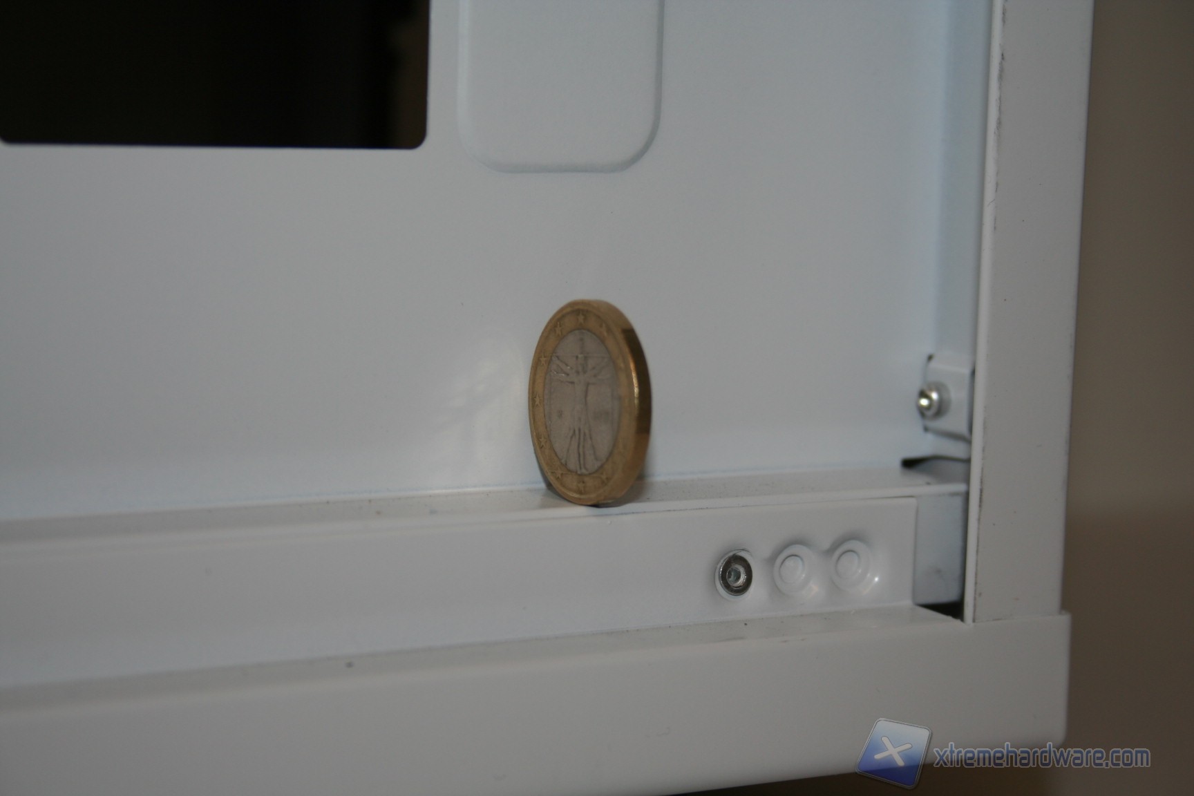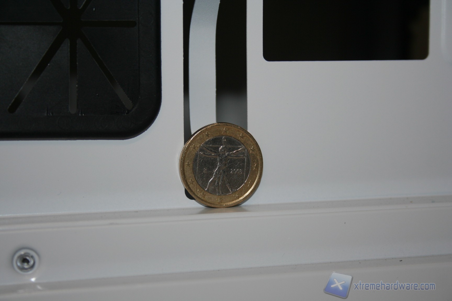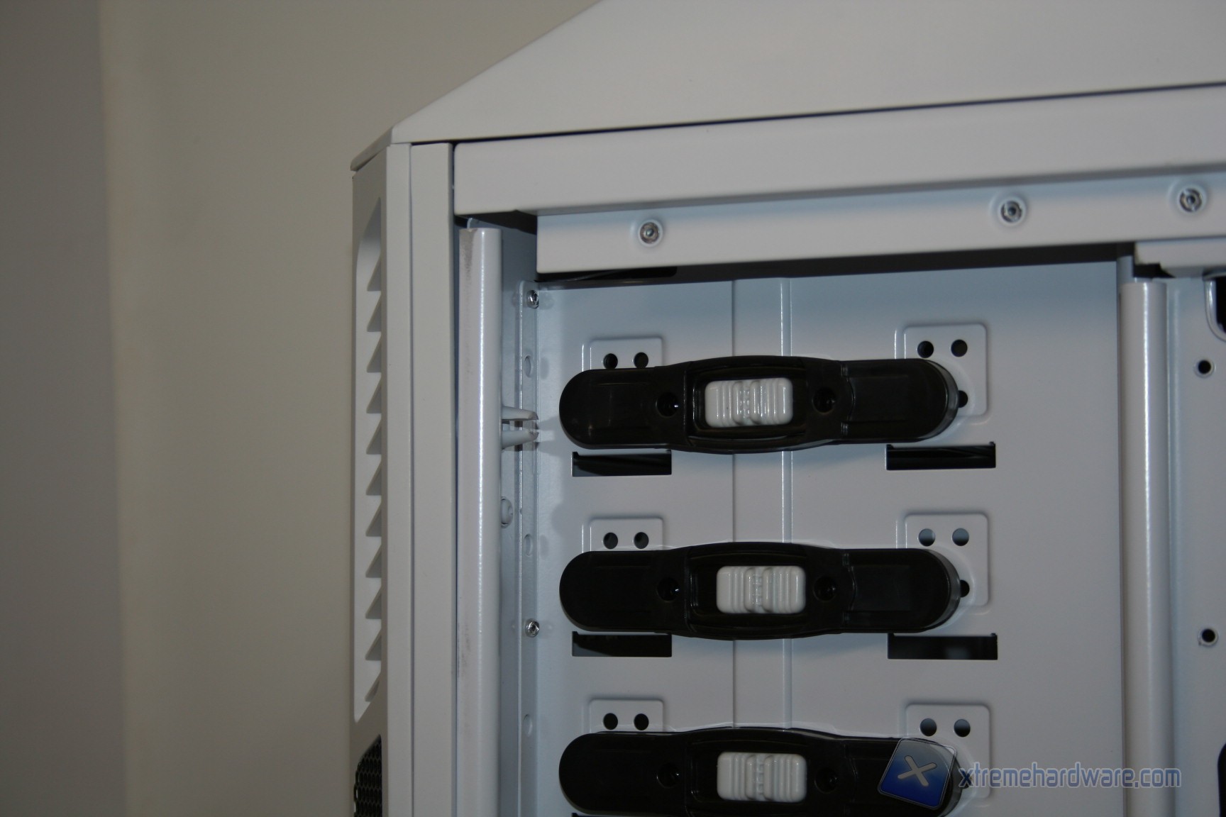 Come sistema di blocco delle periferiche da 5.25”, troviamo dei piccoli pulsanti a scorrimento laterale, funzionali allo scopo e carini esteticamente. Sebbene non siano di metallo la durezza è tale da farci pensare che sia difficile romperli, o comprometterne la funzionalità.