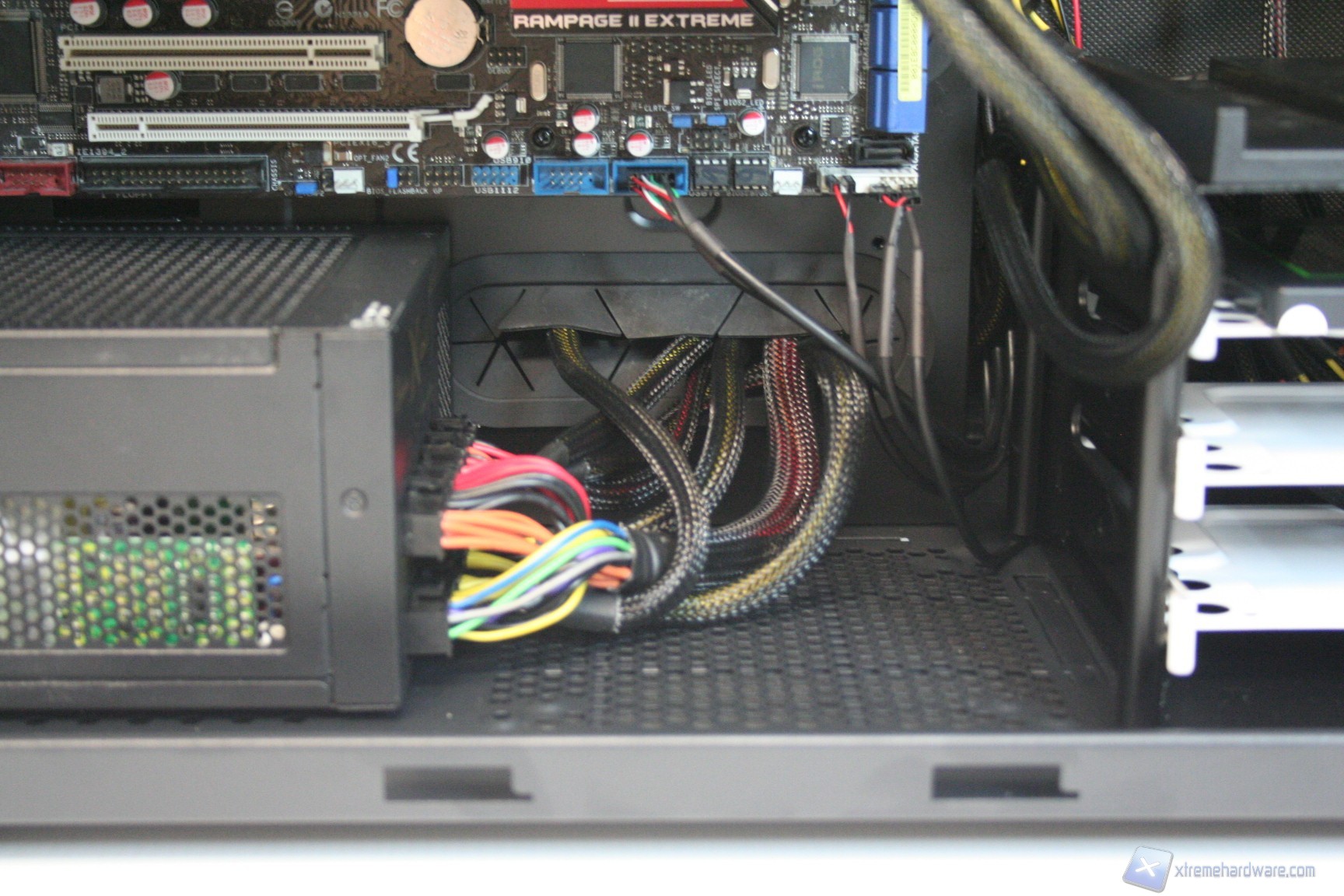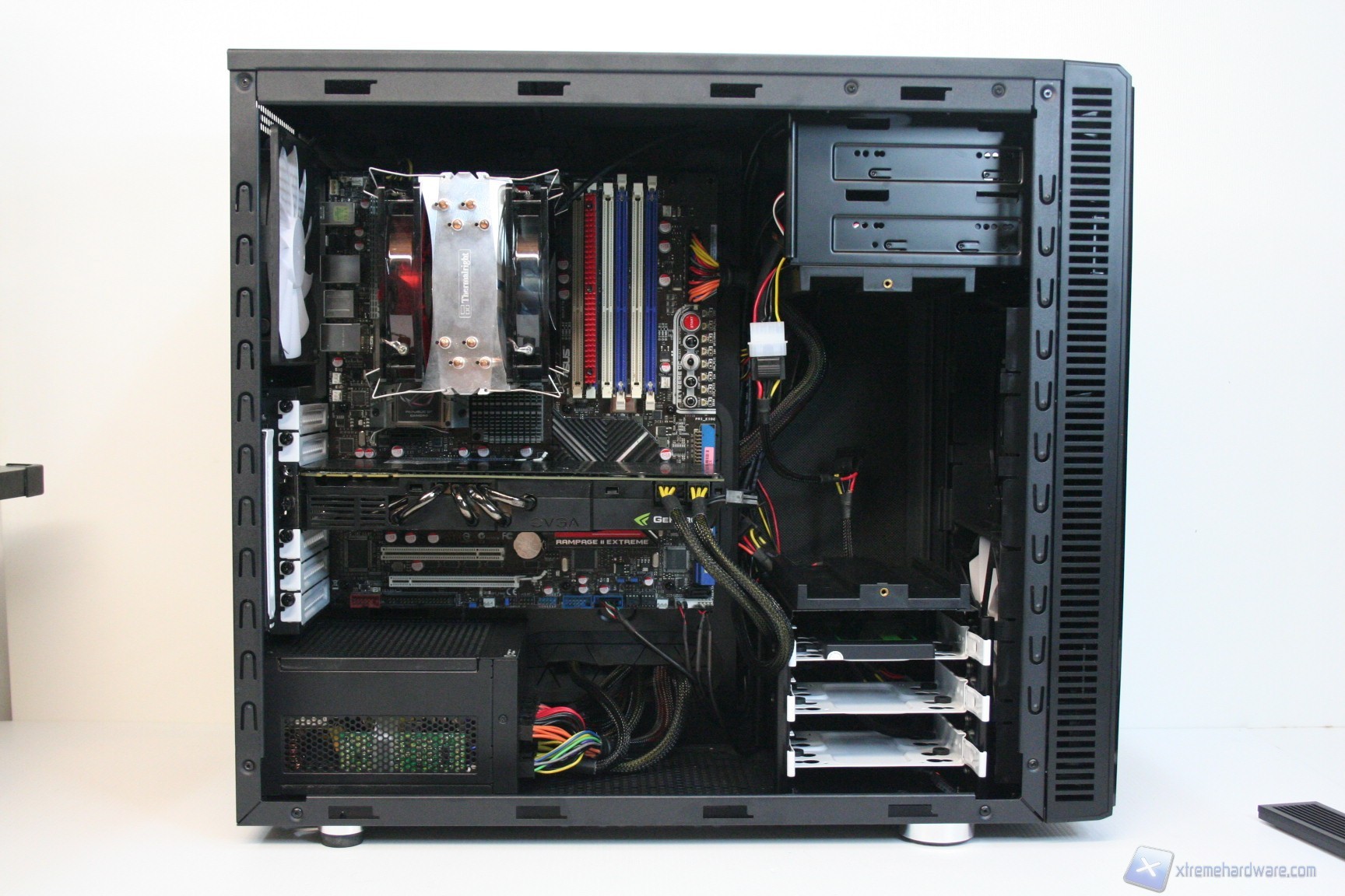 In questo paragrafo analizzeremo il montaggio di un sistema Intel con socket X58, all’interno del Fractal Design Define R4, assieme al conseguente cablaggio posteriore, ed anteriore. Anche per gli utenti poco esperti la procedura è molto facile: per prima cosa dovrete montare l’alimentatore alla base del cabinet, facendo attenzione a passare il connettore di alimentazione supplementare della scheda madre, da 4/8 pin, attraverso l’apertura laterale destra, quindi facendolo scomparire e passare dietro alla paratia, per permetterne il passaggio dal foro superiore sinistro. Fatto questo consigliamo l’installazione dei dischi rigidi all'interno del cage inferiore, utilizzando di viteria dedicata, direttamente nelle aperture predisposte con profili gommati antivibrazione. Fatto questo sarà necessario montare il lettore ottico, staccando la parte frontale facendo pressione verso l'esterno, partendo dalla base. In seguito, si passerà all’installazione della scheda madre. Se si possiede un dissipatore Intel, tramite il solito sistema push-pin, sarà possibile installarlo successivamente, altrimenti se volete potete già procedere ad installare il backplate del dissipatore della CPU, facendo attenzione a stendere un sottile velo di pasta termica alla base della CPU stessa e posizionando lateralmente il cabinet. Questa è la procedura classica, altrimenti potrete semplicemente montare la scheda madre e sfruttare l'apertura posteriore del cabinet. Dopo aver montato il dissipatore sulla scheda madre, sarà necessario montare la scheda video, le RAM ed infine procedere all’assemblaggio dei cavi di connessione del cabinet alla scheda madre. Per fare un lavoro pulito consigliamo l’utilizzo delle fascette restringenti fornite in bundle.