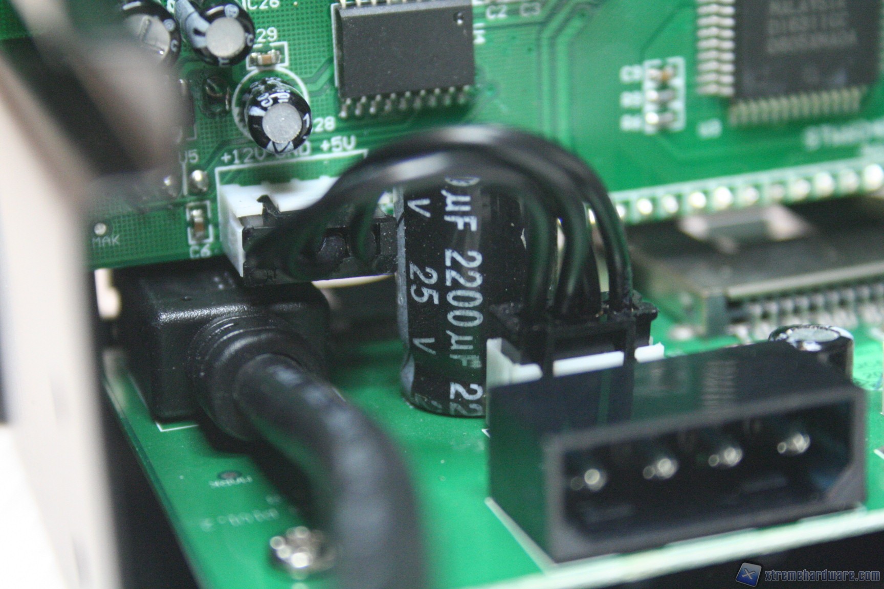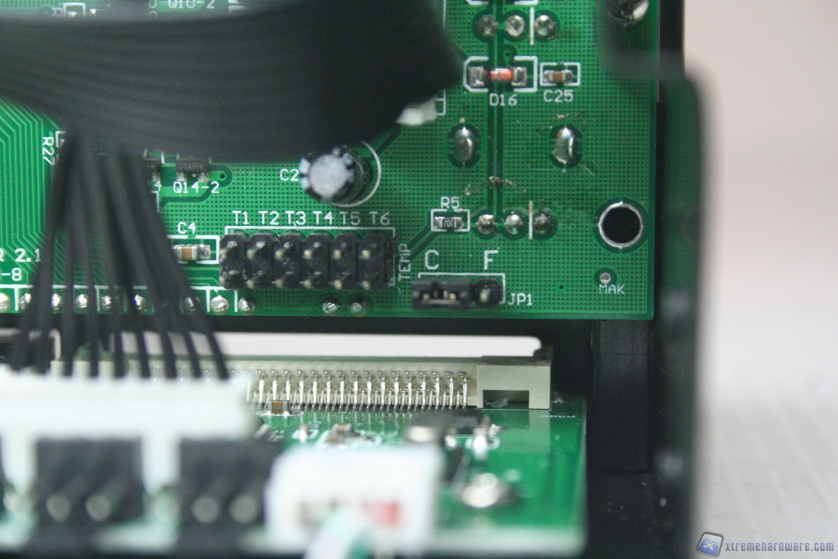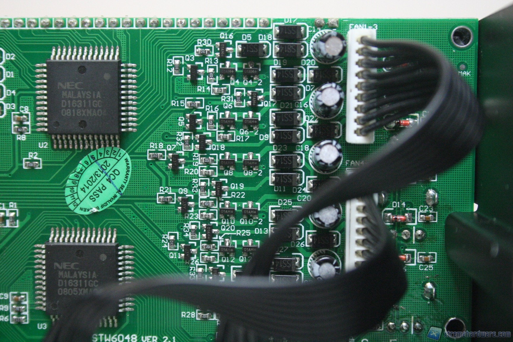 Nella parte posteriore troviamo l’elettronica dell’unità, di buona qualità anche se ci viene qualche dubbio sull’effettiva capacità fino a 36W per canale. Nella parte destra, su di un PCB orizzontale che integra anche l’ingresso di alimentazione, troviamo i sei connettori da 3 pin per le ventole, oltre ad un condensatore certificato a 105°C da 2200uF/25V DC. Il PCB orizzontale è connesso al PCB frontale con connessioni-ponte in rame e la rigidità complessiva è molto elevata. In merito a quest’ultimo, osservando le interconnessioni con il PCB inferiore troviamo i due connettori a pettine che permettono l’alimentazione delle ventole; per ogni canale troviamo un condensatore dedicato, similmente a molti modelli della concorrenza, anche se ultimamente abbiamo constatato che si sta iniziando a sostituire questo design con MOSFETs, sulla scia del modello Lamptron FC5V3.