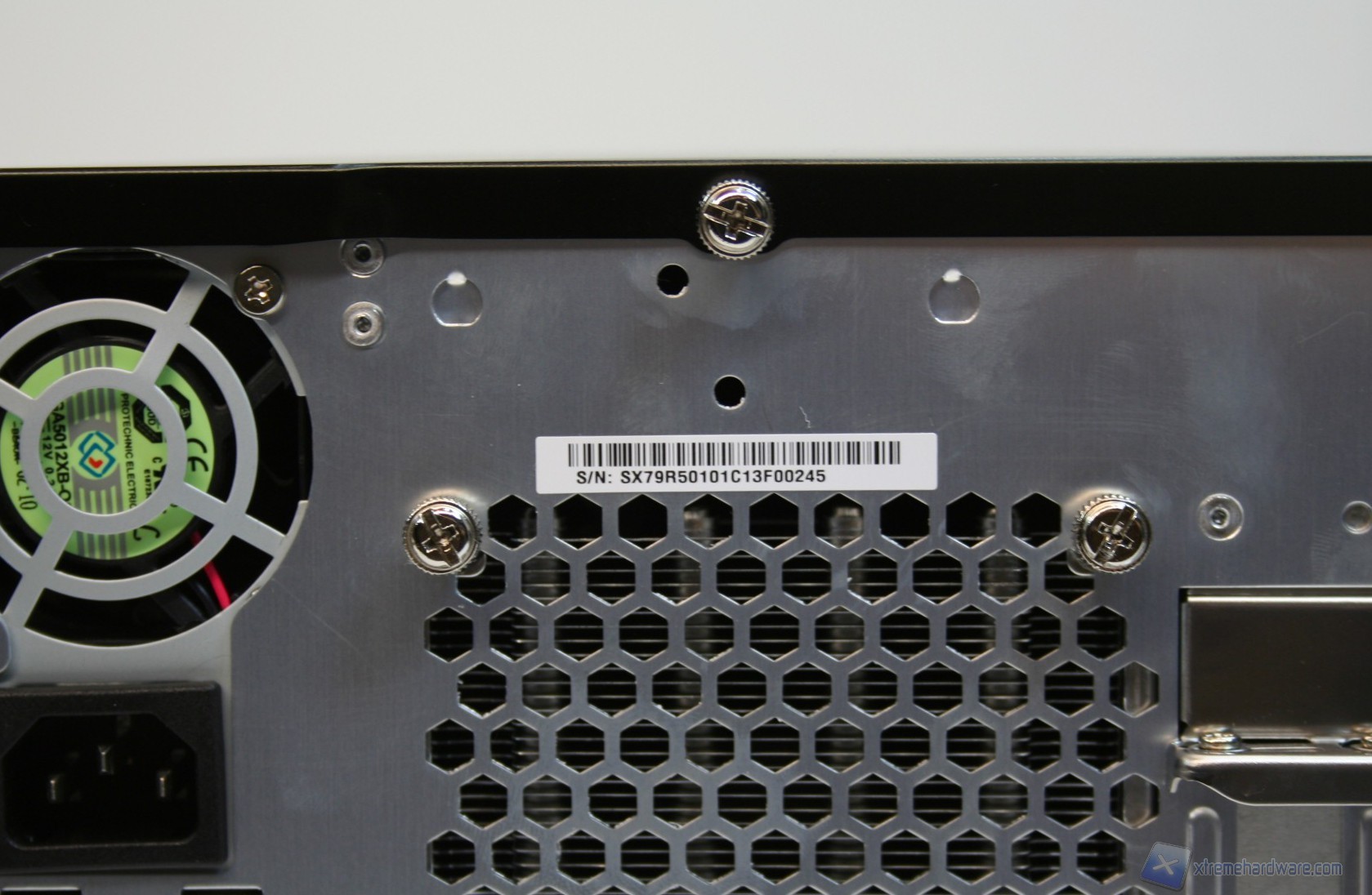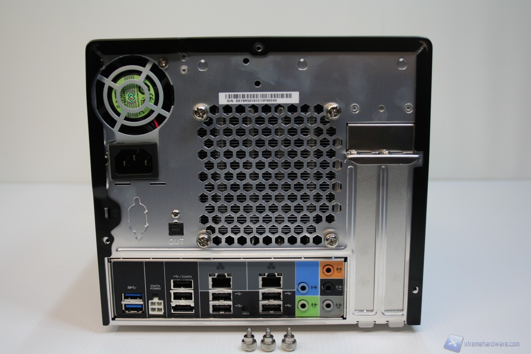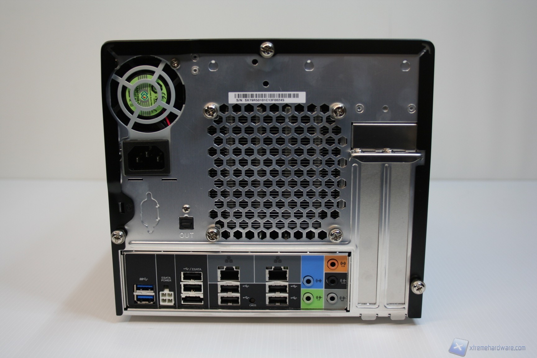 La parte superiore e quella laterale, sinistra e destra, sono un blocco unico di alluminio ed è possibile rimuoverle semplicemente tramite la rimozione di tre viti, nella parte posteriore. La parte inferiore invece presenta 4 piedini di materiale plastico che gli conferiscono stabilità e rigidezza evitando vibrazioni all’intero chassis. Posteriormente è presente la ventola da 50mm dell’alimentatore, l’ingresso del cavo di alimentazione, le feritoie di aerazione del dissipatore ed anche le connessioni della scheda madre. La solidità strutturale è ottima, come il layout e la pulizia delle finiture. Cosa interessante è che è presente anche un connettore eSATA di potenza, per alimentatore hard disk esterni, ma soprattutto un pulsante per resettare il CMOS del BIOS (ClearCMOS). E’ possibile anche osservare il seriale posteriormente, come si vede nella foto in questione.