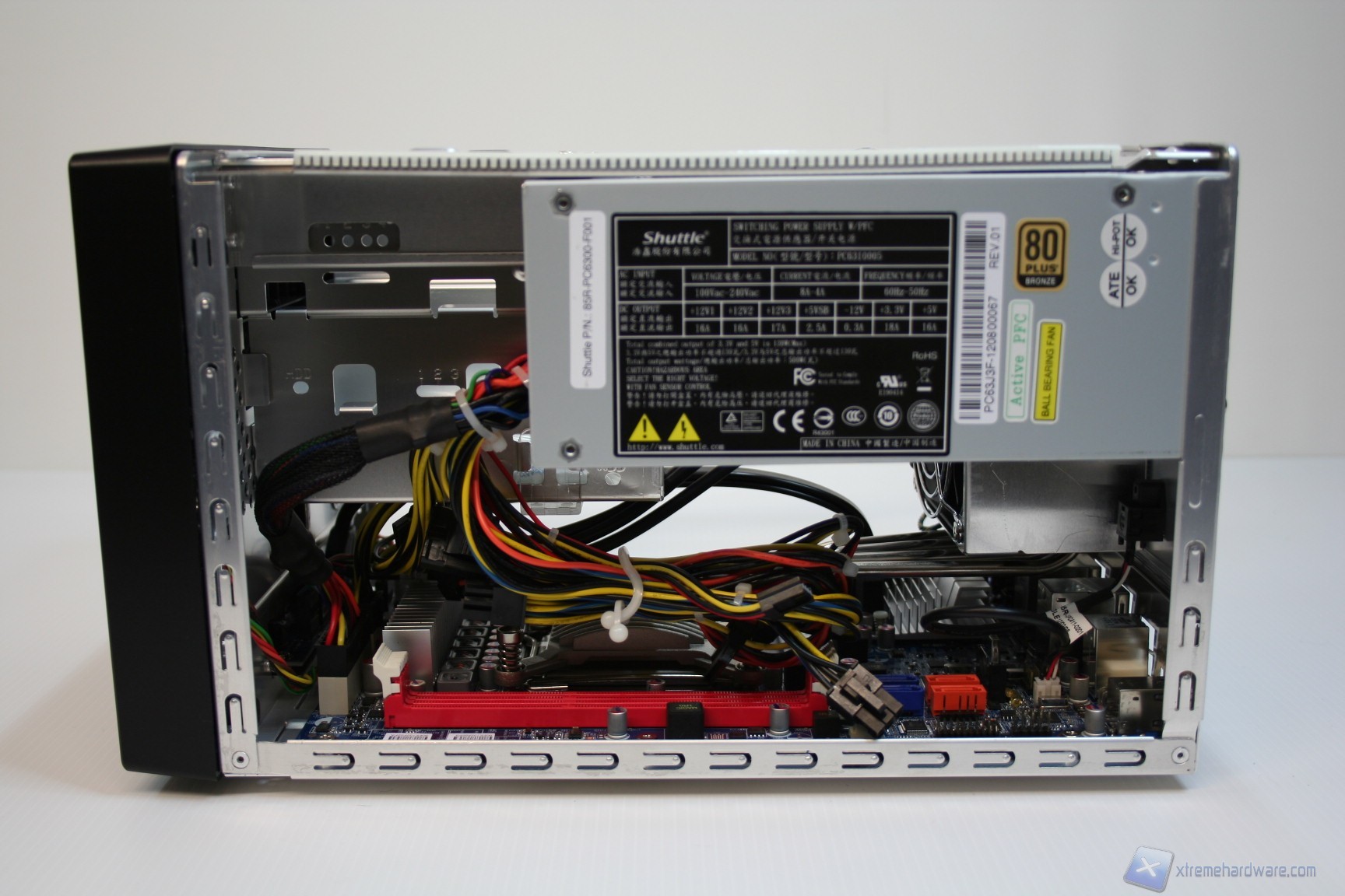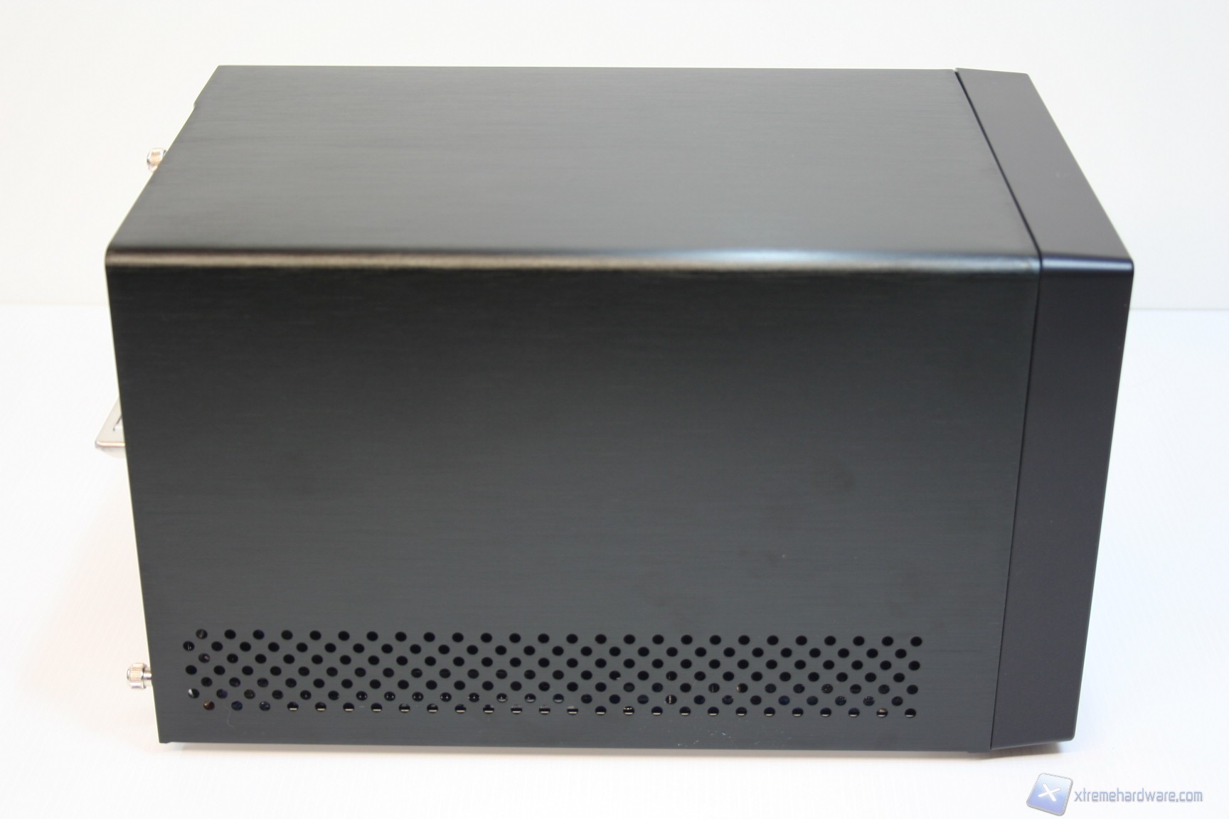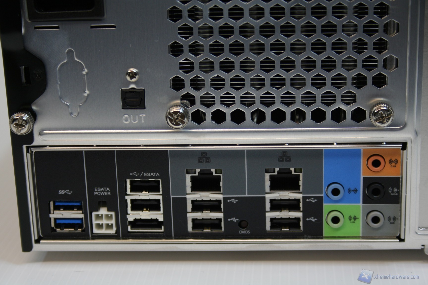 La parte superiore e quella laterale, sinistra e destra, sono un blocco unico di alluminio ed è possibile rimuoverle semplicemente tramite la rimozione di tre viti, nella parte posteriore. La parte inferiore invece presenta 4 piedini di materiale plastico che gli conferiscono stabilità e rigidezza evitando vibrazioni all’intero chassis. Posteriormente è presente la ventola da 50mm dell’alimentatore, l’ingresso del cavo di alimentazione, le feritoie di aerazione del dissipatore ed anche le connessioni della scheda madre. La solidità strutturale è ottima, come il layout e la pulizia delle finiture. Cosa interessante è che è presente anche un connettore eSATA di potenza, per alimentatore hard disk esterni, ma soprattutto un pulsante per resettare il CMOS del BIOS (ClearCMOS). E’ possibile anche osservare il seriale posteriormente, come si vede nella foto in questione.