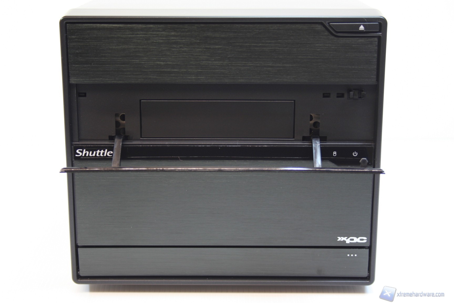 La parte frontale è molto elementare, pulita ed ordinata, con paratie a scomparsa. Presenta due porte USB 3.0 frontali (2x posteriori), due porte USB 2.0 (4x posteriori), un’entrata per il microfono ed una per le cuffie, con jack da 3.5’’. Nella parte superiore della paratia frontale è inoltre presente l’ingresso del lettore ottico, mascherato dietro uno sportellino a scomparsa assieme a quella per un’unità da 2.5’’. La pressione del pulsante ‘’eject’’ permetterà quindi la fuoriuscita del carrello di inserimento del lettore DVD, che poi verrà nascosto nuovamente a causa di un meccanismo a molle orizzontali. Precisiamo che sarebbe possibile installare un singolo bay hot swap, ma deve essere acquistato separatamente, per sfruttare il cage hard disk da 3.5 pollici. Nella parte centrale è presente una piccola finitura opaca con impresso il logo shuttle, nella parte sinistra, mentre nella parte destra sono presenti i LED Hard Disk e di accensione, il quale funziona anche da pulsante ON/OFF dell’unità.