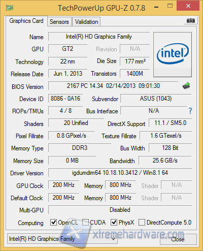 Vi Riportiamo inoltre gli screen di CPU-Z e di GPU-Z . Aprendo CPU-Z notiamo come il processore installato sia un Intel Core i5 4200U con una frequenza base di 1.6 GHz ed Turbo che arriva fino a 2.6 GHz, avente inoltre una cache di 3MB ed un TDP massimo di soli 15 Watt, ideale quindi per sistemi AIO o Notebook. Il Comparto RAM e` affidato a due banchi da 8GB l'uno per un totale di 16GB DDR3 CL11 marchiati Hyundai Electronics.