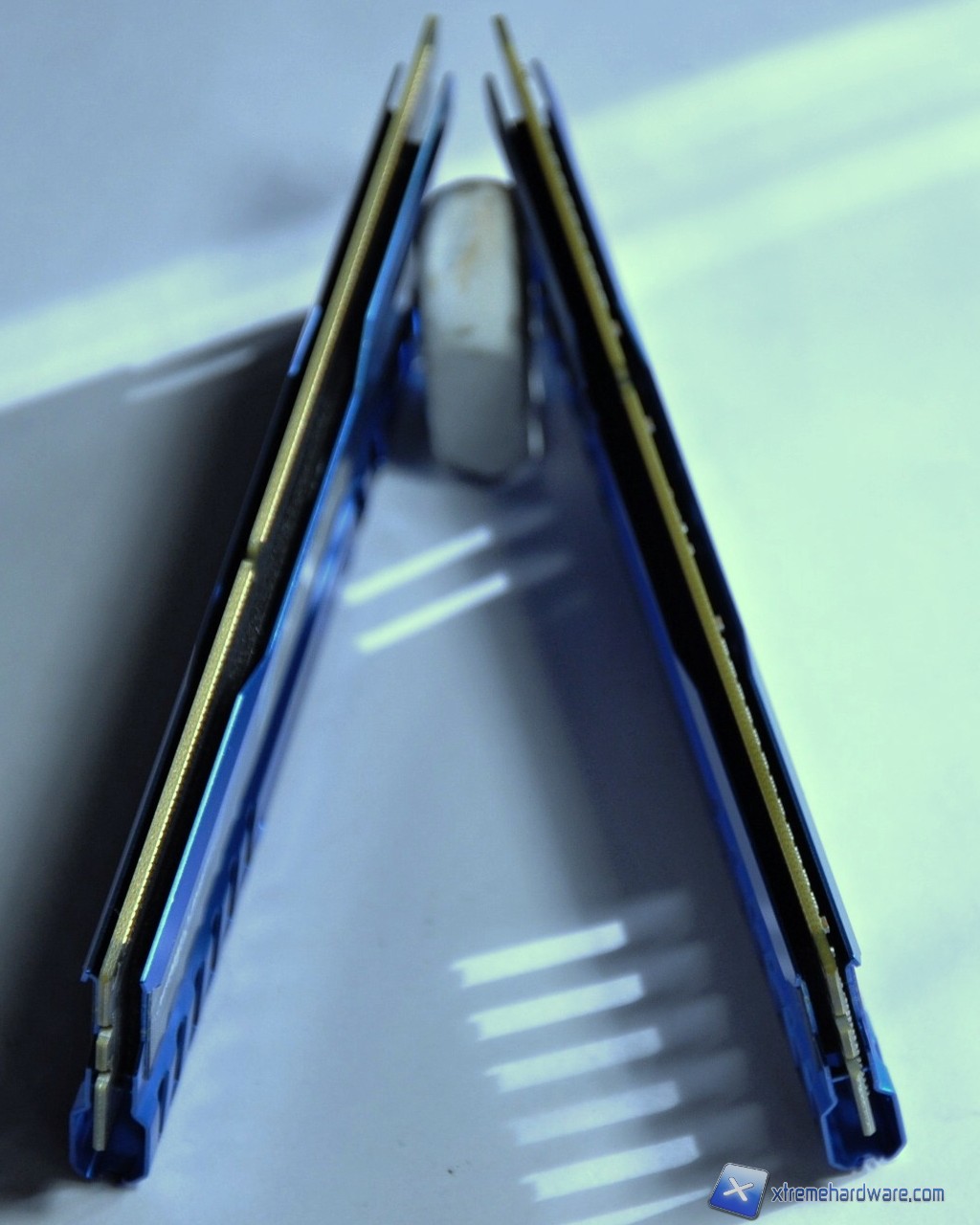 La confezione si presenta robusta e con una piacevole nonché utile finestra d’ispezione su entrambi i lati. Il colore primario sia della confezione che dei moduli è di un color azzurro metallizzato sfumato. Sulla parte frontale possiamo osservare, oltre alla sigla della sponsorizzazione dell’Official Intel Extreme Master, anche la dicitura Limited Edition. In basso la sigla della certificazione Intel XMP. Il riquadro al centro restituisce l’immediata informazione sulla capacità dei moduli nonché la frequenza operativa.