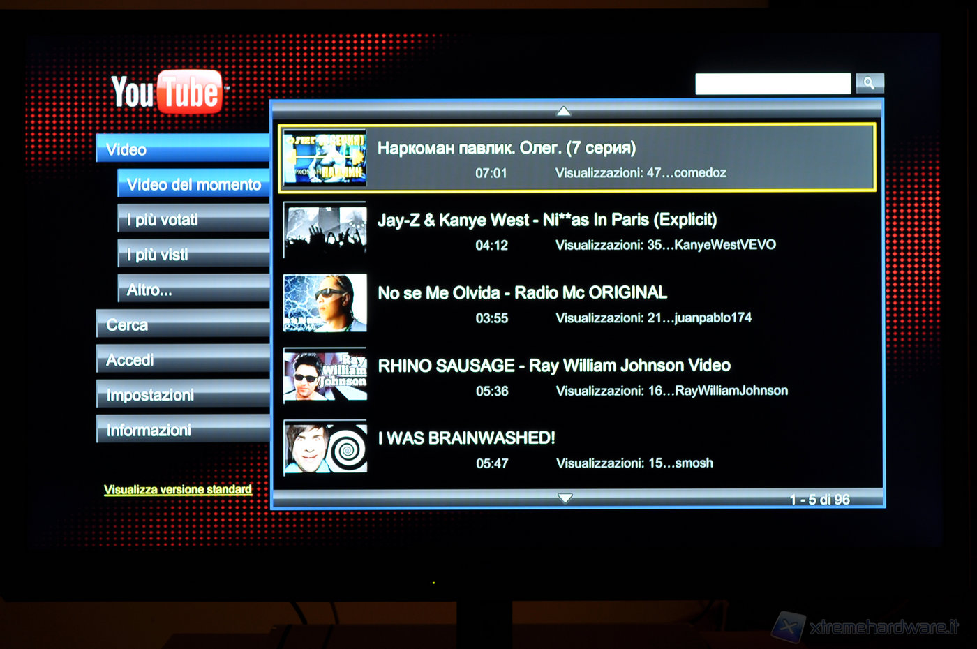 Ecco un’indispensabile applicazione per passare un po’ di tempo in compagnia degli amici! Accedere a YouTube è estremamente facile. Selezionando l’apposita icona in Internet media verrà caricata una schermata coni i video più visti del momento. In alto un campo di ricerca in cui potremo digitare la nostra parola chiave. Questa operazione potrebbe essere un po’ laboriosa, scrivere con il telecomando è infatti un’operazione un po’ lenta. RaidSonic ha adottato una tastiera su schermo tra cui ci possiamo muovere attraverso i tasti freccia del telecomando, selezionando la lettera corrispondente con Ok. In basso alcune shortcut per cancellare e per accedere a funzionalità speciali. Sulla destra troviamo invece la cronologia di ricerca, cosa che ci permette di risparmiare molto tempo se la parola da cercare è presente in quell’elenco.
