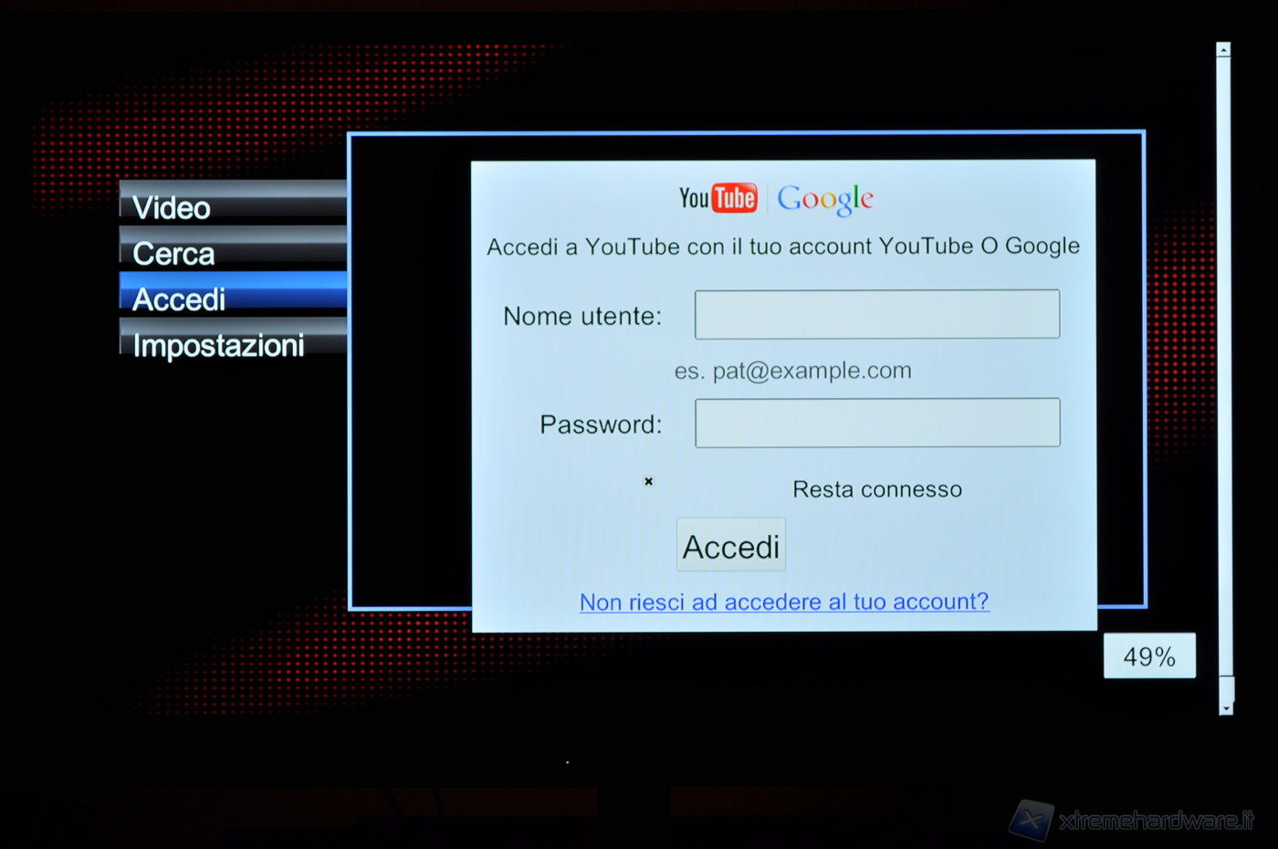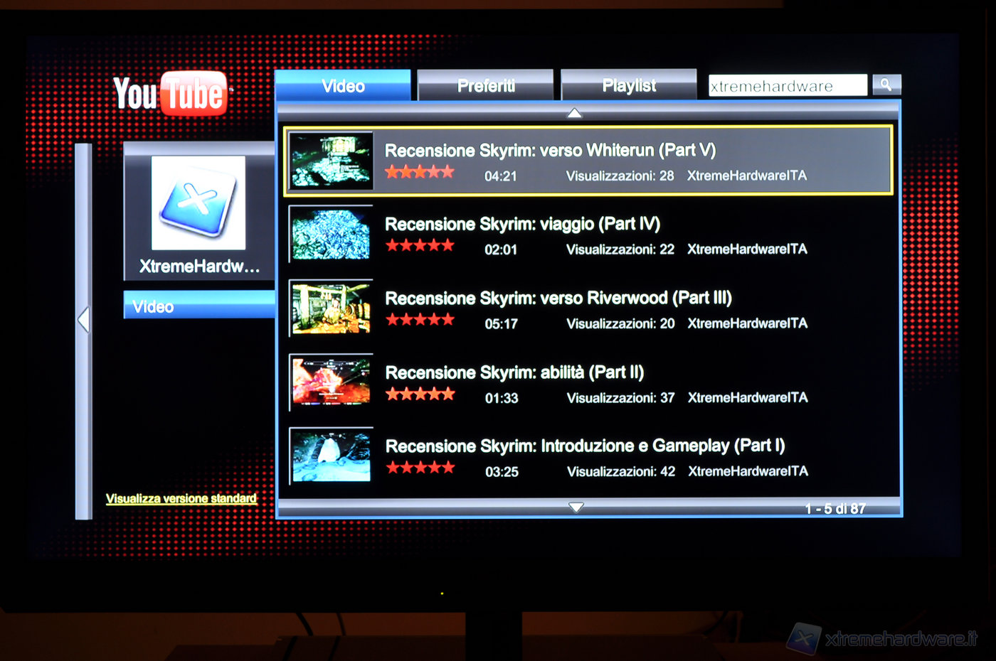 L’applicazione YouTube si presenta in modo simile alla versione per computer: sulla sinistra sono infatti presenti durante la riproduzione i video correlati. Attraverso il tasto zoom potremmo attivare la modalità schermo intero, da cui si potrà uscire attraverso il tasto back. La riproduzione è ovviamente fluidissima e il caricamento abbastanza rapido. Abbiamo riscontrato dei blocchi sistematici al primo accesso a questa applicazione, in questo caso sarà sufficiente tornare al menù precedente con il tasto back e selezionare di nuovo l’applicazione YouTube; un bug che probabilmente sarà risolto dai prossimi aggiornamenti del firmware.