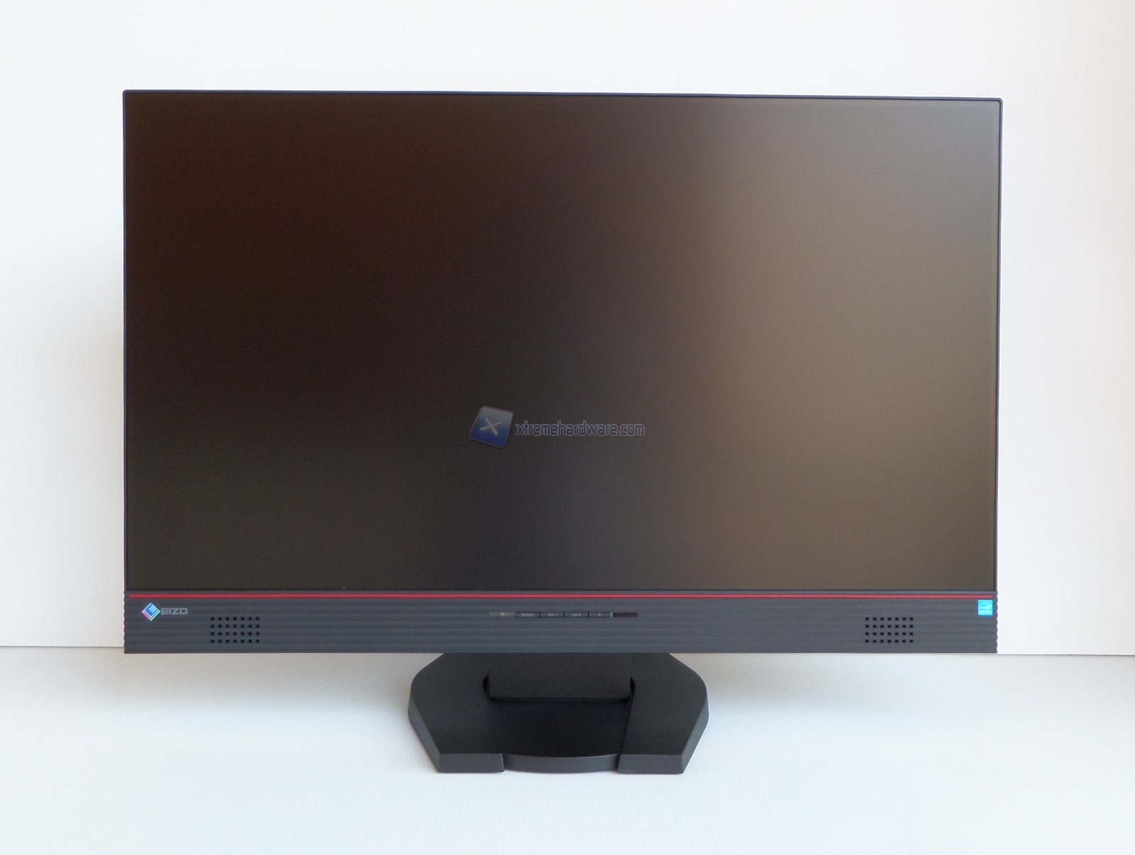 Ogni volta che si ha davanti un monitor EIZO si ha sempre la solita impressione di solidità e l’FS2434 non è da meno. Partendo dal display, si ha a che fare un rivestimento anti-glare classico, tipico degli IPS, quindi non una versione semi-glossy simile ai modelli VA. La barra in basso è piuttosto ampia, misurando circa 4 cm, ma oltre ai controller centrali, qui trovano posto due speaker audio ai lati. Nonostante la barra rossa, che era presente anche in altri modelli della serie FS (e in diversi colori), il tema della trama rimane differente e non presenta inclinature come nei precedenti FORIS FS. La parte però su cui ha puntato EIZO sono le altre cornici. Metro alla mano, misuriamo proprio 6 mm per i lati laterali e quello superiore, rendendo così il monitor davvero adatto a soluzioni multi-display.