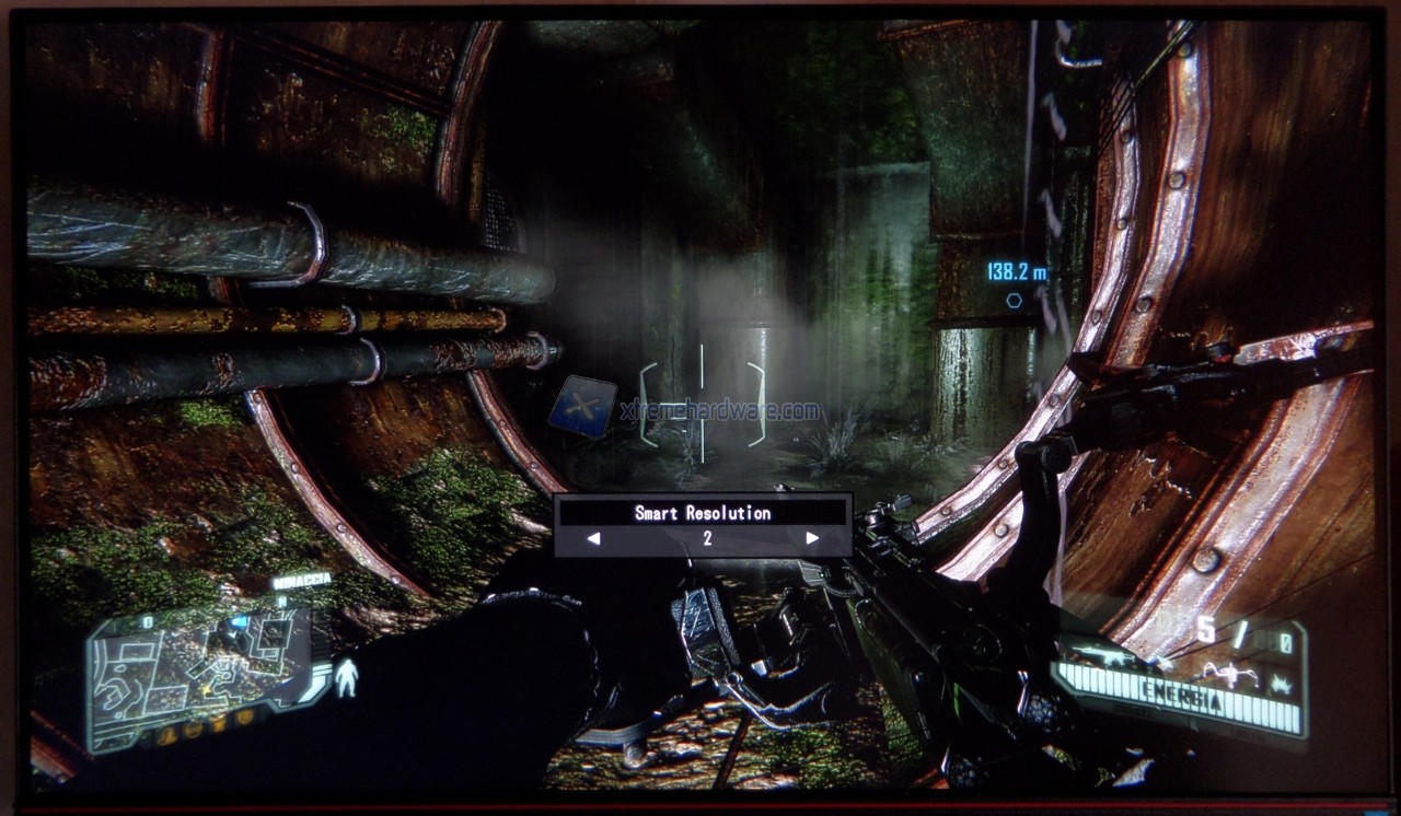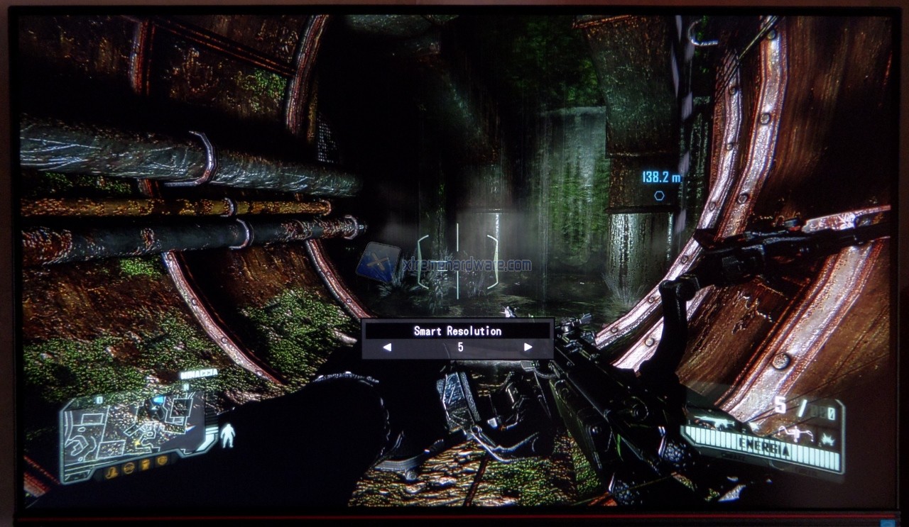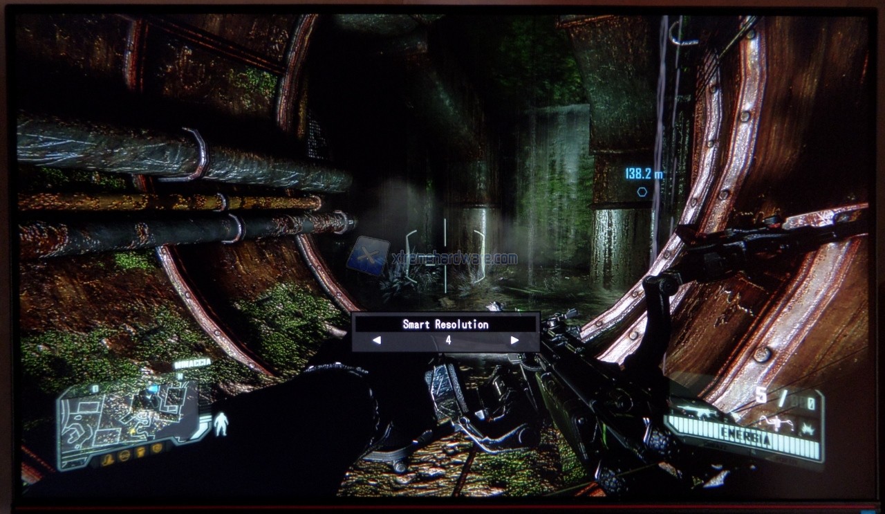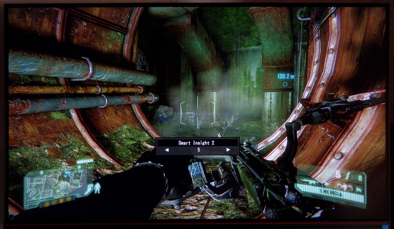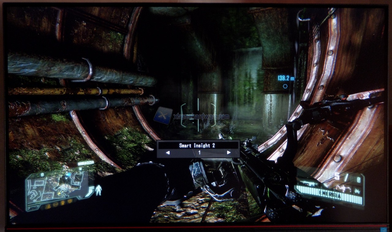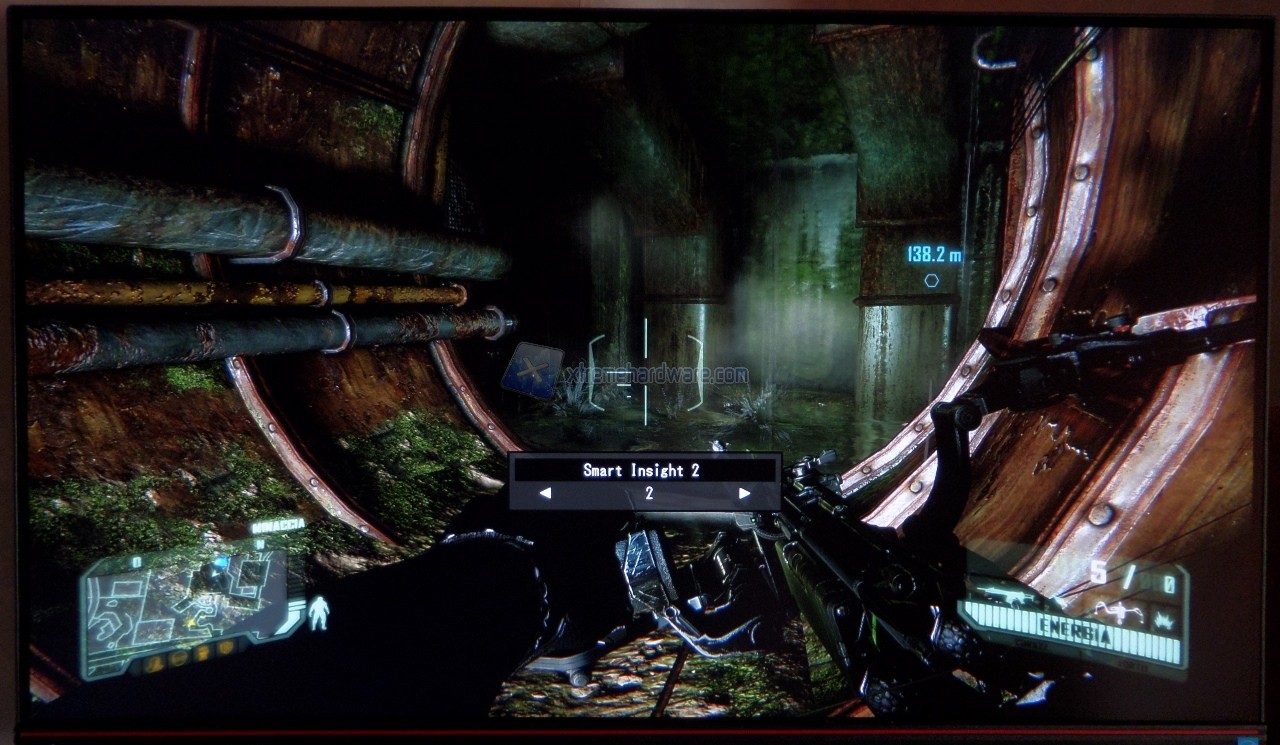 La struttura è molto solida e il display non tende a oscillare quando ci si agita un po' durante sessioni di gaming frenetico. Dal test di reattività mostrato prima, abbiamo visto che il setting di overdrive Standard è quello meglio bilanciato e l’esperienza di gioco è risultata davvero piacevole. Le due modalità colore indicate per il gioco, Game (Dark scene) e Game (Light scene), vanno a migliorare la visione per le due rispettive visioni. Come si può vedere dalle immagini che seguono, i colori appaiono sovrassaturi, ma alcune zone scure vengono mostrare con maggiore chiarezza rispetto alla modalità User. Per la medesima scena del gioco Crysis 3 abbiamo anche mostrato come variano la riproduzione le due funzioni Smart Insight 2 e Smart Resolution. La prima pemette di schiarire le aree scarsamente luminate, come ad esempio la parte terminale del condotto che risulta quasi completamente buia quando Smart Insight 2 è disattivato. I valori centrali del setting sembrano bilanciare questo effetto senza snaturare troppo la tonalità. Smart Resolution restituisce contorni ben più definiti senza effetto sfocatura, ma un valore elevato rende il tutto un po' troppo artificioso.