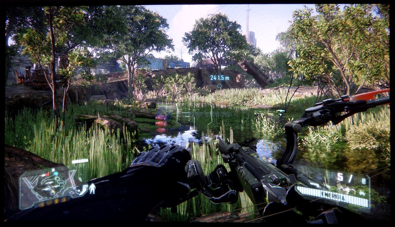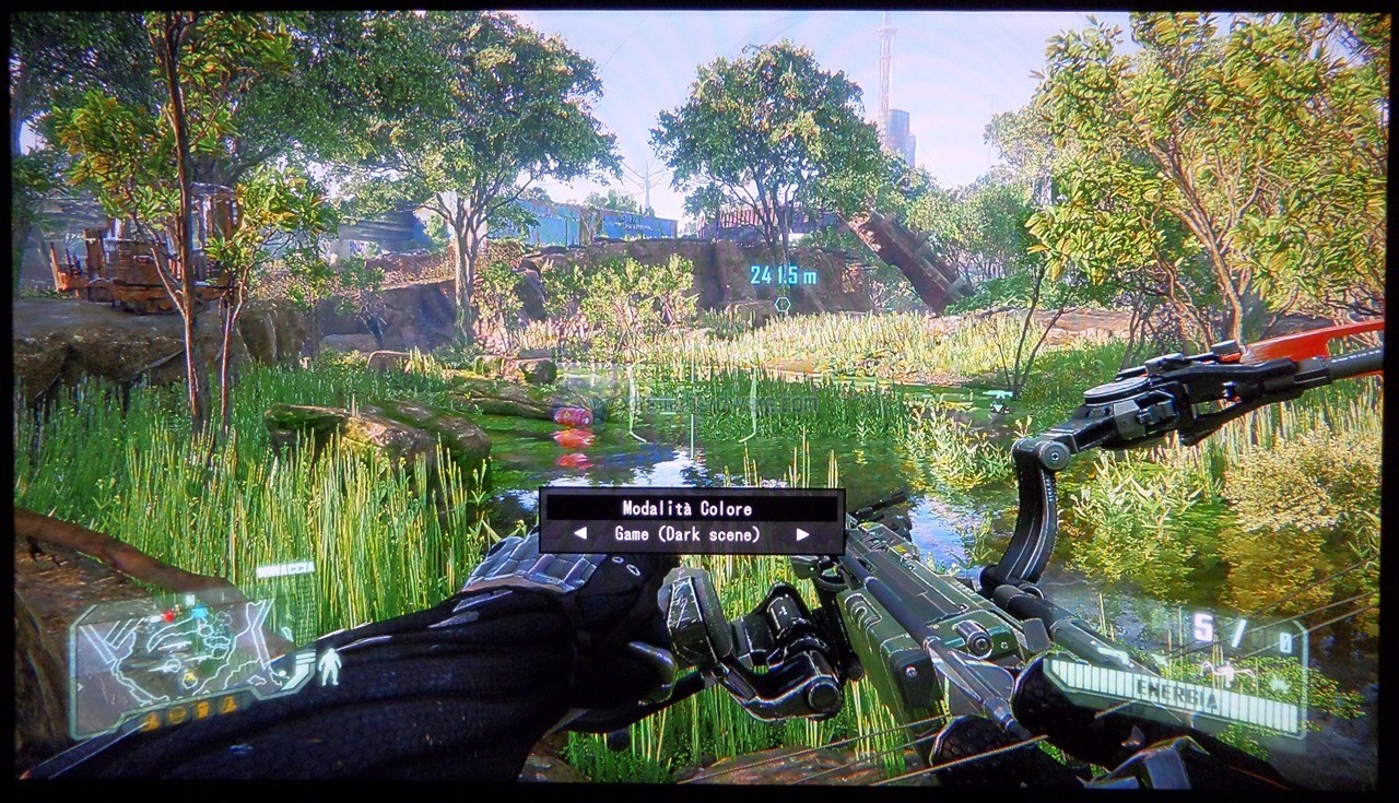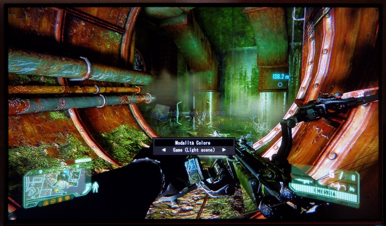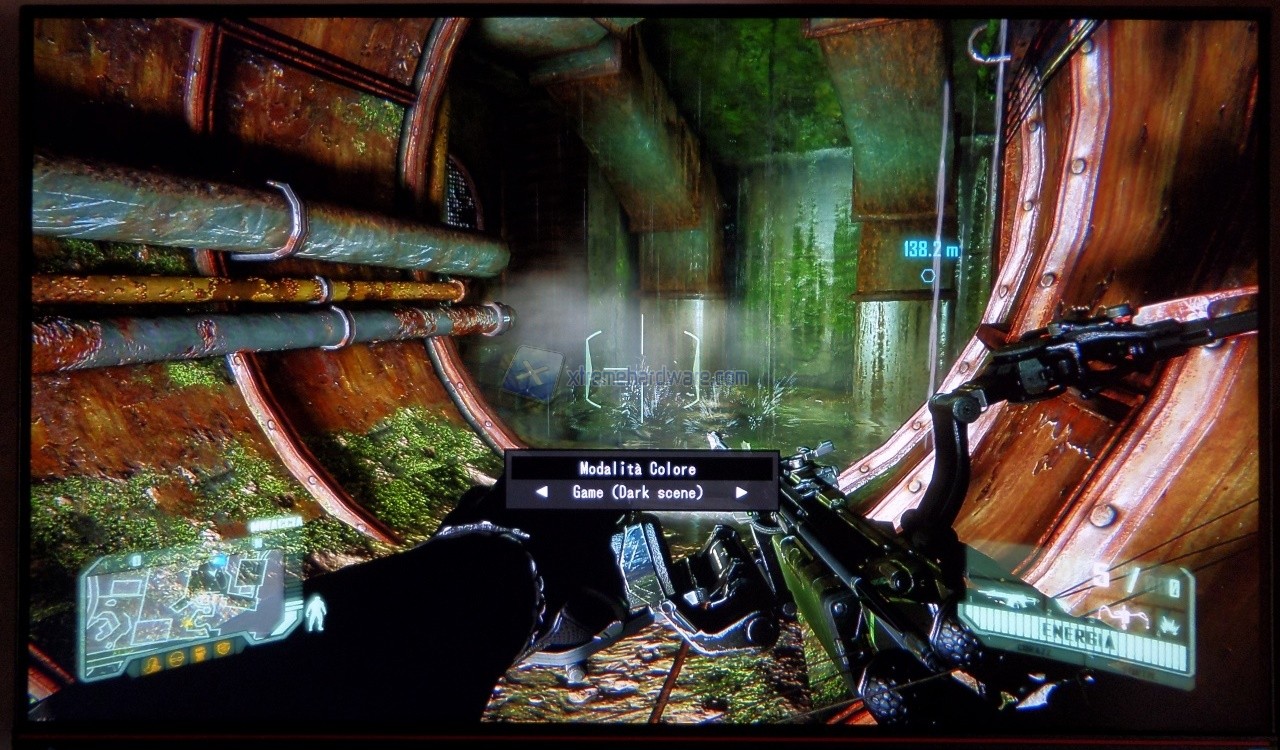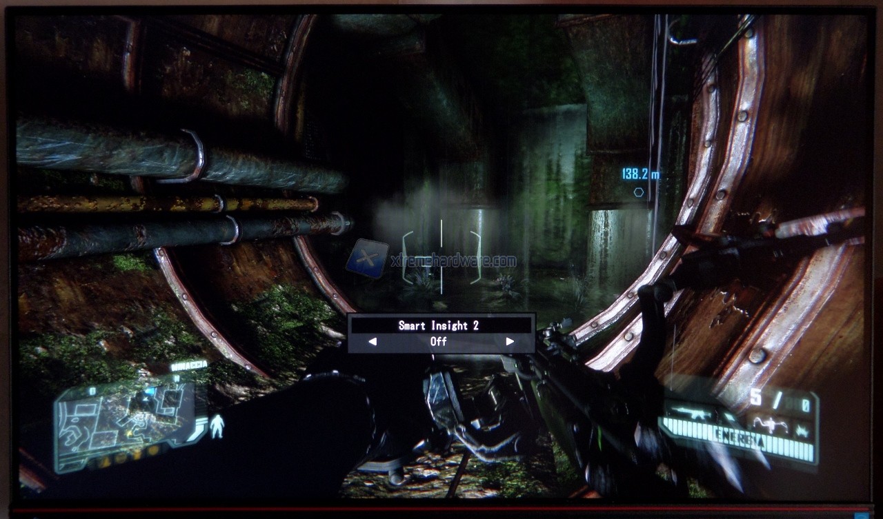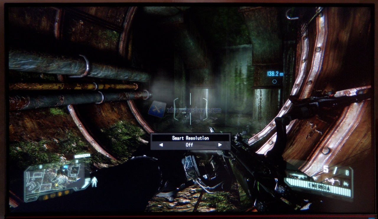 La struttura è molto solida e il display non tende a oscillare quando ci si agita un po' durante sessioni di gaming frenetico. Dal test di reattività mostrato prima, abbiamo visto che il setting di overdrive Standard è quello meglio bilanciato e l’esperienza di gioco è risultata davvero piacevole. Le due modalità colore indicate per il gioco, Game (Dark scene) e Game (Light scene), vanno a migliorare la visione per le due rispettive visioni. Come si può vedere dalle immagini che seguono, i colori appaiono sovrassaturi, ma alcune zone scure vengono mostrare con maggiore chiarezza rispetto alla modalità User. Per la medesima scena del gioco Crysis 3 abbiamo anche mostrato come variano la riproduzione le due funzioni Smart Insight 2 e Smart Resolution. La prima pemette di schiarire le aree scarsamente luminate, come ad esempio la parte terminale del condotto che risulta quasi completamente buia quando Smart Insight 2 è disattivato. I valori centrali del setting sembrano bilanciare questo effetto senza snaturare troppo la tonalità. Smart Resolution restituisce contorni ben più definiti senza effetto sfocatura, ma un valore elevato rende il tutto un po' troppo artificioso.