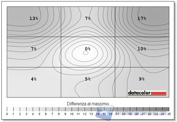 Suddividendo lo schermo in nove rettangoli, abbiamo misurato con il colorimetro l’uniformità della luminosità e dei colori. La differenza massima registrata è risultata pari al 17%, con una media dell’8%, per quanto riguarda la luminosità, mentre per il colore, il Delta-E maggiore è stato di 1,4, con una media dello 0,8.