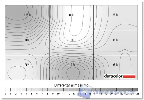 Suddividendo lo schermo in nove rettangoli, abbiamo misurato con il colorimetro l’uniformità della luminosità e dei colori. La differenza massima registrata è risultata pari al 15%, con una media del 6,4%, per quanto riguarda la luminosità, mentre per il colore, il Delta-E maggiore è stato di 1,9, con una media dello 0,8.