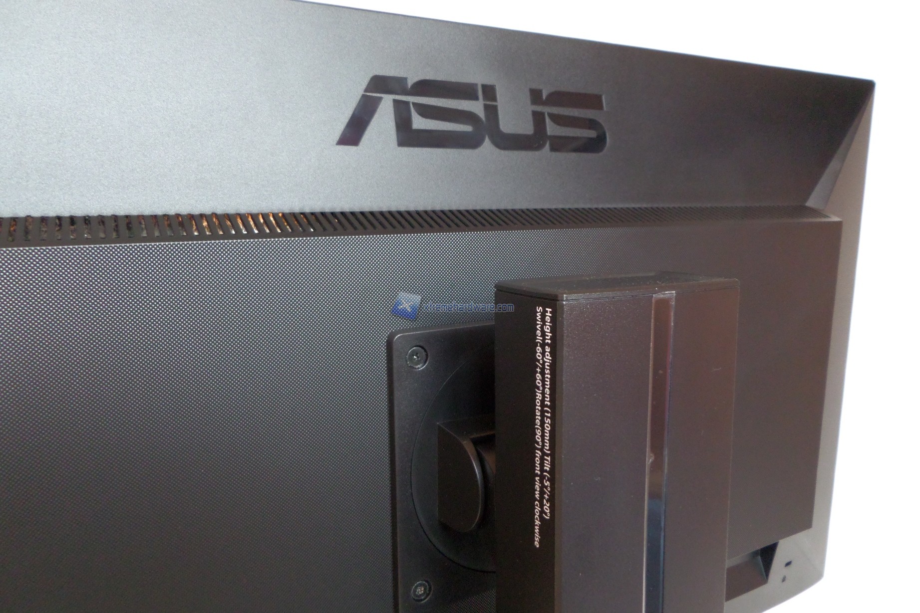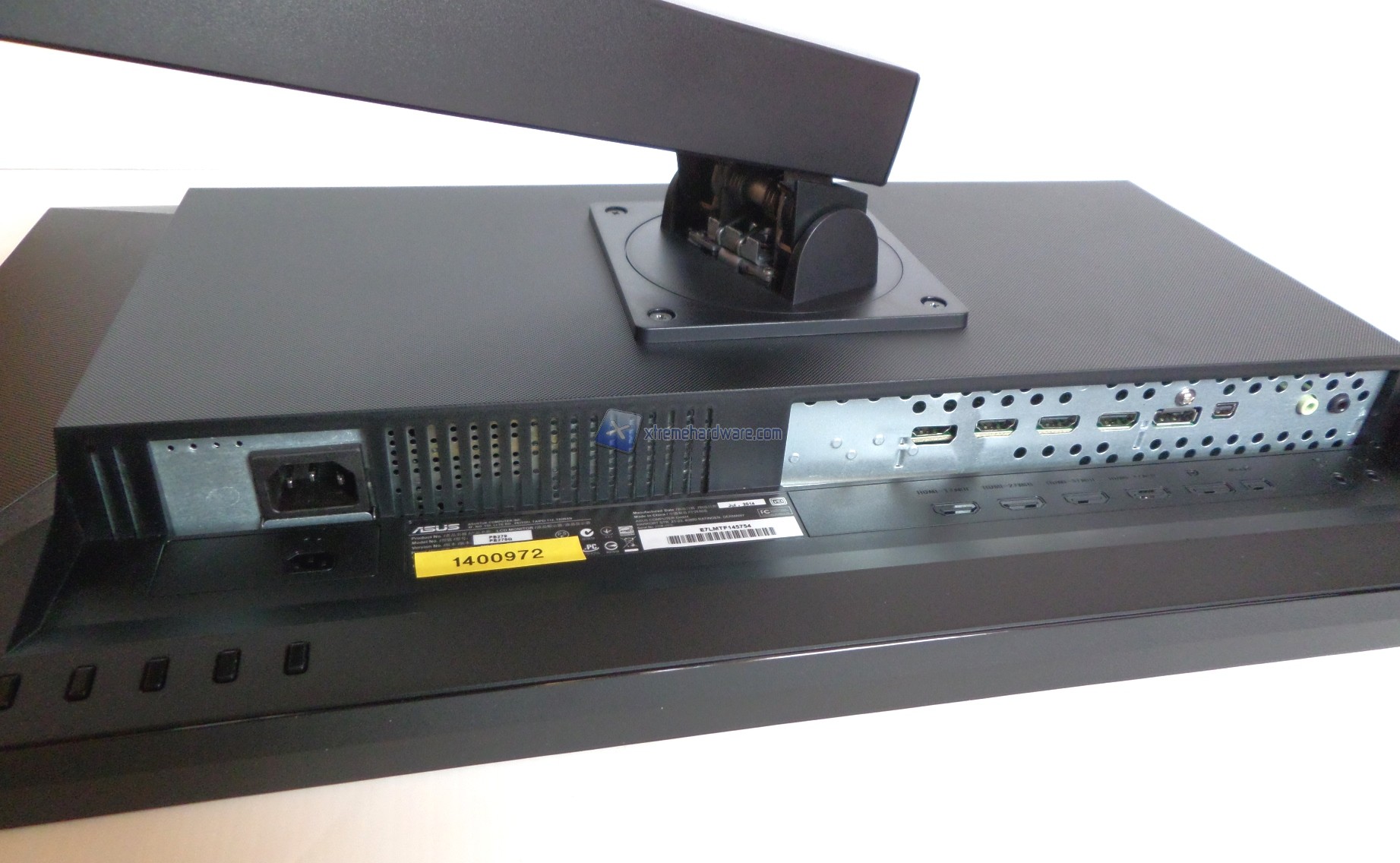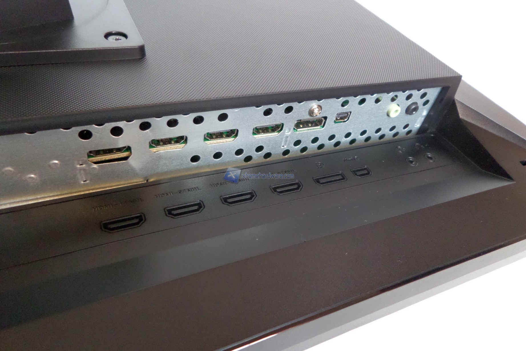 Lateralmente non sono presenti porte di connessione ed è davvero strano non trovare un hub USB per un monitor di questo livello e tipologia. Andiamo allora a dare un’occhiata alle spalle del monitor; "ehi, che ti aspettavi?" cit. Qui troviamo sia una trama liscia che particolareggiata ed è facilmente riscontrabile la presenza dei fori VESA 100x100 mm occupati dal braccio di regolazione. Sul sostegno sono presenti dei fori per poter inserire il raccoglitore cavi di plastica. Nella parte inferiore, a sinistra, si trova il connettore di alimentazione, mentre nell’altro lato troviamo ben quattro porte HDMI / MHL in versione 1.4, una DisplayPort 1.2 (non supporta l’Adaptive Sync), una mini DisplayPort e le connessioni audio per la linea di ingresso e l’uscita cuffie. Il monitor è dotato di due speaker audio da 2W ciascuno.