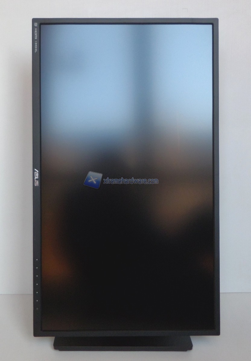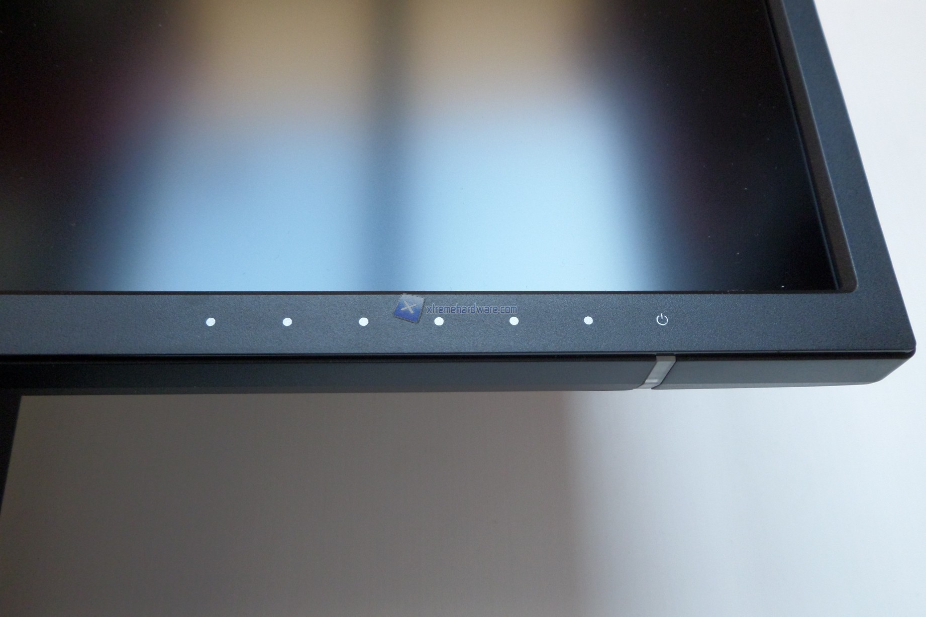 Frontalmente vengono riportati sei puntini indicanti gli appositi pulsanti posteriori per gestire il menù OSD dell’ASUS PB279Q; sono proprio dei puntini e non vi è un sistema di retroilluminazione. A questi tasti ovviamente si affianca il pulsante di alimentazione che presenta un rilievo differente per non confondersi durante la regolazione del menù; una bella chicca, visto che la distanza tra i pulsanti è la stessa e risultarebbe facile spegnere il monitor invece di accedere al menù. Sotto l’icona di alimentazione è presente il LED di stato; questo rimane acceso con una fioca luce bianca in condizioni operative e arancione in stand-by. Trovandosi orientato verso il basso non dà mai fastidio durante l’utilizzo, neanche in una stanza completamente buia. È possibile comunque disattivare il LED nel menù OSD (Impostazioni di sistema -> Indicatore alimentazione).