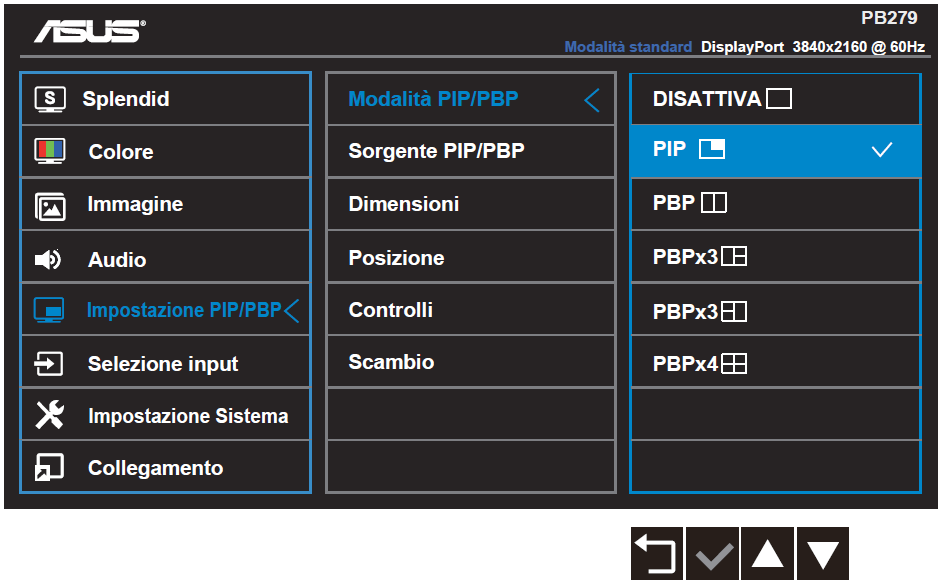 Dopo la regolazione e scelta della sorgente dell’audio si arriva al menù delle funzioni PiP e PbP: queste impostazioni sono state curate molto bene da ASUS. La modalità PiP (Picture in Picture) permette di regolare la grandezza della sorgente secondaria su Piccolo, Medio e Grande, oltre ovviamente a sceglierne il posizionamento in uno dei quattro angoli del monitor. La funzione PbP (Picture by Picture) permette invece la riproduzione contemporanea di quattro ingressi video, senza alcuna restrizione sulla scelta delle porte video. Queste poi potranno essere posizionate come indicato in figura.