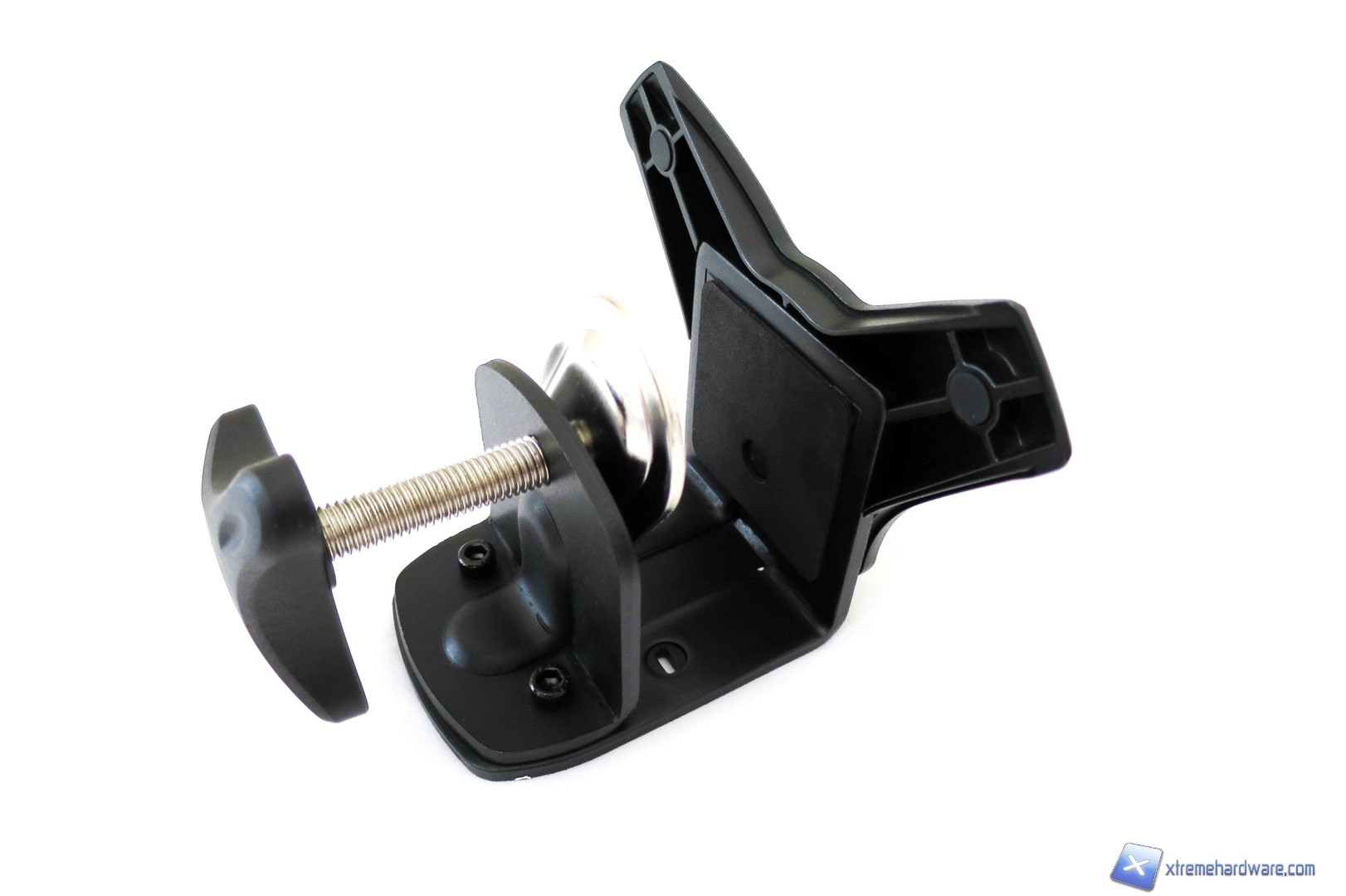 Se non siete pratici o non avete mai assemblato uno stand per monitor vi consigliamo di consultare il piccolo manuale in dotazione con il bundle. Pur essendo l’assemblaggio abbastanza intuitivo, procediamo con una piccola descrizione dei componenti e con il relativo ”montaggio guidato”. Come prima cosa, estratti i componenti, troviamo una colorazione nera opaca per ogni singolo pezzo dalla base sino ai bracci. La qualità dei componenti è assicurata da una realizzazione in metallo e finemente curata come SilverStone fa anche con i propri case ed alimentatori. Partiamo ora dalla base che è dotata di due “artigli” ed ha una forma quasi triangolare con al centro nella parte superiore il foro filettato per avvitare successivamente il primo supporto. Nella parte inferiore la base presenta una superficie in gomma/tessuto in modo tale da evitare di graffiare o danneggiare il piano dove andrà successivamente fissata. Con la base viene fornita anche la staffa con perno in metallo e basetta che dovrà essere innanzitutto avvitata al supporto della base se successivamente avvitata al piano dove dovremo collegarla, ruotando la maniglia con rivestimento in plastica.
