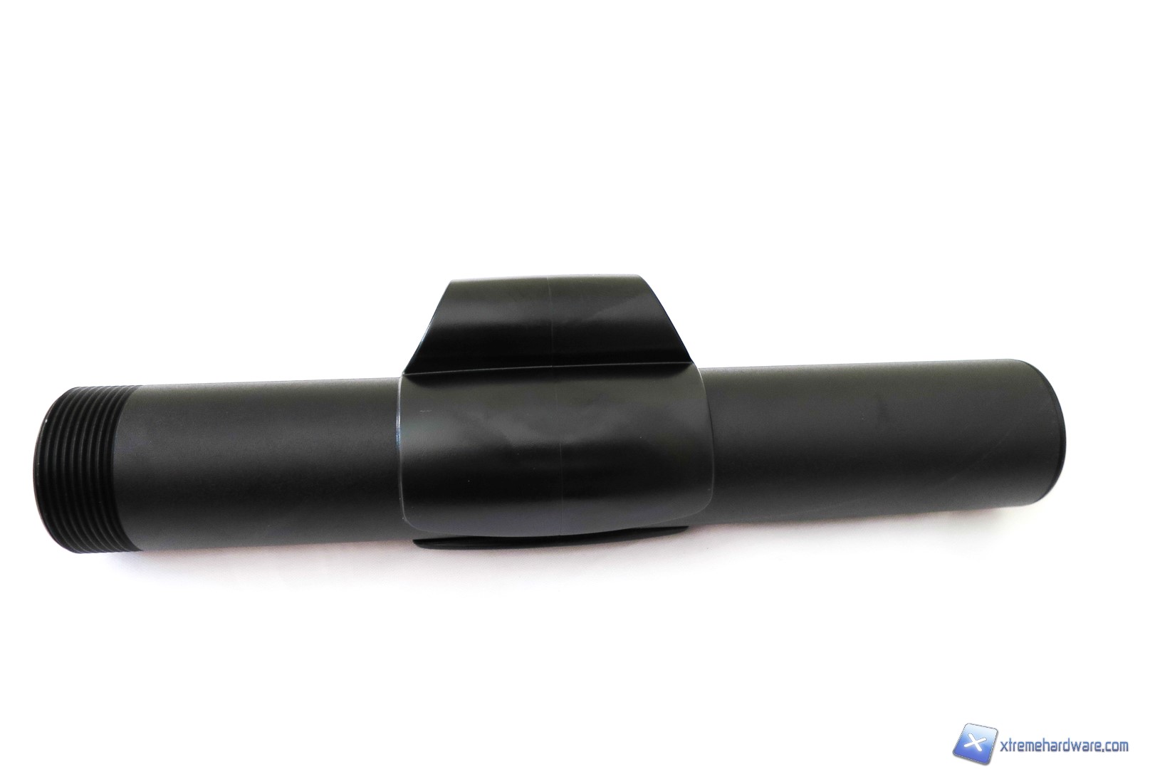 Passiamo ora a dare uno sguardo ai due bracci in metallo. Prima di fare ciò, ricordiamo che a seconda della collocazione e di un eventuale raggio dello stand potremo scegliere se ampliarlo con entrambi i bracci o utilizzare solo quello principale con la scritta SilverStone ed il passacavi. Detto ciò, prendiamo il primo dei due bracci, che nel dettaglio ha una forma che tende ovviamente verso l’alto. Anche questo braccio ha un passacavi ma è offerto dalla struttura stessa del braccio. Se da un lato troviamo il perno in metallo che ci servirà per aggiungere il secondo braccio, dall’altro abbiamo il foro con un una guarnizione in plastica che verrà bloccata da un dado posto a lato del braccio.