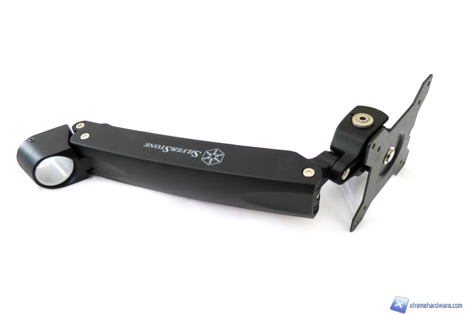 Passiamo ora al braccio principale del SilverStone ARM11BC. Tale braccio, non solo è più grande ma è anche più pesante in quanto al suo interno è presente una molla che servirà come estensore in lunghezza e come fermo una volta trovata l’angolazione. Non manca inoltre il supporto VESA in metallo presente all’estremità destra del braccio. Come abbiamo detto, questo è il braccio principale e potrà essere montato direttamente sul supporto della base. Nel caso in cui volessimo ampliare la lunghezza massima dello stand dovremo utilizzare entrambi i bracci che potranno essere regolati come abbiamo visto dalle immagini nel capitolo Specifiche Tecniche. Il braccio integra inoltre un supporto in plastica lungo il suo corpo per effettuare un cablaggio utile a risparmiare spazio ed evitare l’aggrovigliamento di cavi. L’intero sistema di montaggio e tenuta dello stand di SilverStone è attuabile tramite semplici dadi e viti di dimensioni compatte che potranno tenere facilmente un monitor con supporto VESA 75/100 e peso complessivo di 10Kg. Non sarà dunque un problema montare un monitor anche da 27 o più pollici, a patto che sia compatibile con lo standard VESA.