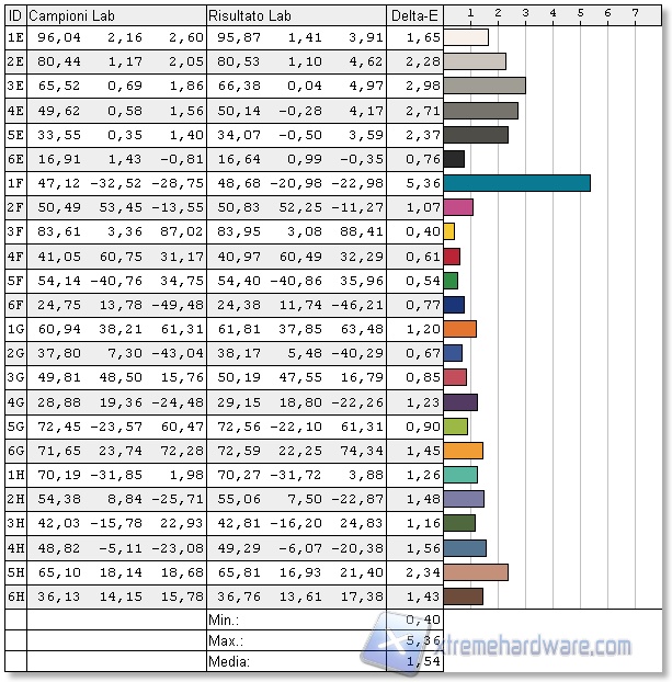 La fedeltà cromatica nelle condizioni out-of-box risulta buona, con un Delta-E medio di 1,54.