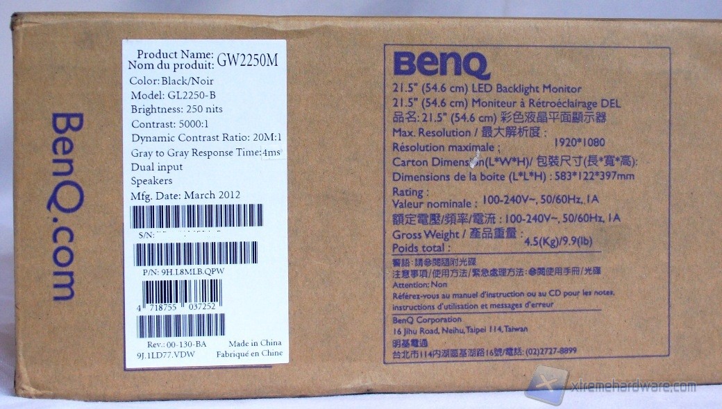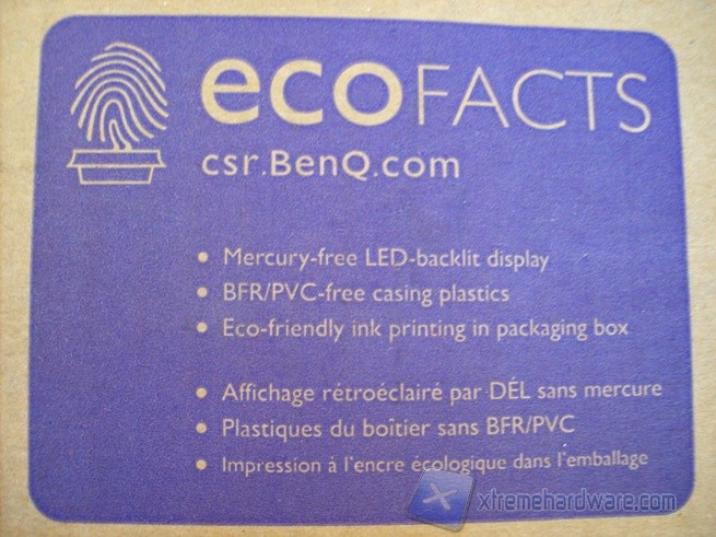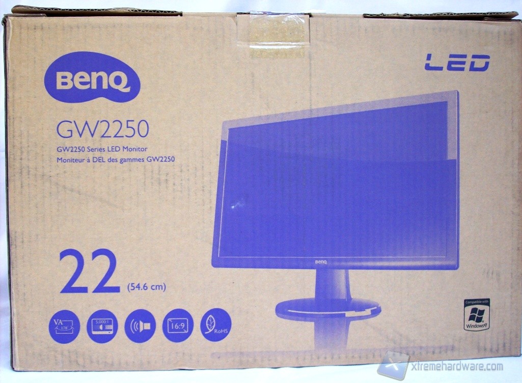 Con il GW2250 impresso sulla scatola, BenQ indica la terna di monitor appartenenti alla serie GW dalle dimensioni di 21,5” e sul lato, un apposito adesivo cita il nome esatto del prodotto contenuto, con l’aggiunta di alcune specifiche tecniche. Nella parte superiore viene inoltre riportata l’etichetta EcoFACTS in lingua inglese e francese.