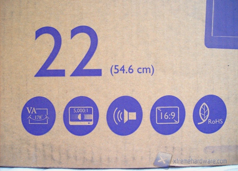 La scatola del BenQ GW2250M è molto semplice e restituisce le basilari informazioni senza entrare nel dettaglio. I cinque simboli presenti nell’angolo indicano che il pannello VA permette la visione fino ad un’angolazione di 178°, che il contrasto arriva a 5.000:1, la presenza degli speaker, il rapporto 16:9 e la certificazione RoHS.