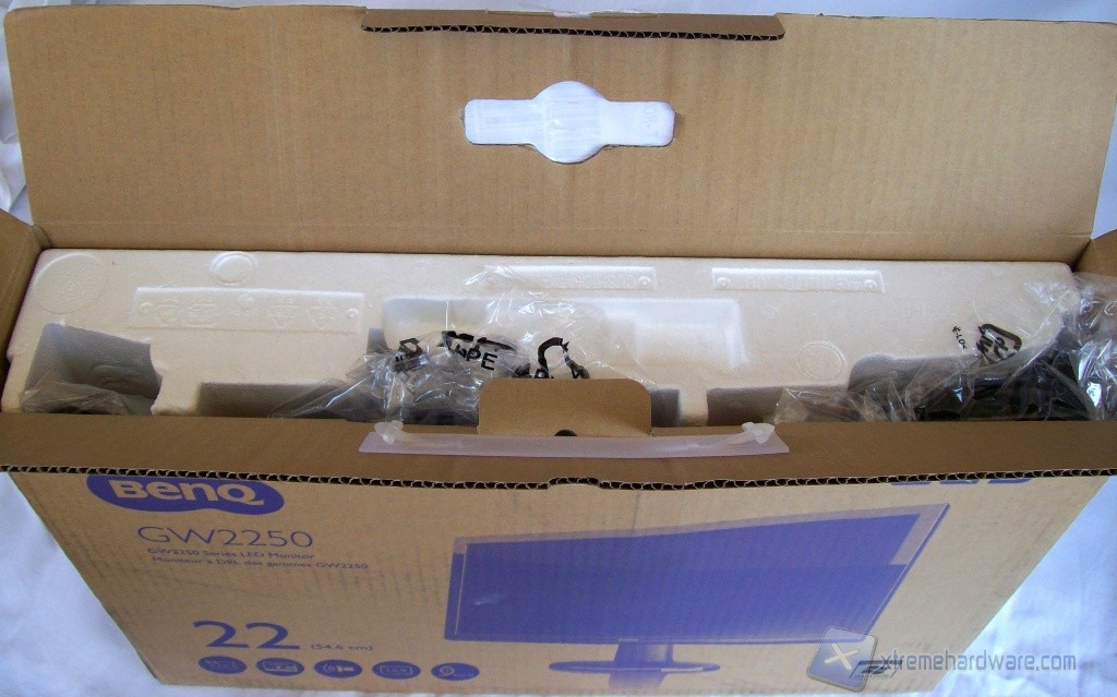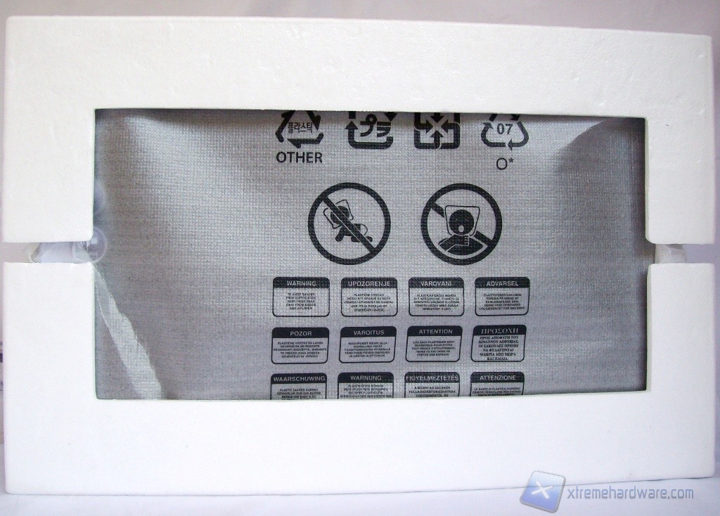 Tutto il monitor è avvolto da una busta in plastica che protegge il display dalla polvere e da graffi, mentre i due blocchi in polistirene espanso lo assicurano dai possibili urti durante il trasporto.