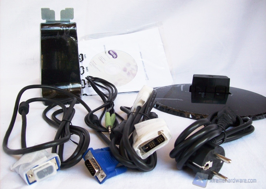 All’apertura della scatola si possono estrarre subito gli accessori forniti in dotazione, quali un cavo DVI-D SL, un cavo audio jack da 3,5 mm, un cavo di alimentazione, i due accessori per il montaggio della base e una bustina contenente un CD, una guida rapida e un talloncino per la garanzia. All’interno troveremo poi un cavo D-Sub già collegato al monitor stesso.