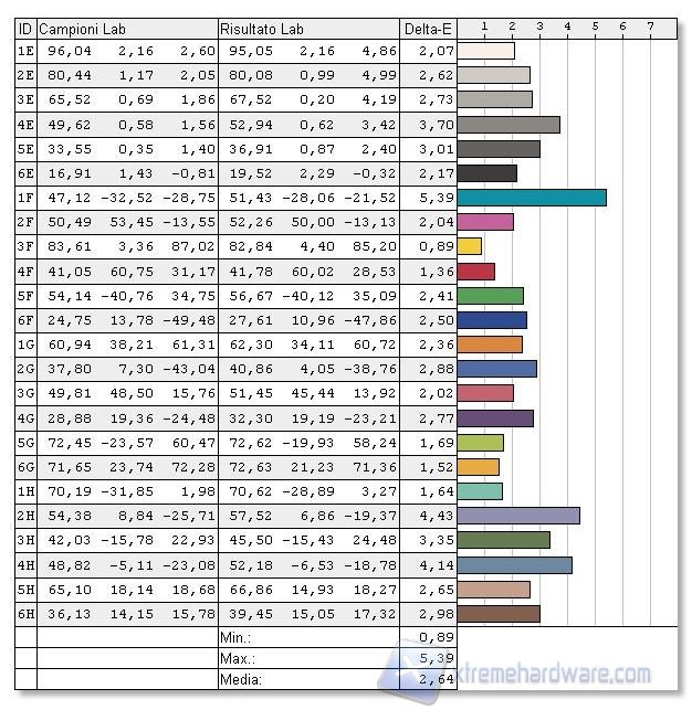 La fedeltà cromatica nelle condizioni out-of-box risulta sufficiente, con un Delta-E medio di 2,64.