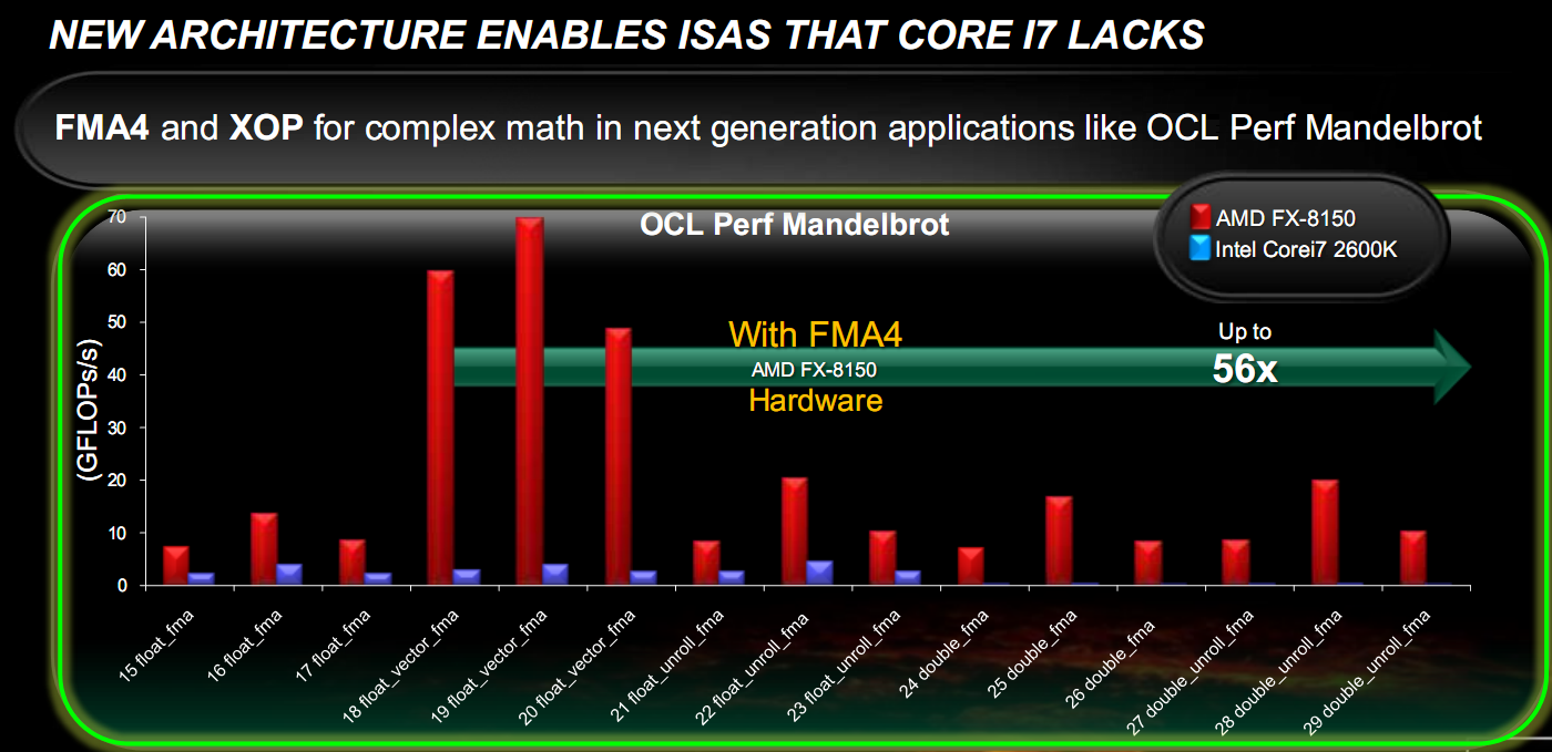 AMD è finalmente al passo con i set di istruzioni Intel ed anzi implementa un suo set di istruzioni, lo XOP e le FMA4, che implementano il FMA a 4 vie (Fused Multiply Accumulate a 4 vie, ossia il calcolo della formula d=a+b*c, contrariamente al FMA 3 che calcola la formula a=a+b*c, distruggendo uno dei registri e richiedendone il salvataggio, qualora servisse il suo contenuto), che consente di ottenere grandi vantaggi in codice ottimizzato: