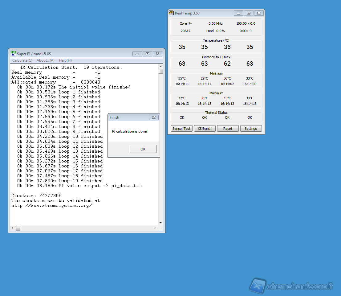 Abbiamo quindi raggiunto i 4,6GHz in modalità Turbo utilizzando una tensione di 1,28V; è un ottimo risultato considerando anche il fatto che, grazie al cambiamento di frequenza e di voltaggio, durante le sessioni idle, le temperature ed i consumi si mantengono su valori bassi. Abbiamo quindi effettuato un piccolo test utilizzando SuperPì 1M.