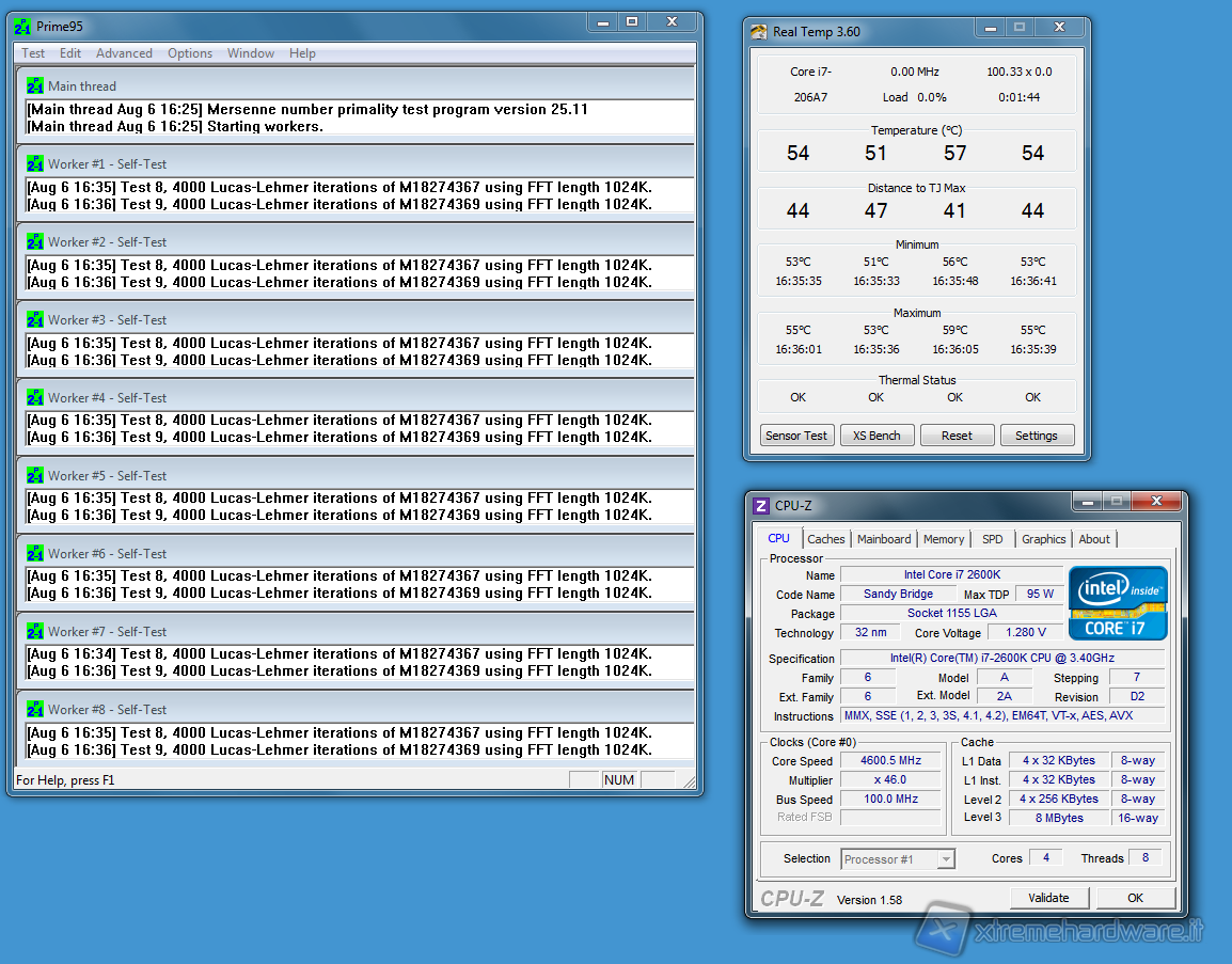 Abbiamo infine effettuato dei test in overclock andando a variare i parametri all'interno del BIOS. Siamo rimasti un pochino delusi dalla libertà offerta dato che non c'è stato possibile variare il moltiplicatore ed i voltaggi a piacimento in quanto è prevista solo la variazione del moltiplicatore della modalità Turbo e dell'offsett del voltaggio dato in automatico dalla scheda madre. Tuttavia, impostando il moltiplicatore della modalità Turbo a 46X e l'offsett del voltaggio della CPU a +0,06, siamo riusciti a far partire il sistema a 3,4GHz con Turbo a 4,6GHz. Per constatare tale clock, abbiamo stressato il sistema con il software Prime95, tenendo aperto CPU-Z per rilevare la massima frequenza raggiunta con il relativo voltaggio.